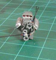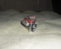 Not sure of the original setup, but I picked up a Hot Rod mag branded long nosed Mustang flopper about a month ago from Hobby Lobby during a sale. It's either MPC or Monogram, but I've heard it's basically the same underneath as the Kallita reissue.White molded body and black molded parts to allow beginner to glue & go if desired, but I pulled the major pieces from the kit and sprayed primer for easier re-painting. Swore I wouldn't go detail crazy, but this 1/8th collector's hemi in it's display box changed my mind in a hurry. So what in the world can I fabricate cheaply for a 1/25 flopper that still looks good? Well, here's a start: ditch all the chrome dipped engine parts and come up with color schemes that represent real colored castings, a little braided wire and fittings, rubber lines, homemade injector butterflies and fuel blocks. I wished I coulda afforded real blower cogs and belts I could afford right now, but I'll make due with SLIXX decals. Here are a couple of pics of the engine work so far: Back to the crummy camera, but I'm not giving up! Enjoy and please pass along any building tips you might have!