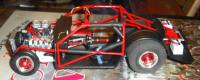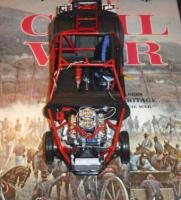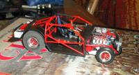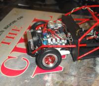 3. Latest set of pics - I shoulda waited until I test fit the primered body to add one more as the profile is astounding, but... Here's all the detail it will ever see. I added alternator wires, cut some rubber tubing to fit over the coolant lines, cut and sanded the slicks for 1:1, added the headers and got the rear in and touched up all the goobers. It has a fire extinguisher too. I don't think I'll go for this level of my interpretation of detail again for a while as it wiped me out and there are folks out there putting resin blower cogs and real belt material on their builds! I have a 1/8th pre-built collector's Hemi and it floors me how much MORE detail I missed: throttle linkage, springs, etc. LOLOLOL! Enjoy and have a chuckle at a rookie climbing the ladder 2 up, 1 down...