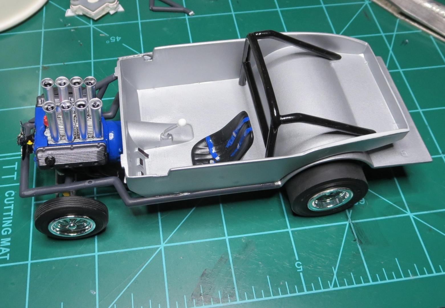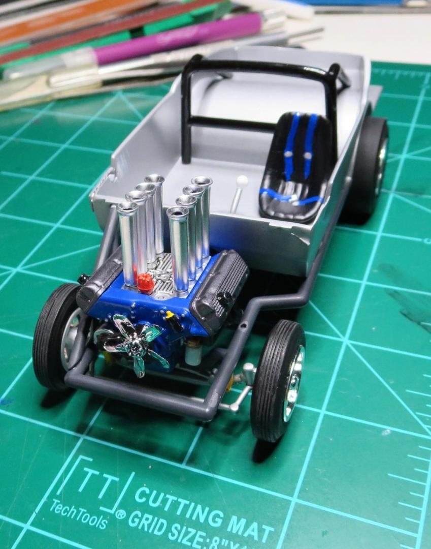 Wow, thanks for the encouragement you guys. Bob, thanks. There are plenty of weird things about the way this car fits together, that make sense with what you say. I think I've got the tub issues solved at least to the point that I put on the body and get things lined up moderately well, I'll find out in a few days! Alan, thanks, glad you're liking it. Ha, ha, on the paint thing! I'm always looking for the easy way out, and , it never works! I had another of these kit, so , I just used the other rear panel and filled it in, not the greatest job but now I know something new. I used to hate the very idea of using putty. I had thought of the plate idea too. Ace, I got those tabs in for the rear valence, (redid both the front and rear) , it looks like it's going to work. Then it will be time to polish the body. Here's the most recent progress shots: Here's the panels and the engine: -