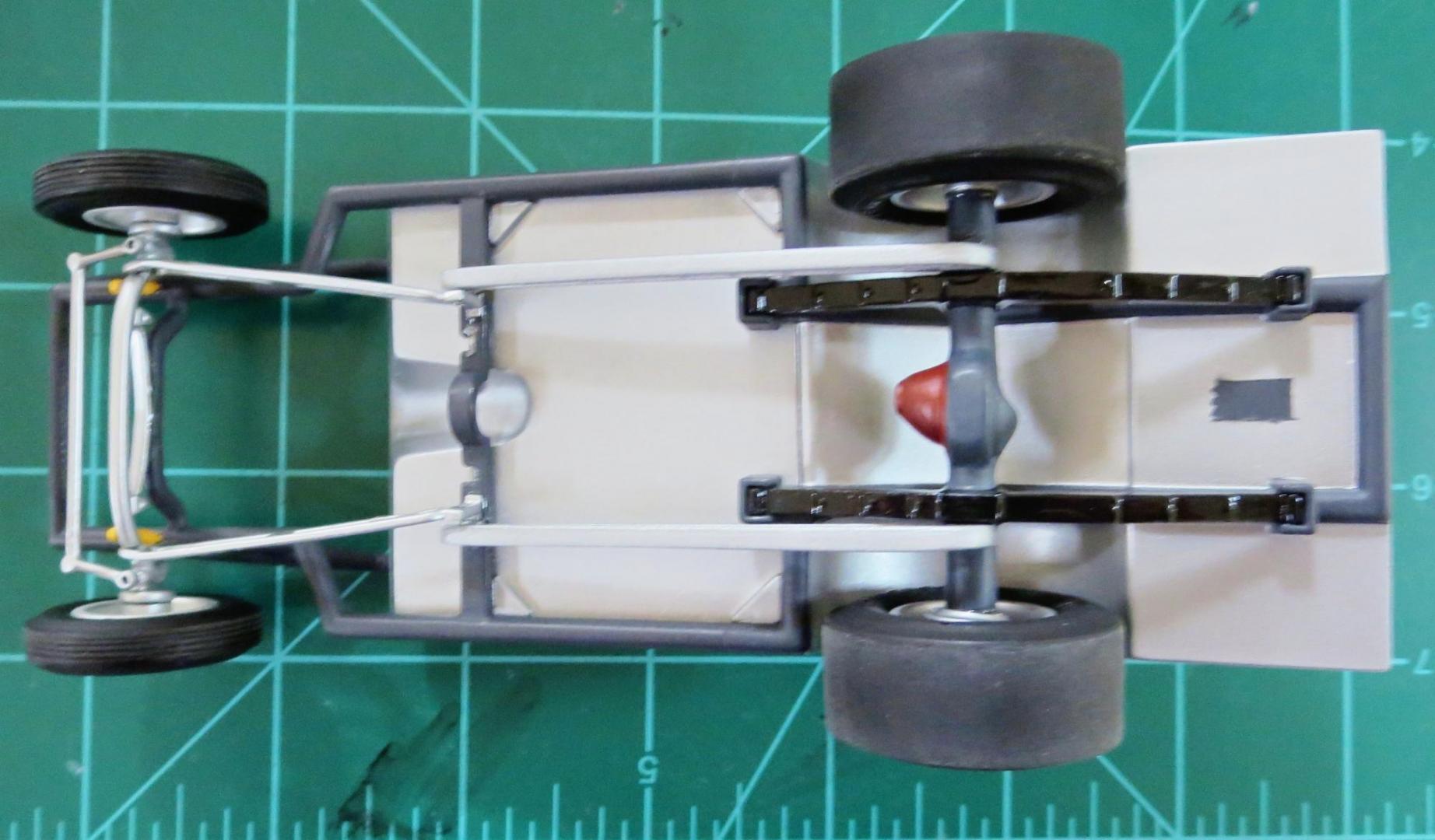 One other thing that is 'off' here is the front axle. The drivers side wheel/tire are off the ground slightly. I didn't catch this when I epoxied the piece on, so , that means the other side is further extended which could be why I had some difficulty attaching the trailing link to the chassis on that side, I couldn't figure out why it wouldn't stay in place when I was attaching it. Here's a pic of how things lay underneath, there are still a couple of things to finish up: Like the brake disk that has slid out on the passenger side rear wheel. Man, taking photos sure does let you know where you're at. There is no adhesive on the rear shocks. The fit was 'just' tight enough that for me to place the shocks into the chassis then just 'slid' the tops along the axle housings(?) until the tabs slid into the holes. Tricky little buggers those shocks. -