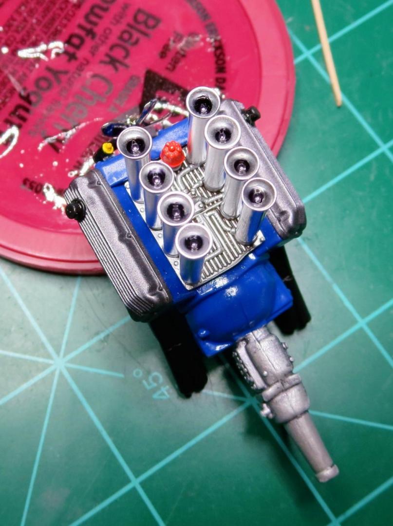 Okay Ace, this engine is from the AMT '69 Ford Galaxie kit, with the blue car on the box. It's the same engine but has a little better/different details. So, the main drain plug sat right in the middle of the cross cross member where it mounts. In the case of this specific model, I broke one side off that hole/square in the cross member (where the drain plug would fit) when I was doing initial prep six months ago., so I had to fill that in with epoxy and add a brace to one side so the front end piece would hold, (it also uses that hole/square) which made it flat on top and difficult to balance the engine, so I cut it off, no one sees that anyway. I hope that makes sense. Thanks for asking the question. Here's a couple of pics of the engine progress. The problem here is that I cut the tabs off the bottom of the ' Intake Horns ' thinking it would make it easier for mounting, yes that's right. So now, because CA melts the Alclad I've got to mix a batch of epoxy for each horn! Wear plastic gloves and all that, Yes! Oh what fun! I've got three of them on! The coil and the oil filter are from the Revell parts pack 427 FE engine. -