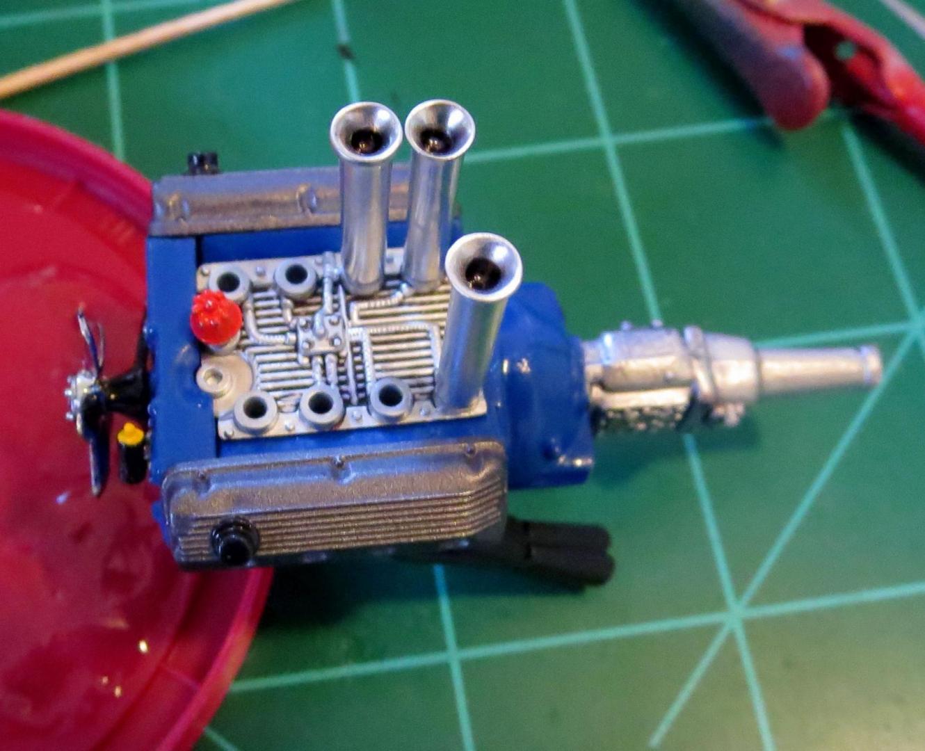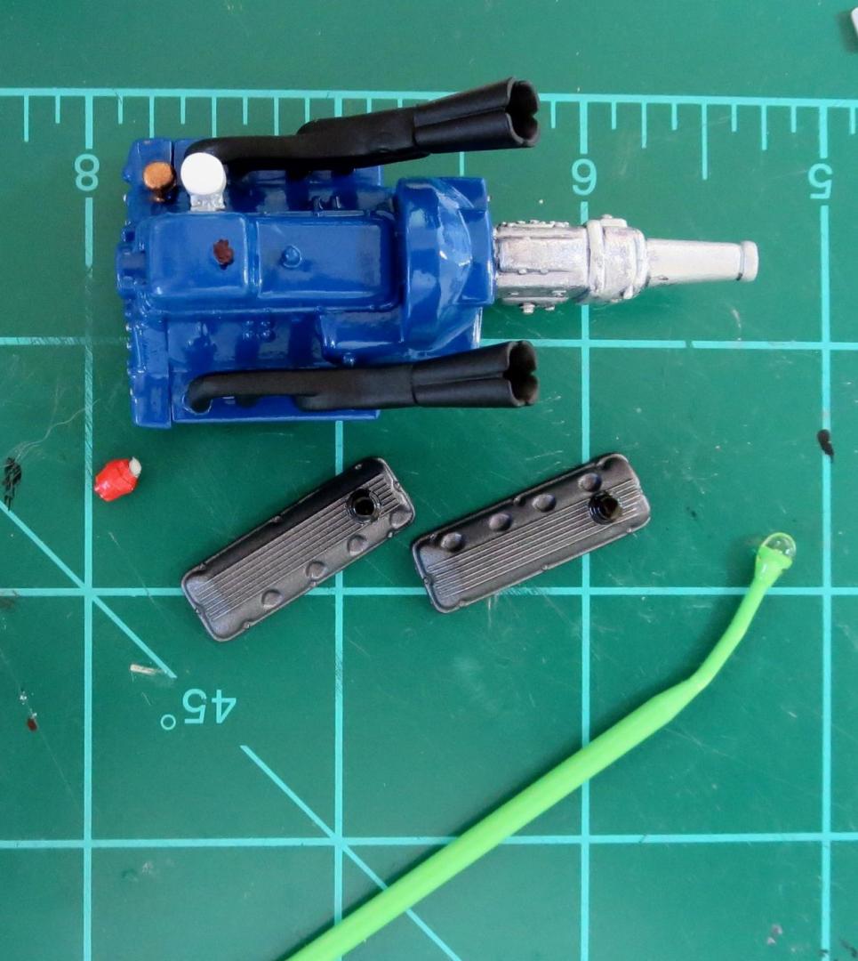Here's the valve covers and some stuff attached to the engine. The fuel filter is actually brass, my camera makes it look orange. The green stick is a thing for attaching small parts called 'Micro-Stix, not sure if I think they are worth the price, or , not, they stick too well. -