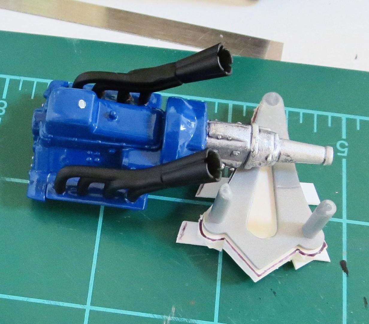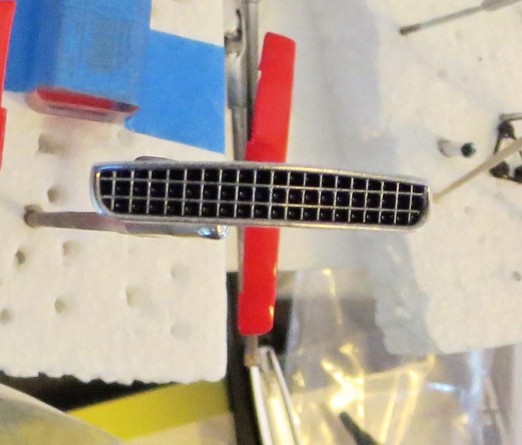 Here's some pics: The grill looks better 1:1 'cause you can't see all the imperfections unless you get 'really' close. The imperfections are places where I did not spray enough paint, so , there are little specks of black that show through. It turned out the way it did completely by accident, I was just spraying at an angle across the side of the grill and just enough paint was hitting the top of the grill insert. The white spot on the oil pan is where one of the drain plugs was, it interferes with the way the engine sits on the cross member. I love those fat black headers! Which I had to pin. I Alcladed the 'Injection Horns, (that's what the instructions call them!) and the alternator too. -
