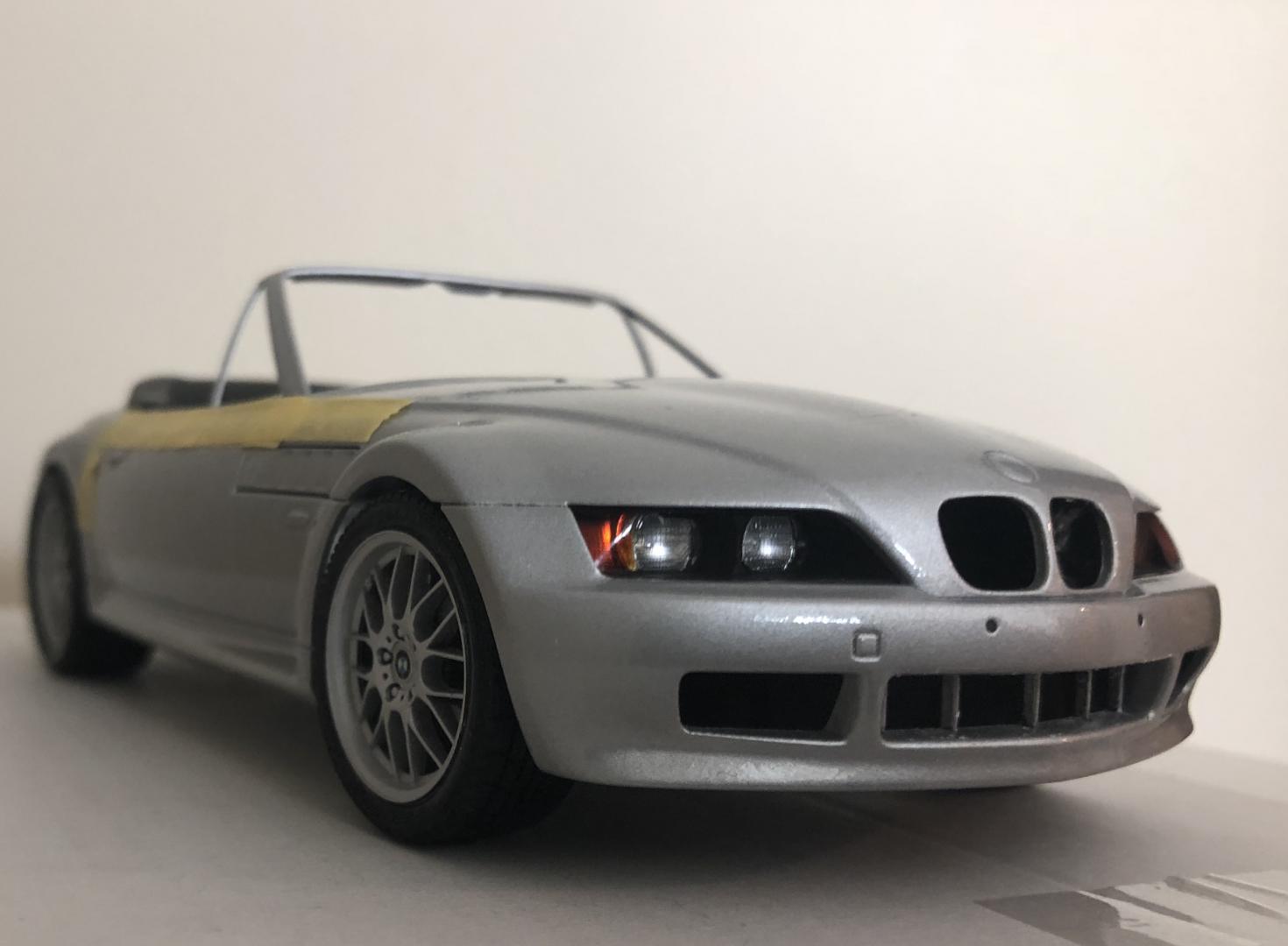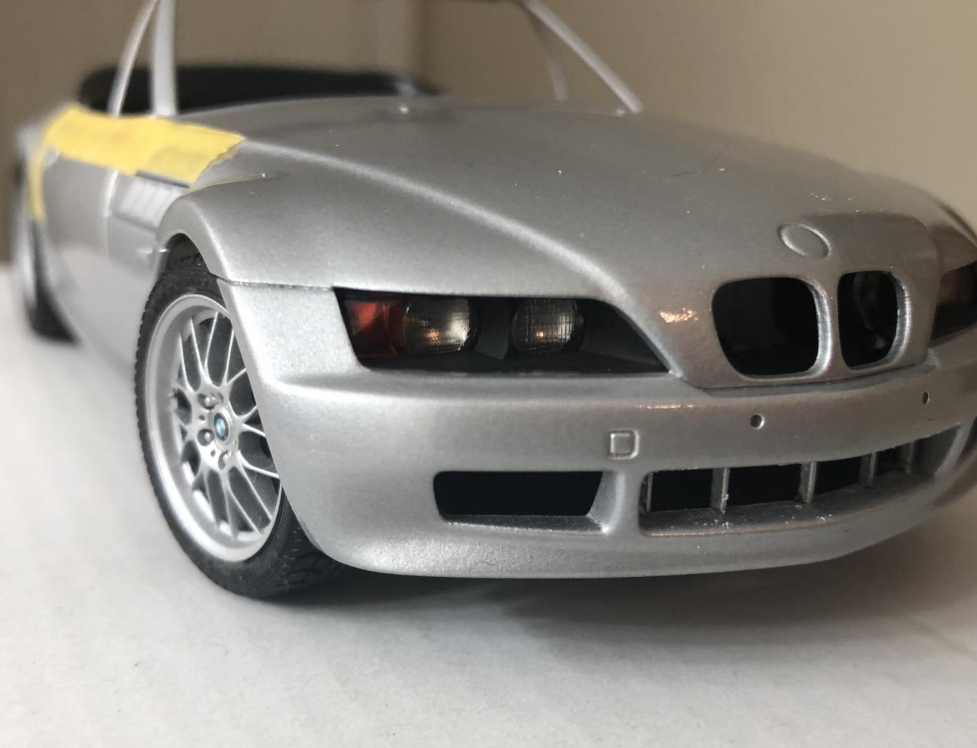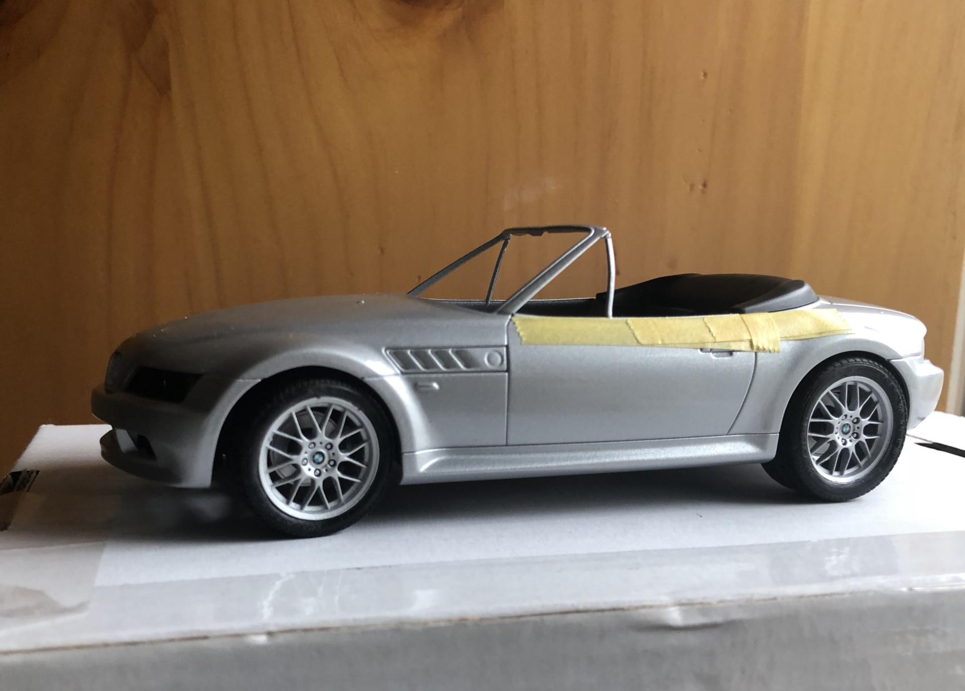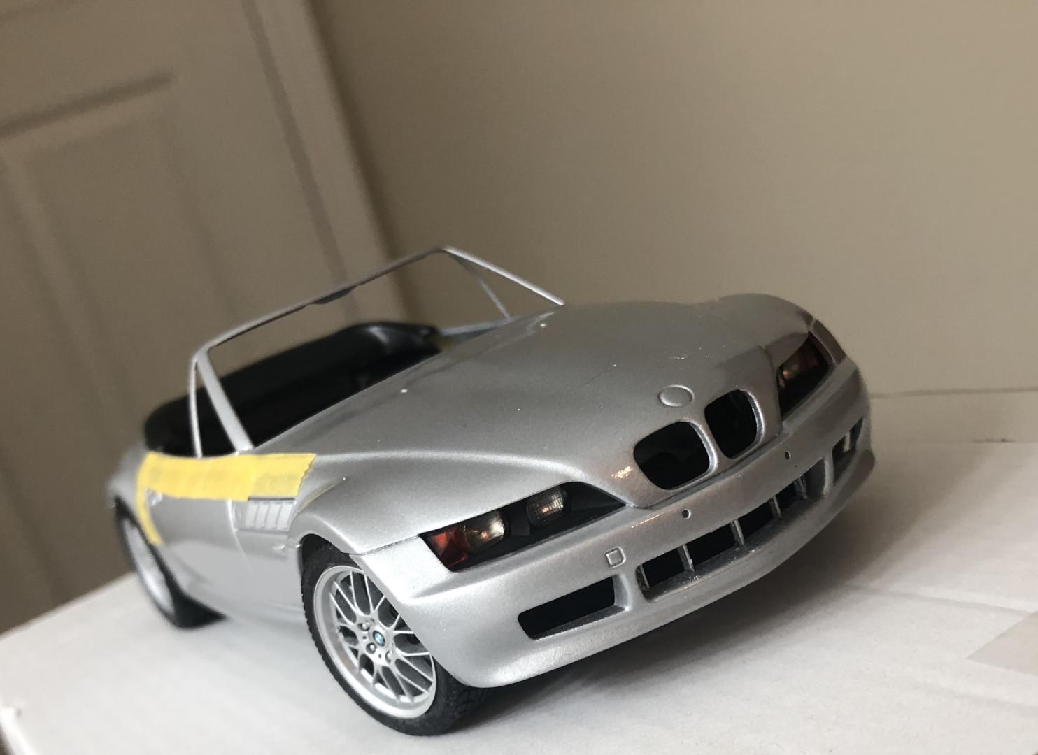 Hi all. I picked up a Tamiya BMW z3 kit. I primarily bought this to keep my skills fresh. I also wanted an opportunity to master Tamiya’s TS-17 gloss aluminum. And if it turned out alright I figure I would always have example to reference from for future builds. I have always had problems using the paint in the past. However I feel like I have finally figured it out. I started using the same techniques I use on color coats and TS mica paints and it seems to have done the trick. I prepped the body with Tamiya white primer. I used several coats and wet sanded the primer many times with micro mesh polishing cloths. All the way up to 4000-6000. When I started laying down the TS-17 I only used mist coats from the spray can that I let sit in warm water for several minutes beforehand. I made sure to achieve full coverage in mists coats only first. Then I laid down one medium wet coat. I let this dry for about 2-3 days and I then color sanded the body with micro mesh cloths. Making sure even out areas where the silver did not appear as fine as others. I then used a tack cloth and then Tamiya’s static dust removal brush before laying down 1-2 heavy wet coats. Once I could confirm there was no noticeable debris in the paint I laid down a few light coats of TS-13 clear to seal the paint. I then laid down a final clear coat a few days later. I hated the wheels that came with the kit. Luckily I had a set of 18 inch fujimi bbs wheels that I have been waiting to use for a while. I painted them MM Aluminum metalizer and then used the metalizer sealer. To make them fit i grinded out the female fittings inside the wheel with a dremel tool. I then cut some plastic tubing to fit. It was slightly thinner than the Tamiya male fittings on the stock wheels. So I used Tamiya tape and gradually added enough width until they would fit snug in the brake. I then sealed the tape with CA glue before installing.Tires are from a first gen Tamiya NSX. Underside was painted TS-17 and lightly cleared. Since there was no motor in this kit I figured it would be worth detailing this portion as much as I could. I used a combination of Vallejo paints, black, metal gold, gunmetal, air gunmetal, air silver and Tamiya weathering powders. I also used oil paints as a wash. Overall I am quite pleased with the progress so far. I am also growing quite fond of this car the more I look at it. It’s a very timeless and beautiful design. I wouldn’t mind owning one of these someday. The interior will be black. I need to replace the driver seat as it is ruined. Given how the paint has come out I will probably use TS-17 for my silver paint from now on. Considering the ease of use from a spray can it is quite hard to beat the results. Comments welcome thanks for looking! Oh and the tape is in preparation to paint the window rubbers.