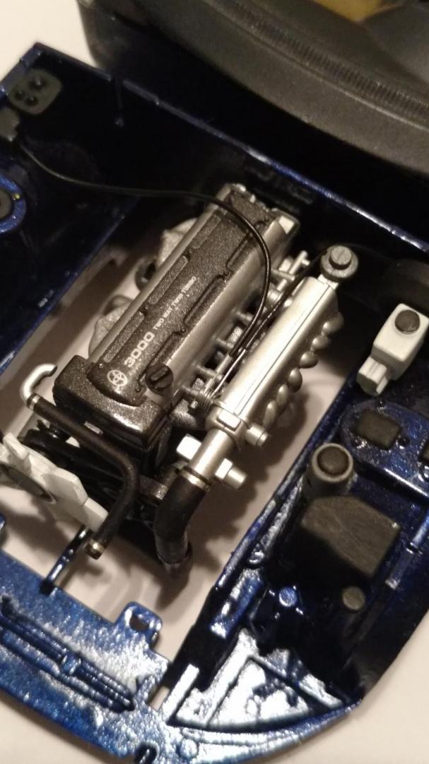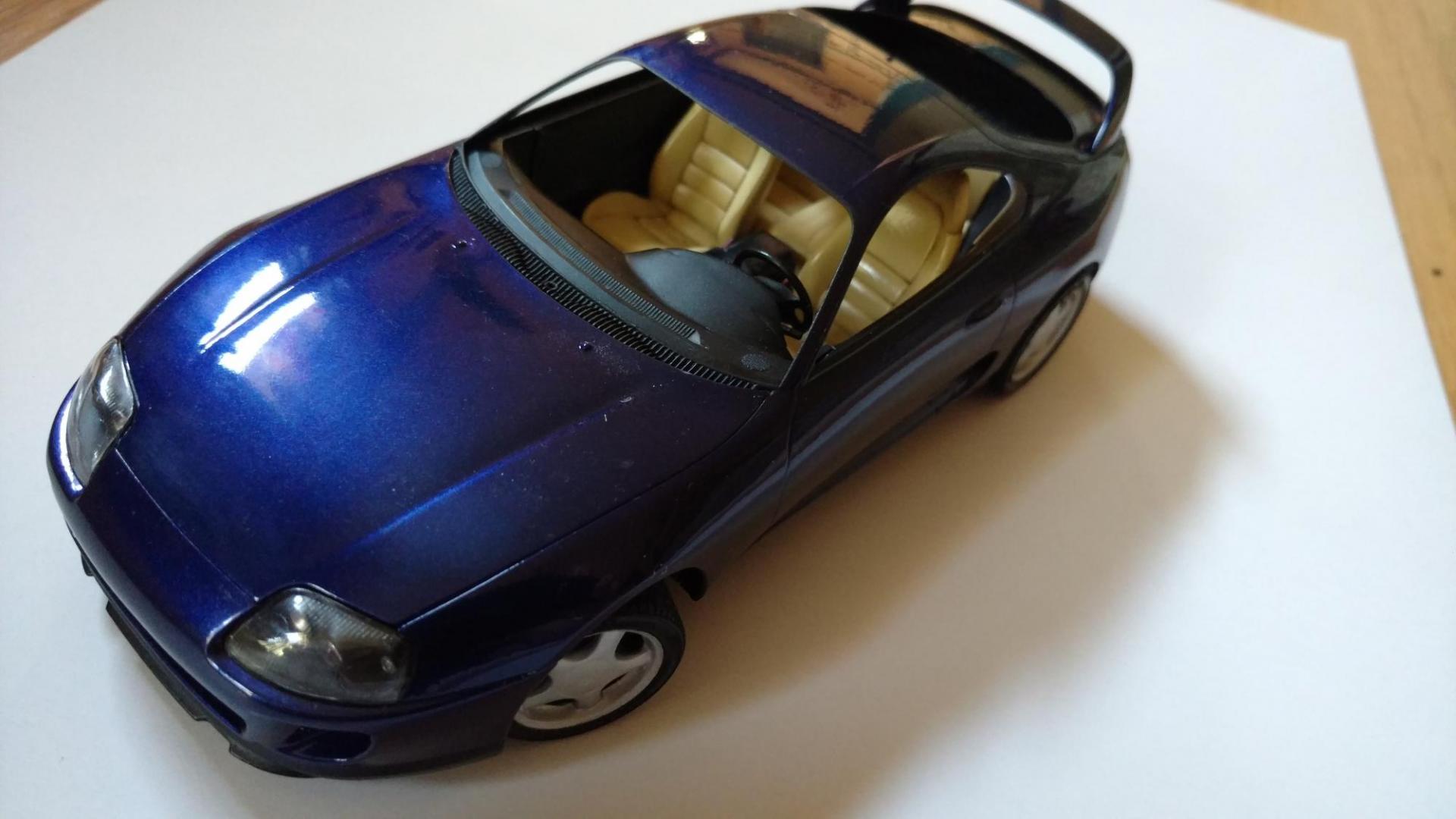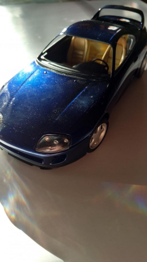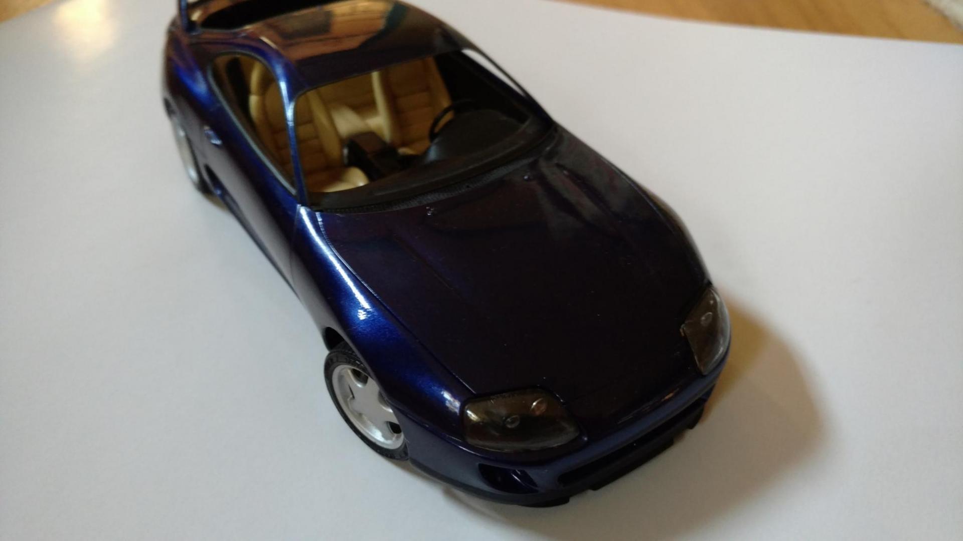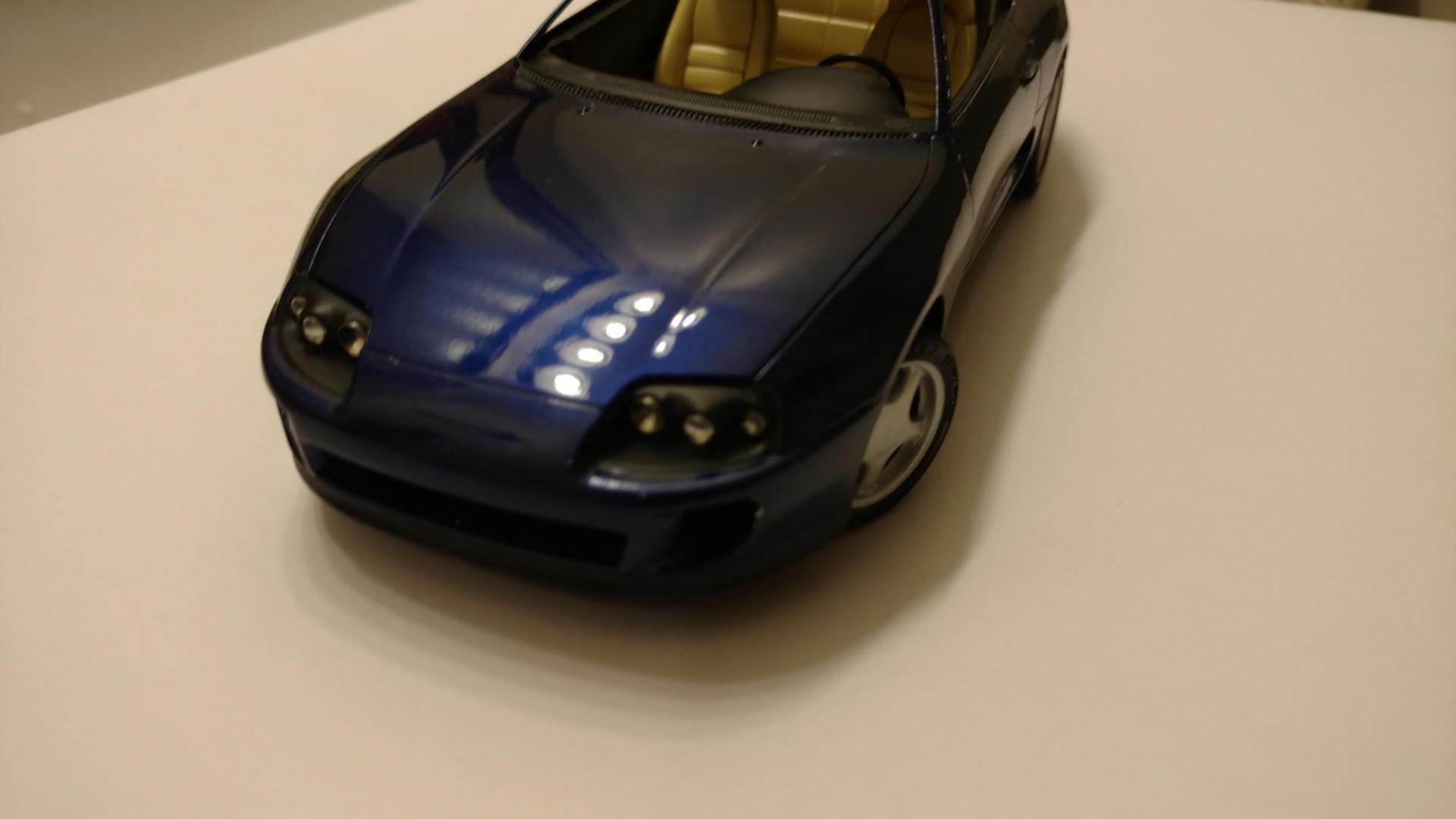 Hey guys so here's one I've been working on for a while. In recently repainted the body because of some errors I was unhappy with on the roof. But everything else was painted about a year and a half ago. The supra is one of my favorite cars ever. My realistic dream car so to speak. I am wanting to make a trio of Blue, Red, and Silver. This one here is painted with TS-53 Racing Blue and TS-13 clear. The interior is painted with Vallejo air Tan and Black. Flocked with model master sand and black as well. I use the spray adhesive method and then use the white glue method to patch up any mistakes. The seat belt catches were scratch built from clear plastic. The gauge panel was handpainted flat black for contrast like the real car. The engine block was painted with XF-16 flat aluminum and then I hand painted the flat block on the block but that is not visible. The upper intake and accessories were painted with model master aluminum metalizer non buffing. The gunmetal detail took quite some time to mask and get right. That was done with MM gunmetal metalizer as well. The details were picked out with strictly Vallejo paints. I am currently trying to devise a way to create ignition wiring and a few other details for this one. I do have the model mieser turbo kit but I may save that for the red supra I have planned. I may keep this one stock. Quick mock up shot. More to come and I'll try to get some better pictures soon!