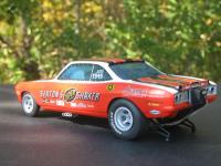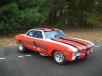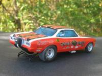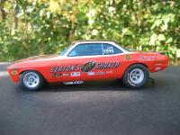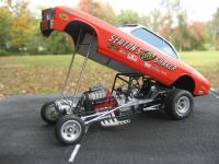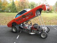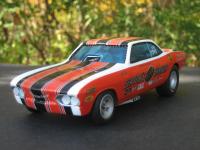 Just finished. Body was taken from a stock AMT Corvair kit. It was lengthened in the front and put over a modified Polar Lights F/C chassis and tin. Big Block Chevy engine and accessories were taken from my parts box. Paint is House of Kolor Molly Orange and White. Decals are from PoleCat and Slixx Seaton Super Shaker Nova. Thank you for looking