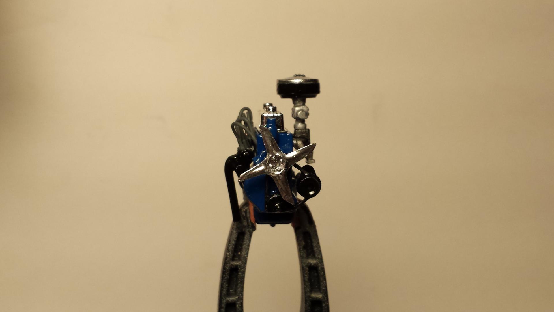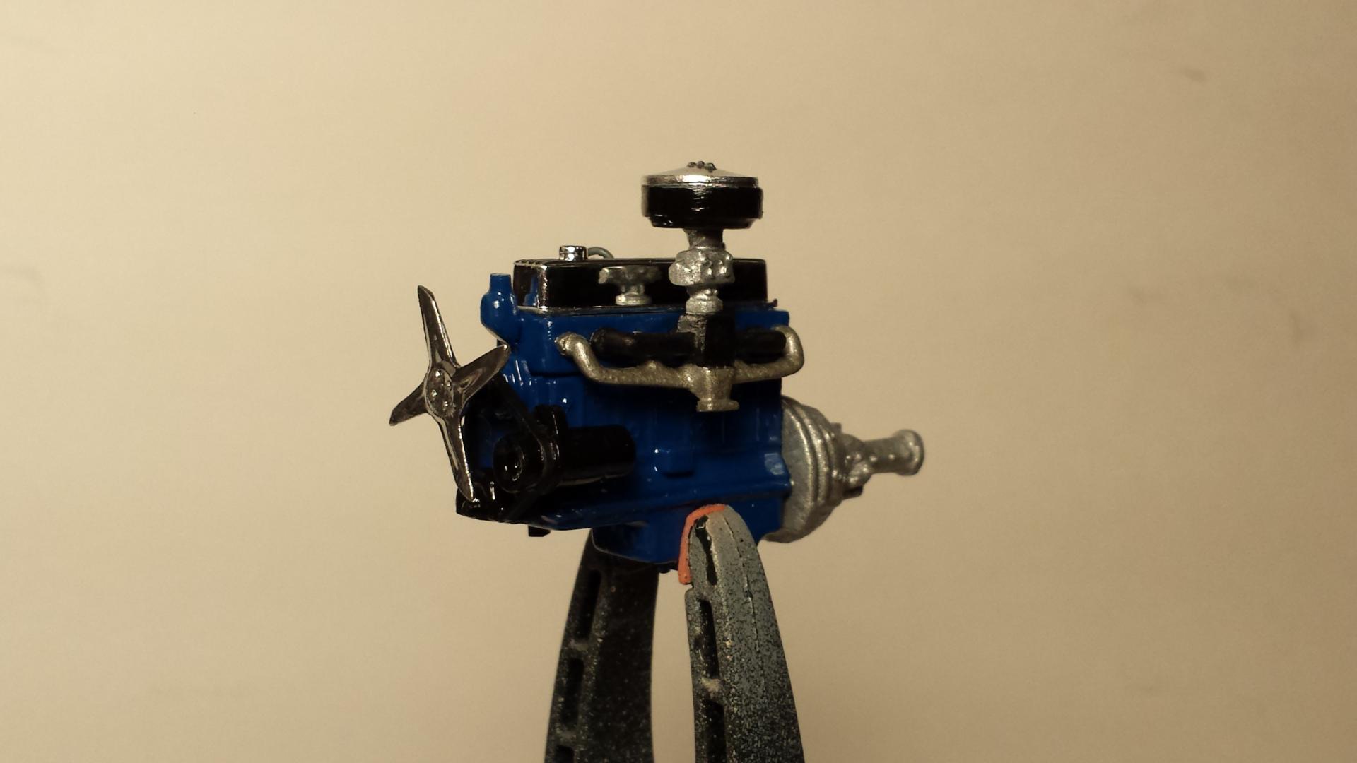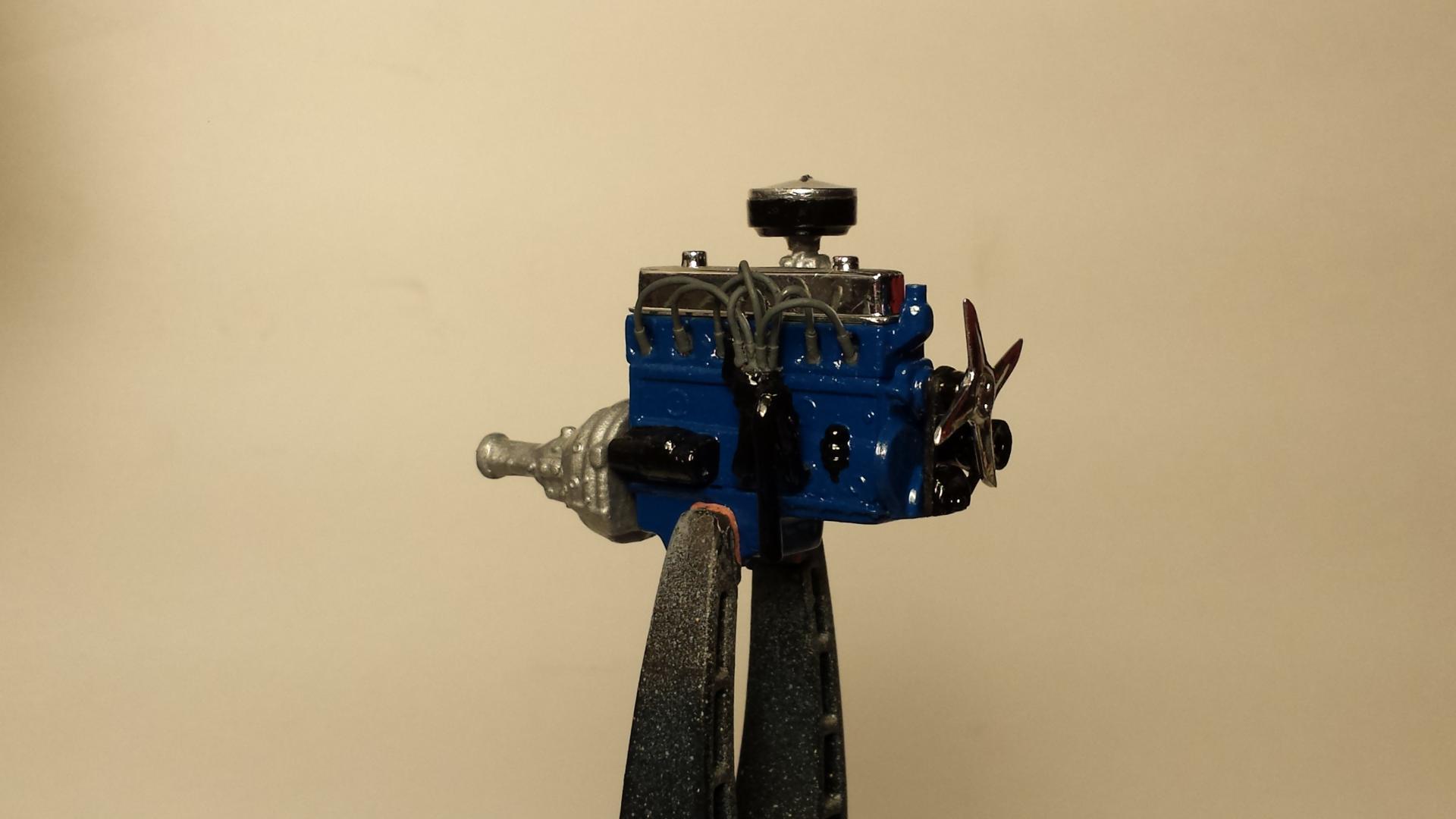 After a winter hiatus I'm back to making some progress. I know winter is the time when stuck indoors lots of hobby work (usually) happens. But with being laid off from work, getting a new job and adjusting to new work schedules etc. I couldn't get my mind on task. The dust is settling and I have blown the dust off the Chevy. I got the front suspension finished and is now a roller. Test fitting went great but after getting it all glued and assembled the drivers side wheel has a bit of a camber to it. It is glued and pinned together so I am not going to disassemble it to try and fix it. It will just have to be that way. It also isn't nearly as obvious with the body on it so I think it will be ok. I got the engine all finished as well. Somewhere along the way I lost the coil so I scratched one out of a piece of sprue (turned in a drill with a jeweler's file). Plug wires are made from stripped cat-5 wire and painted. I'm 98% sure I got the firing order right. The belts were shaved down as in scale they would have been well over and inch thick. The fan and top of the air filter were painted with a Molotow pen. I'll let the paint dry for a bit and hopefully this evening I'll get the engine in, the exhaust hooked up and maybe if I really get on a roll I'll get the inner fenders and radiator all assembled. Now if I could just get some decent lighting for my pics I'd be stylin' (the background is actually white). Thanks for looking and feel free to comment.