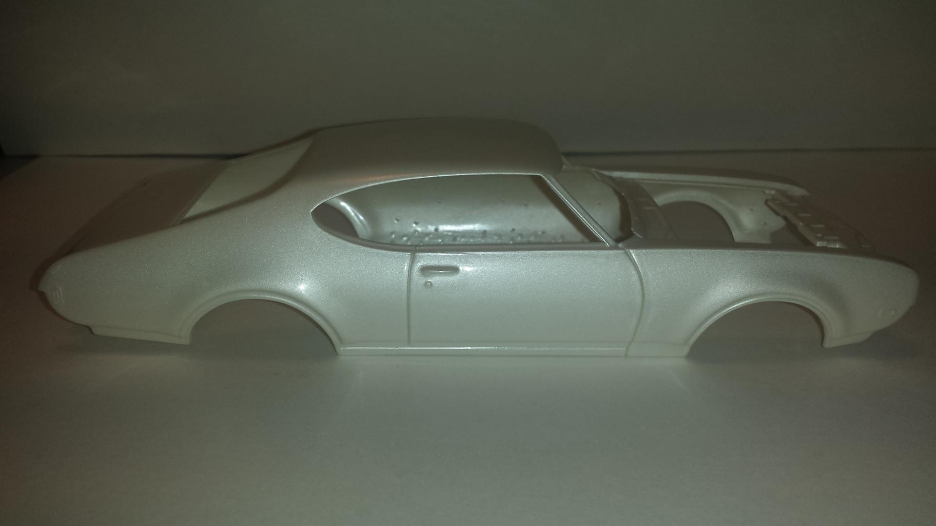 I have a question for those of you experienced in light/white paint jobs. I have a '69 Hurst Olds which I have painted with Testors One Coat Lacquer - White Lightning. My apologies to all the purists out there - I am aware that the 1:1 was pure white and not a pearl white. I have just always liked the color and thought it would look stunning with the gold decals and IMHO I'm not wrong. I did not use primer under the paint, and after getting a near perfect paint job that I am totally happy with (and wet sanded to 12000 with no burns), I am NOT willing to strip it and redo it (unless somehow I completely ruin something in an unforeseen way). That said, I am going to be painting the roof liner in flat black. I am a bit worried about the black "shining through" the roof and dont want the roof to be mismatched to the rest of the car. I have read if you want to avoid shine through to paint the inside of light (white in this case) car bodies with grey primer and dark bodies with black. I'm not sure that I want to paint the rest of the inside black (to match the roof) as I feel this may darken the whole car up too much. If I paint the roof liner (and the rest of the inside of the car body) with grey primer before painting the flat black, will this keep everything color wise looking even or matched from the outside (will the grey primer keep the black from shining through)?? I dont have any more of the paint or a spare body/parts to experiment on at the moment to figure it out for myself so I am asking the question instead. Thanks in advance. Mark. -