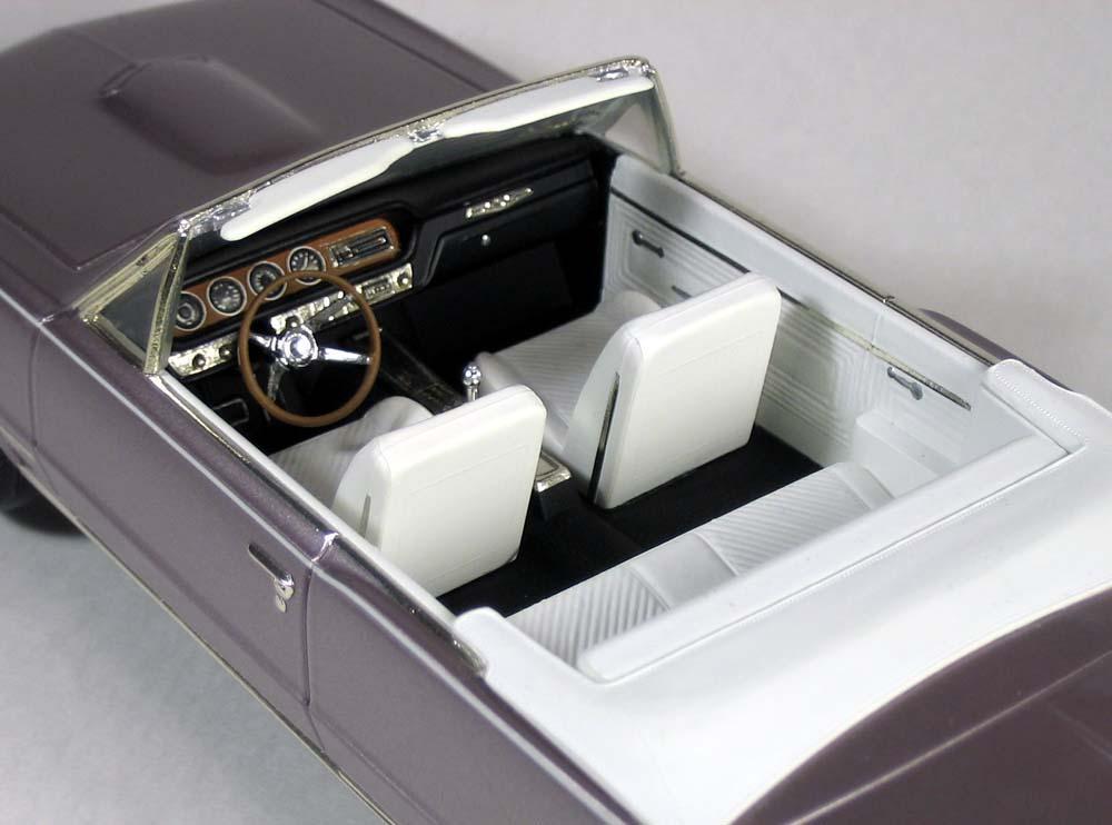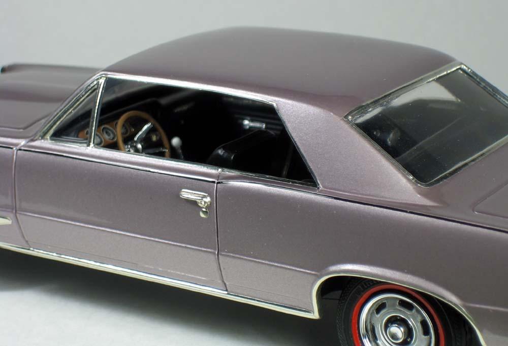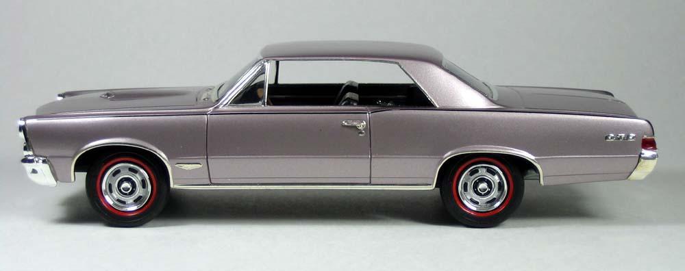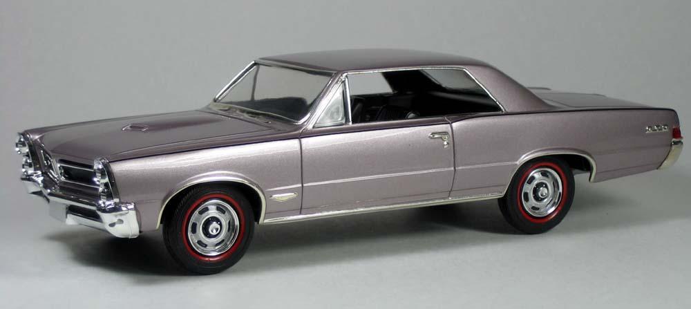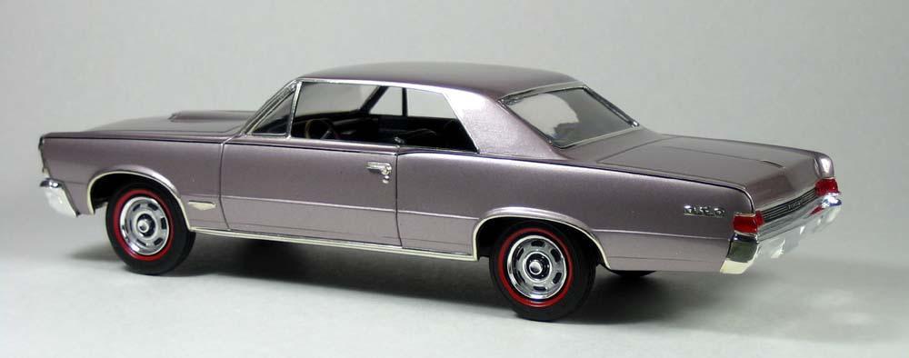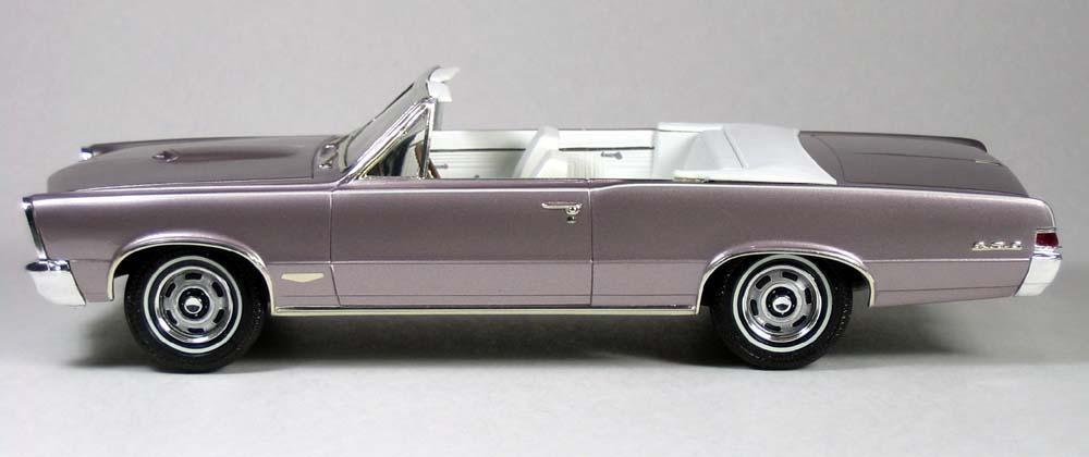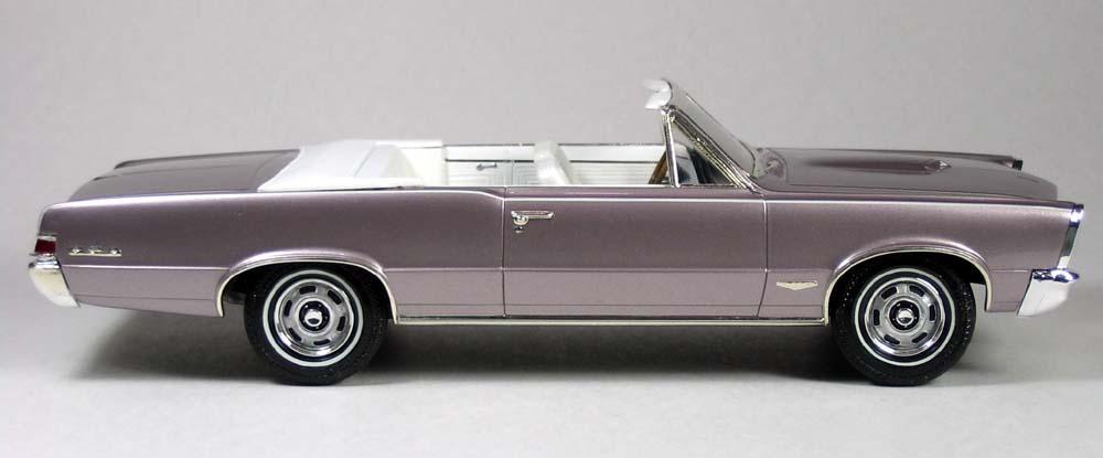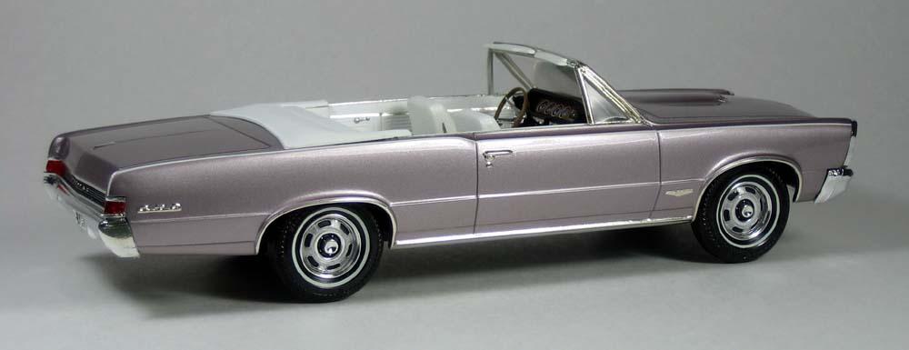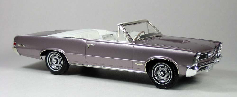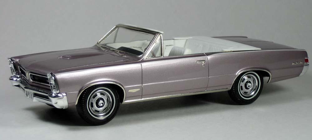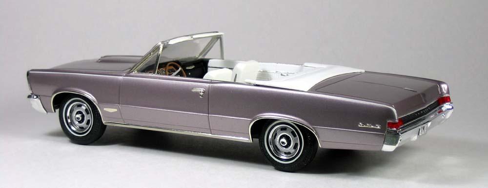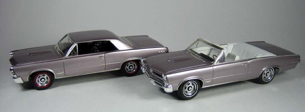 I finally got around to photographing the pair of 1965 GTOs I built back over the winter. They were built for my model car clubs "Showroom Stock" Contest and were meant to be entered as a pair, sort of a his and hers thing. Unfortunately I wasn't aware that the rules state only one model may be entered and so I had to pick one. I went with the convertible and it didn't win, but was very well liked anyhow. The Convertible was built from an original AMT 3 in 1 kit from 1965. The hardtop was from a later reissue of that same kit. Since the kit was designed to be built either as a convertible or hardtop, the top was a separate part that needs to be glued on and blended into the body, no small task as the fit is marginal at best. I decided to finish them in a very unusual color offered in 1965 called Iris Mist. Since they were to be displayed as a pair I painted them both the same color, I gave the hardtop a black interior and the convertible a white interior. I also gave the convertible white wall tires, while the hardtop got classic red lines. Thanks for looking! Tory