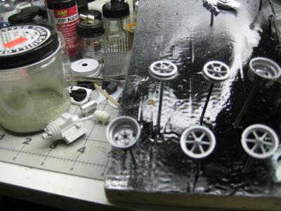 Here are a couple of pics - body first primer and bondo for the lovely sink marks, wheels in color. I know, I'm slow.
