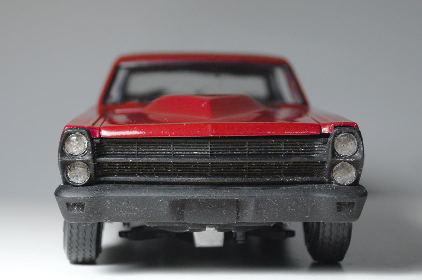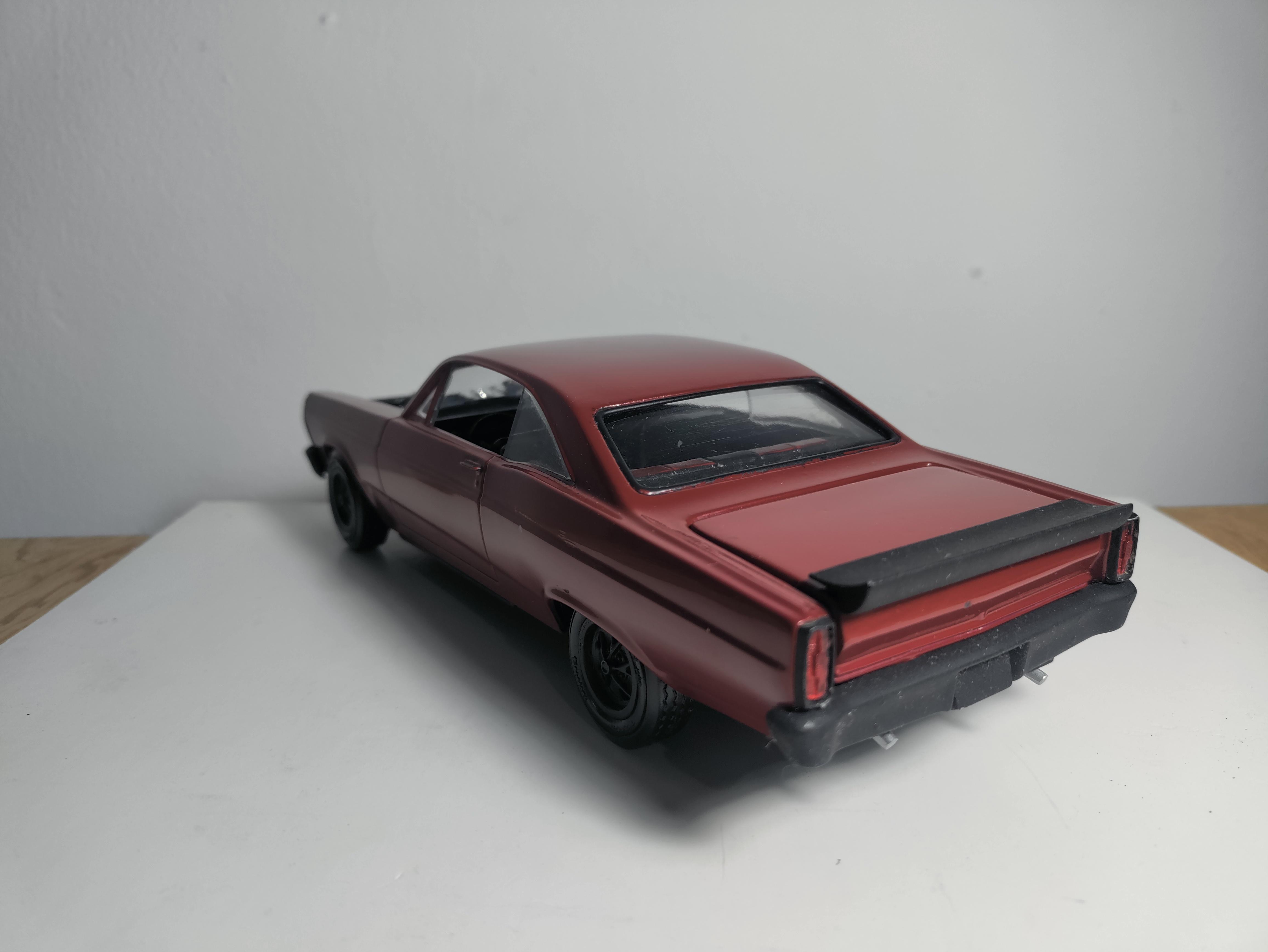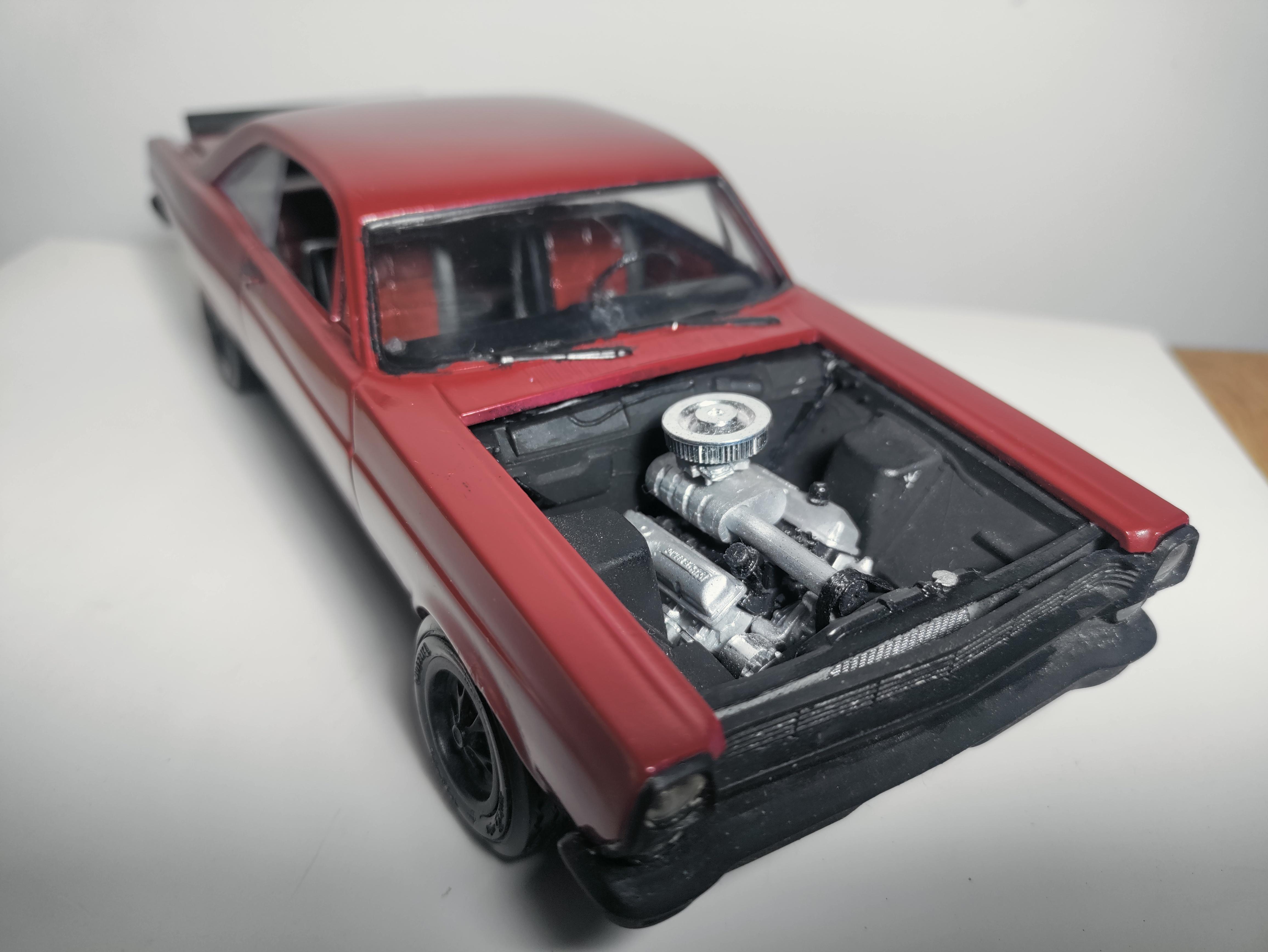 Some time ago, I painted the body, but then I left the hobby for a few years. Now with this build, I am going back to the amazing world of modeling. Well, first, I'm focusing on the hood and doing some scrap work while I gather all the stuff I need, like putty, paint, and everything else to build this kit. Removed the FORD letters y the inner line I made the hood scoop with styrene At that point, I was unhappy with the height, so I lowered it a little and did some more sanding. It is not ready yet, but I like how it's going. I removed the side badges from the Fairlane. And made the rear wing Next, I am going to build the engine, add a supercharger, and test how everything fits under the hood.