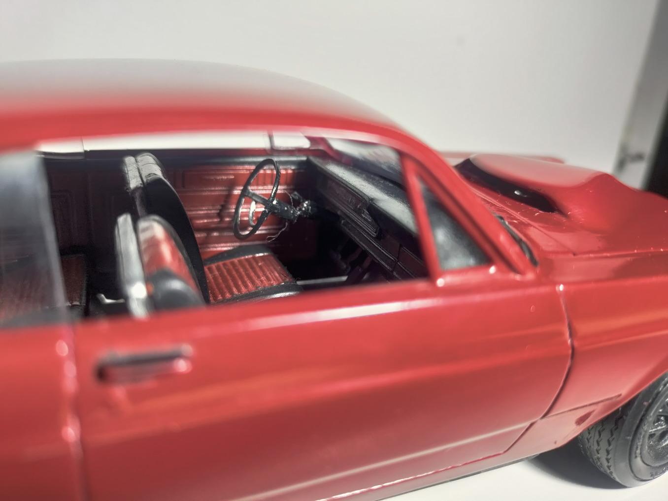 The interior is now complete! I initially considered flat black but decided to experiment with red tones first. While I'm not completely certain about keeping the red, I'm kinda liking how it turned out. Do you think it's too much red? In other progress, I de-chrome the bumpers and painted them in flat black