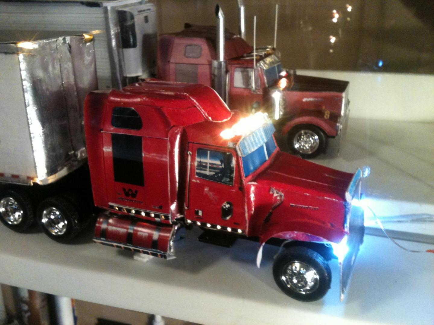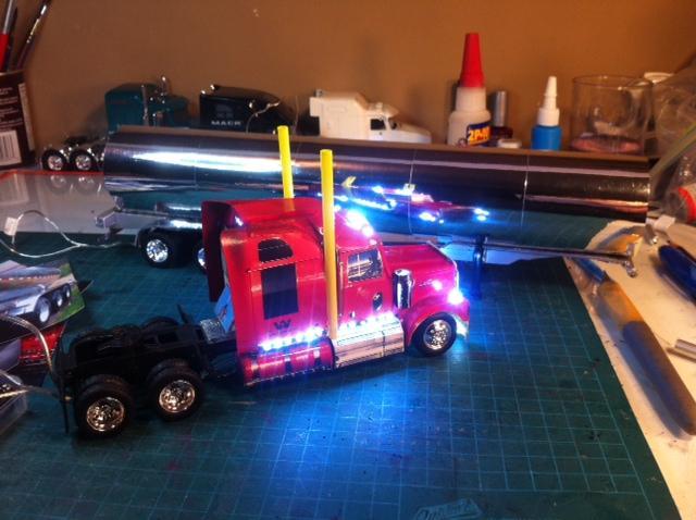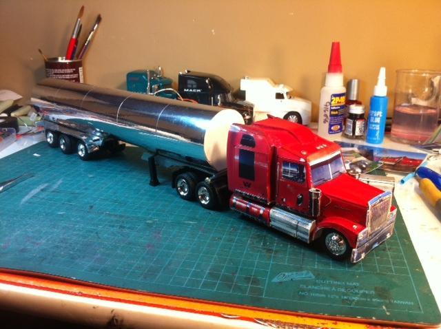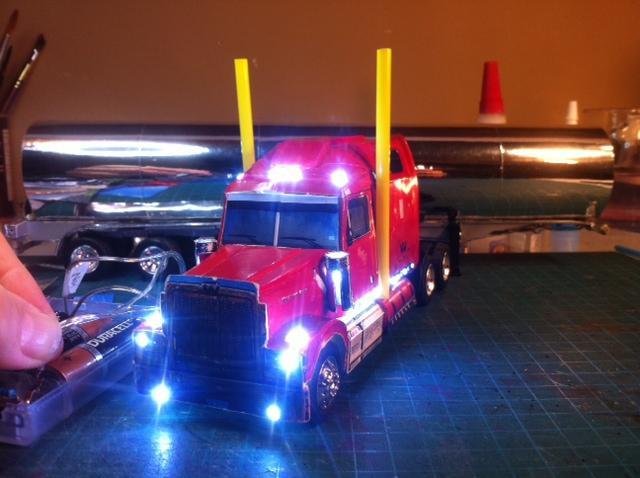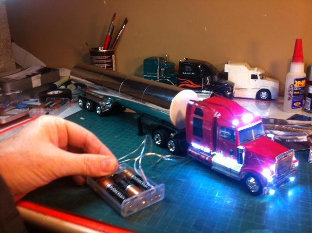 Working on my 7th digital photo replica, the 3rd for Aztec Transport out of Campbell River, BC. The first two were tri-axle Refers and this one is a tanker that they haul live Salmon in for a client based in Norway. I am testing the lights out that I've installed, with clearance lights and tail lights to be painted yellow and red, the same as the rest of the models. Today I had a short in the trailer and will now have to rip out this set and replace them. Rrrrrr. Still have a fair amount of work as these models are created from the actual digital photos taken of the real truck, scaled to 1/43 size and cut out [as seen in the last photo] and glued on a kit bashed tractor and trailer chassis. The tanker is a chrome tape covered cardboard tube with foam core bulkheads as you can see in the photo of the rear end that I have buried the clearance lights into. I have posted pics of some Western Stars replicated using the same process titled Digital Photo Replicas if you want to see more of this technique. I have a Peterbilt 389 to build after this for a small trucking company out of Guadalupe, CA. and am looking forward to that project.