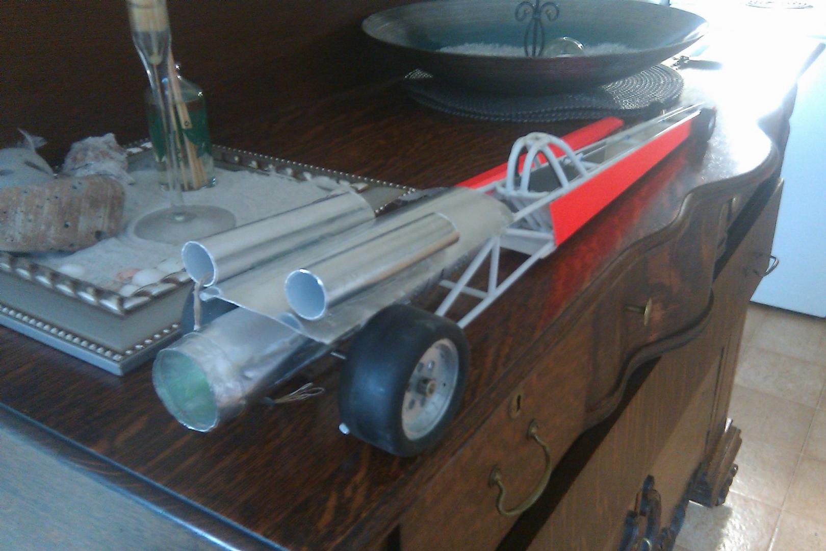 Scratch built 1/12th scale Jet Dragster that really goes, fire, smoke and all! Using styrene balloon straws I fabricated this Jet Dragster chassis. This car goes like stink, powered by C-class hobby rocket engine that slides into a PVC pipe inside the muffler tape covered, afterburner, tailpipe of the scratch built General Electric J85 jet engine. I run it down the street on a scale quarter mile length of fish line, anchored at both ends. after crossing the finish line the engine back fires and pushes out the parachute that slows the smoking machine. It's very cool to see and I entertain the neighbourhood regularly by match racing another version I have built.