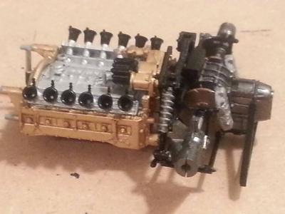 Back in February, I was in the process of building the Fujimi Brabham BT46B F1 kit, but I never finished it after a problem I had with part of the body. Fujimi's coloring uses Mr. Color paints so I was unable to figure out what to use for the red of the body since my hobby shop only carries Mr. Color jar paints, not their spray paints. I used Tamiya Bright Red but did not like how it came out. Wound up switching to Italian Red. Long story short, I became too ambitious with what I was doing and I needed to strip the entire kit, but due to how much detail they put into the moldings, I was never able to get it stripped completely, and wound up sanding out many of the fine details in my lost effort. At some point I do plan on rebuying the kit and redoing the body. The Alfa Romeo flat 12 looked very similar to the real life pictures I had, and I was amazed at how awesome it looked when completed. With that said, as mentioned, Fujimi does an ace job with details on their kits. It's incredible. It's very much because of their details that I will rebuy the kit since I wound up sanding off riveting work on the body, and I did not want to lose that. The one problem I had with the their kit (I'm not sure if this was just this kit or is the case with others) is that pieces fit very tightly. Priming parts, and then painting over them will affect the fit more than any car kit I've tried to date. Tamiya doesn't fit as tightly as Fujimi, nor does Revell and Ertl. I had to sand back to the bare plastic in order for some small parts to fit flush in the joints whereas I didn't have to bother doing that with other kits. Here are a few pictures of the engine from the kit just to give an idea about the details. All of the intake trumpets are individual pieces.