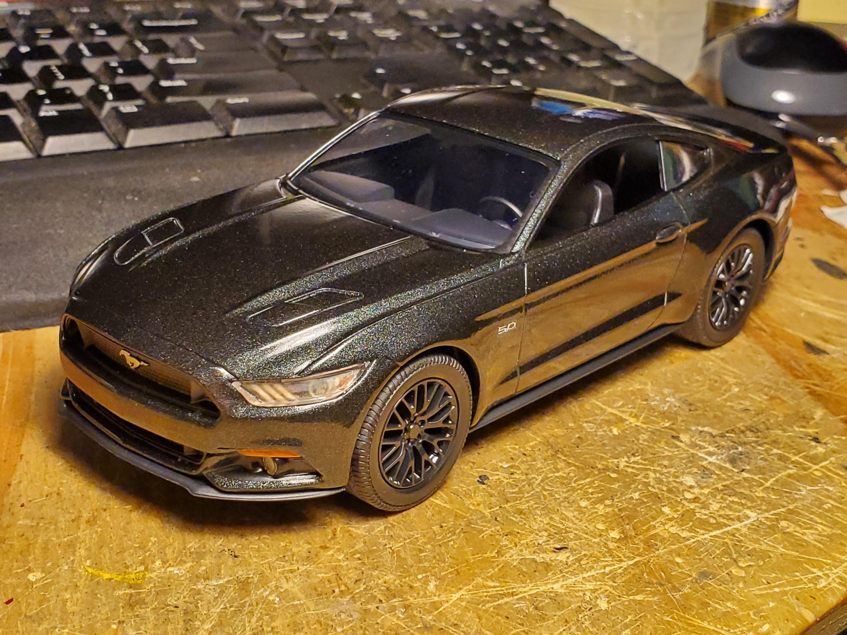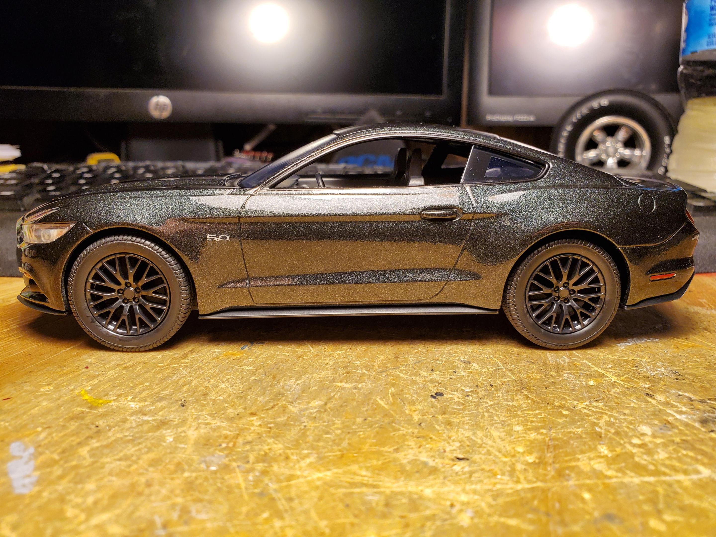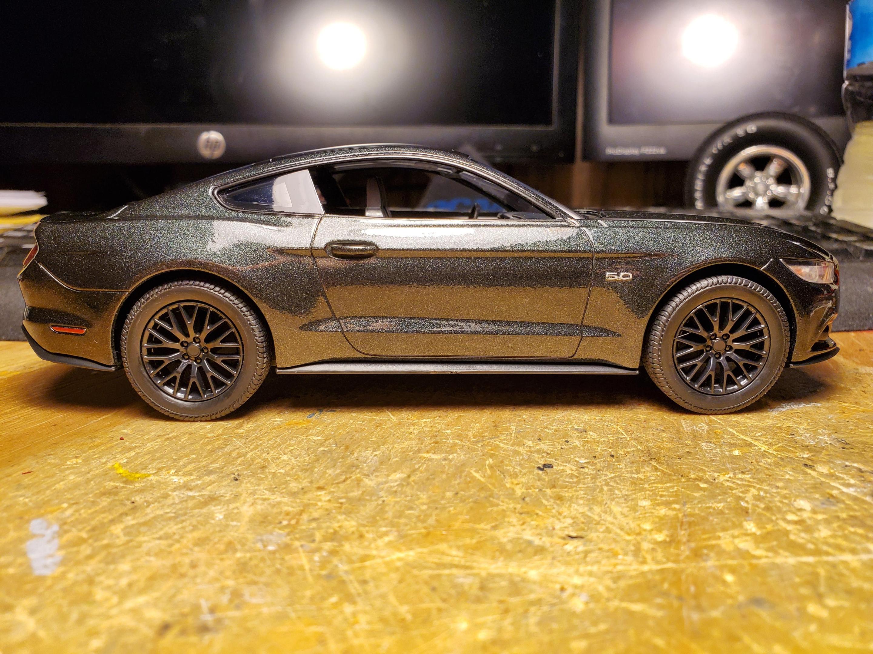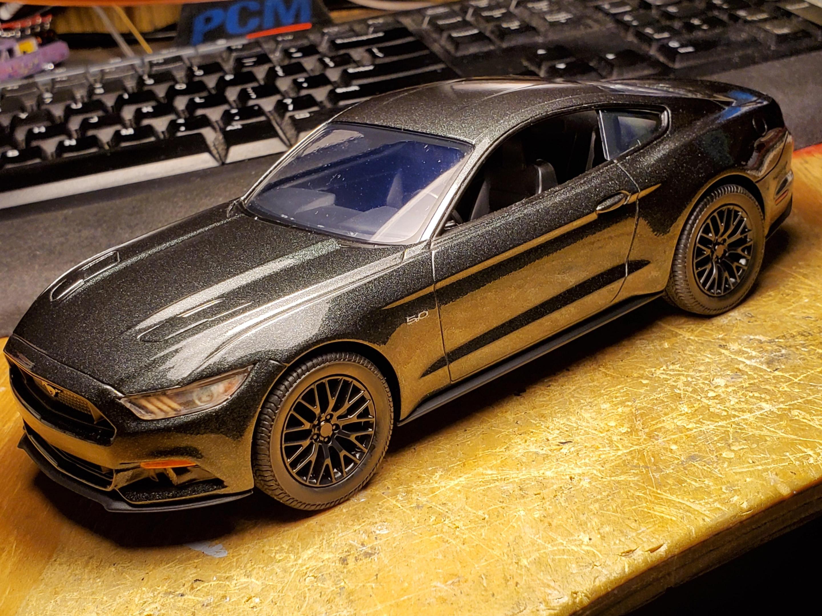 Another one from my archives of somewhat recent builds. This is the Revell basic builder/snap kit, molded in yellow. I love the color these came in called "Guard Metallic" which is sort of a green with a gray tint to it. Anyway, I loved that color so much I had some mixed in basecoat. I foiled the emblems before paint and sanded the paint off before clear. Detailed the window trim, all the lights, and even printed some headlights on paper to put behind the clear lenses to make it look a little better. Interior has basic details painted. I later 3d printed some mirrors for the 2015-up Mustangs and painted those and cleared them, and glued them on the car. So most of these pics, the car won't have door mirrors. The paint is auto body supply mixed basecoat/2k clear out of a rattle can. I painted the windows and wheels with Future to give them a more glossy look. The windows in these kits are really flat-clear looking. Enjoy