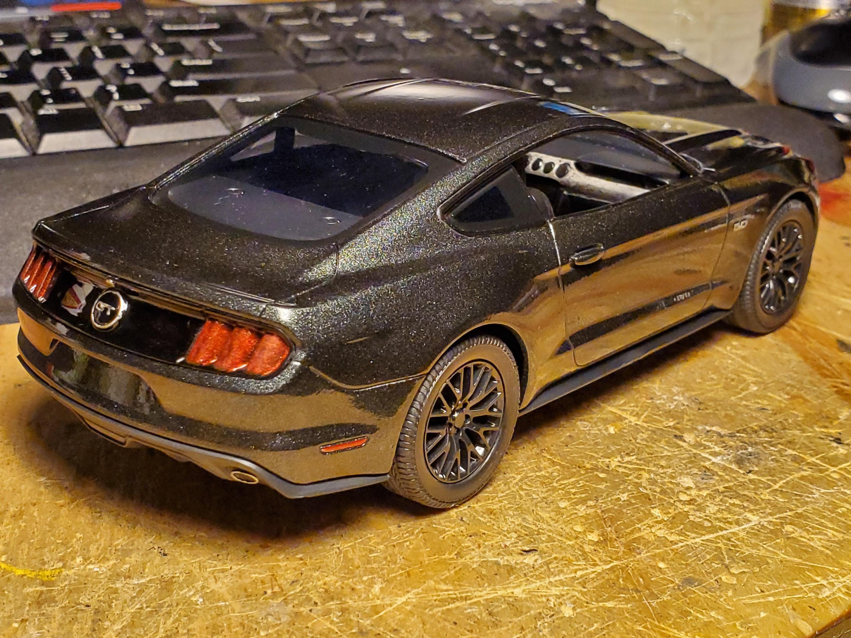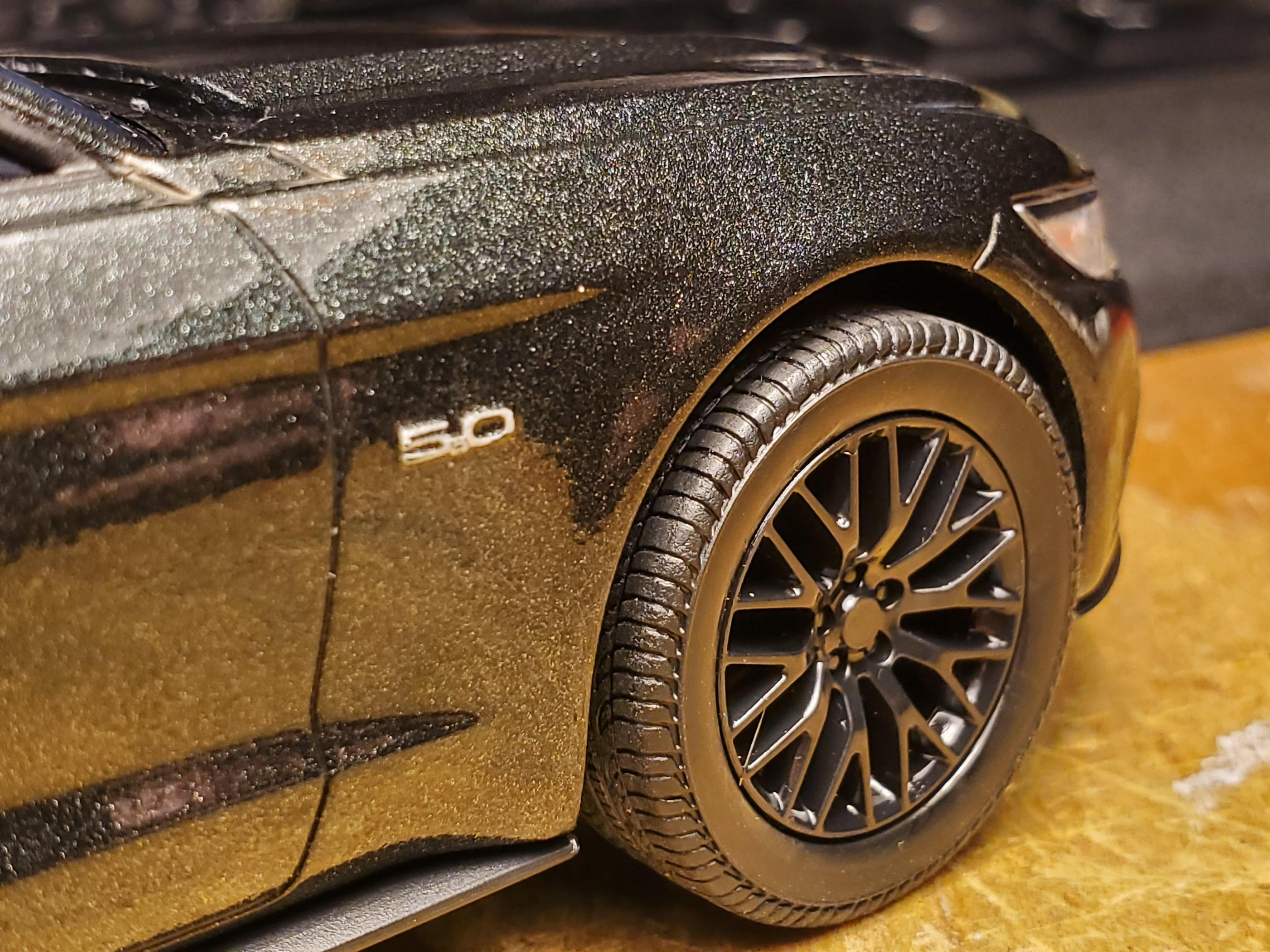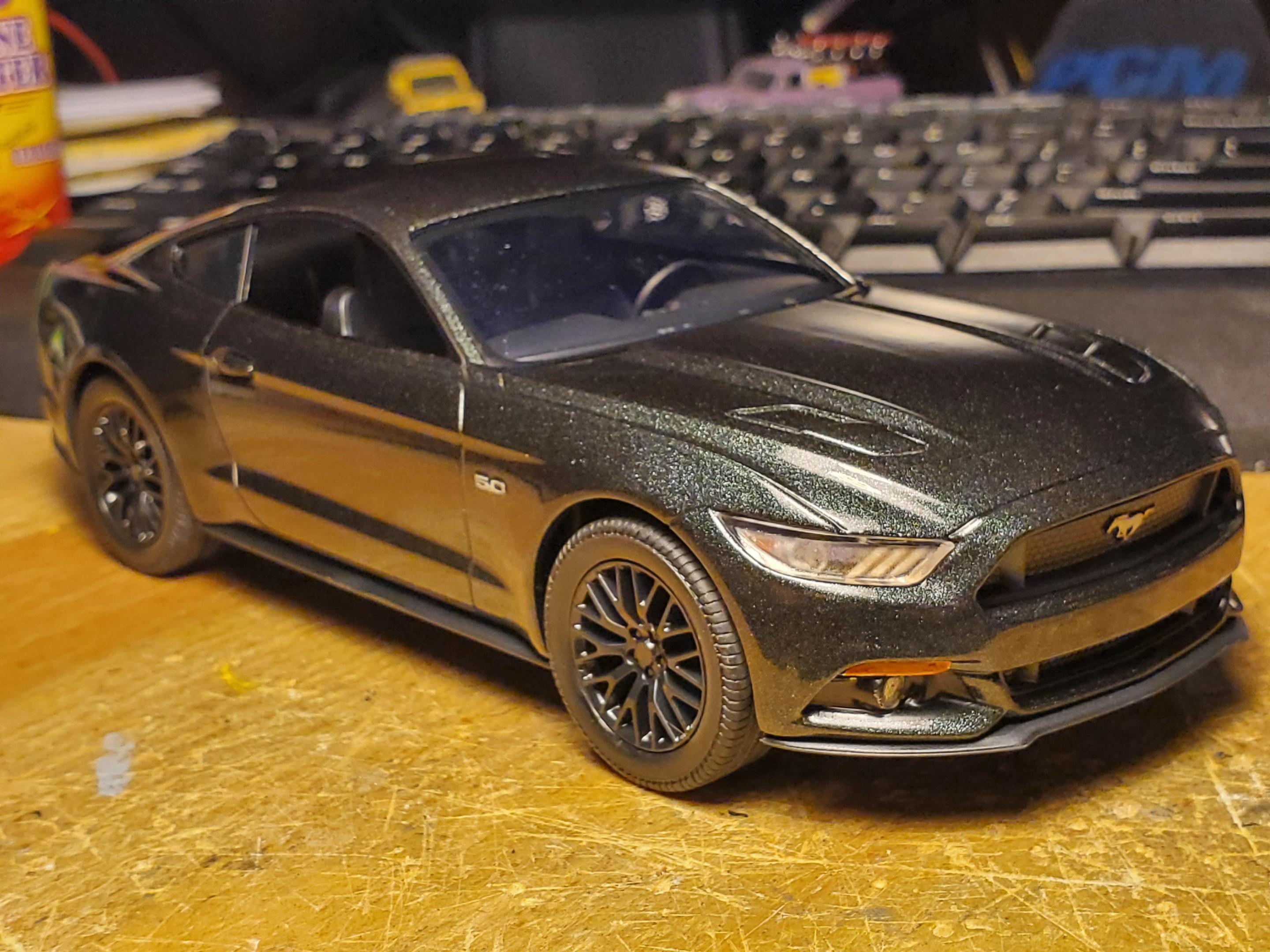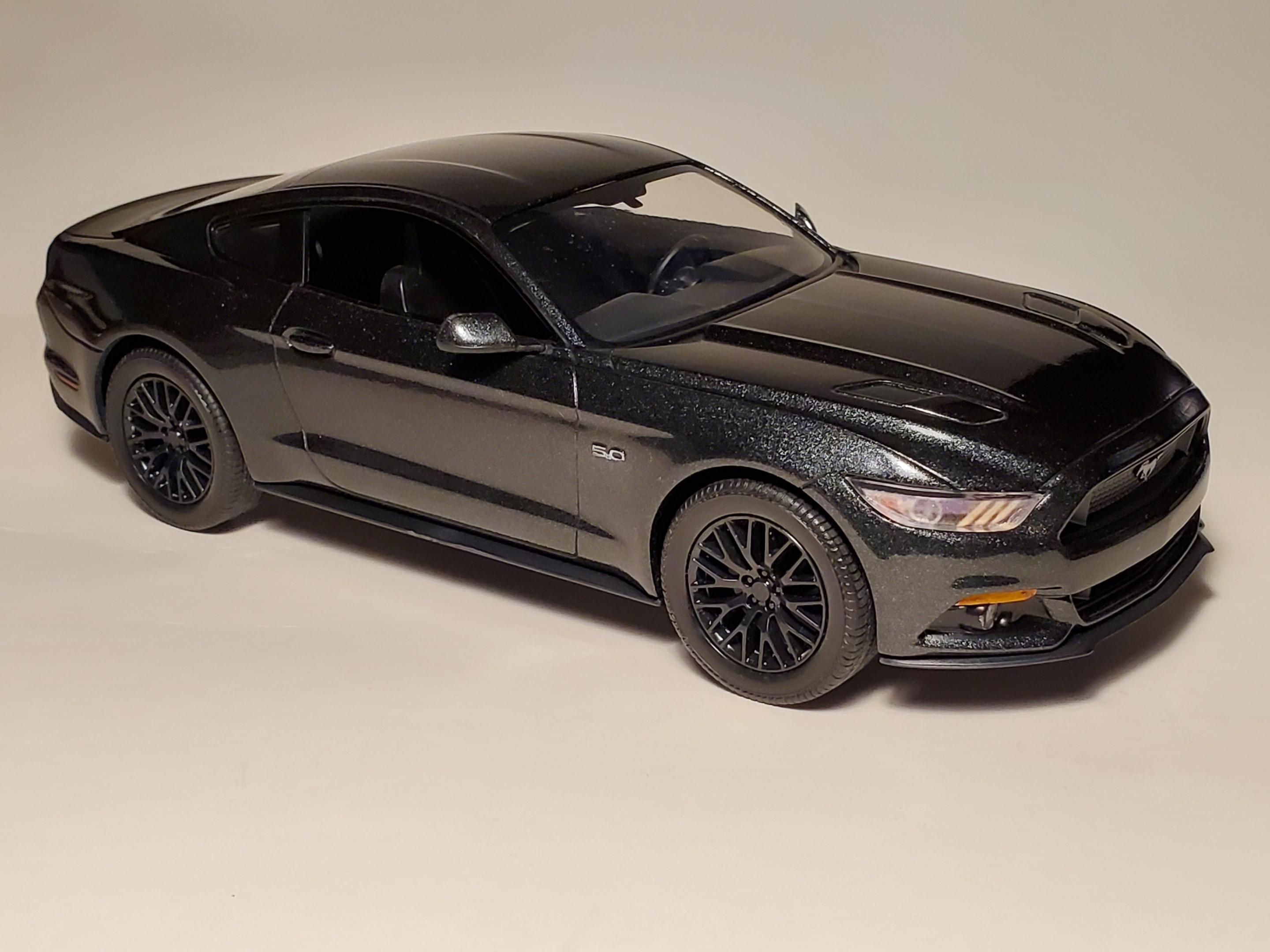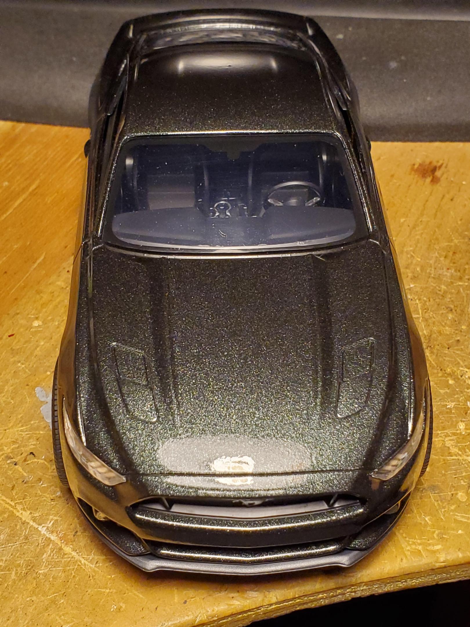 Another one from my archives of somewhat recent builds. This is the Revell basic builder/snap kit, molded in yellow. I love the color these came in called "Guard Metallic" which is sort of a green with a gray tint to it. Anyway, I loved that color so much I had some mixed in basecoat. I foiled the emblems before paint and sanded the paint off before clear. Detailed the window trim, all the lights, and even printed some headlights on paper to put behind the clear lenses to make it look a little better. Interior has basic details painted. I later 3d printed some mirrors for the 2015-up Mustangs and painted those and cleared them, and glued them on the car. So most of these pics, the car won't have door mirrors. The paint is auto body supply mixed basecoat/2k clear out of a rattle can. I painted the windows and wheels with Future to give them a more glossy look. The windows in these kits are really flat-clear looking. Enjoy