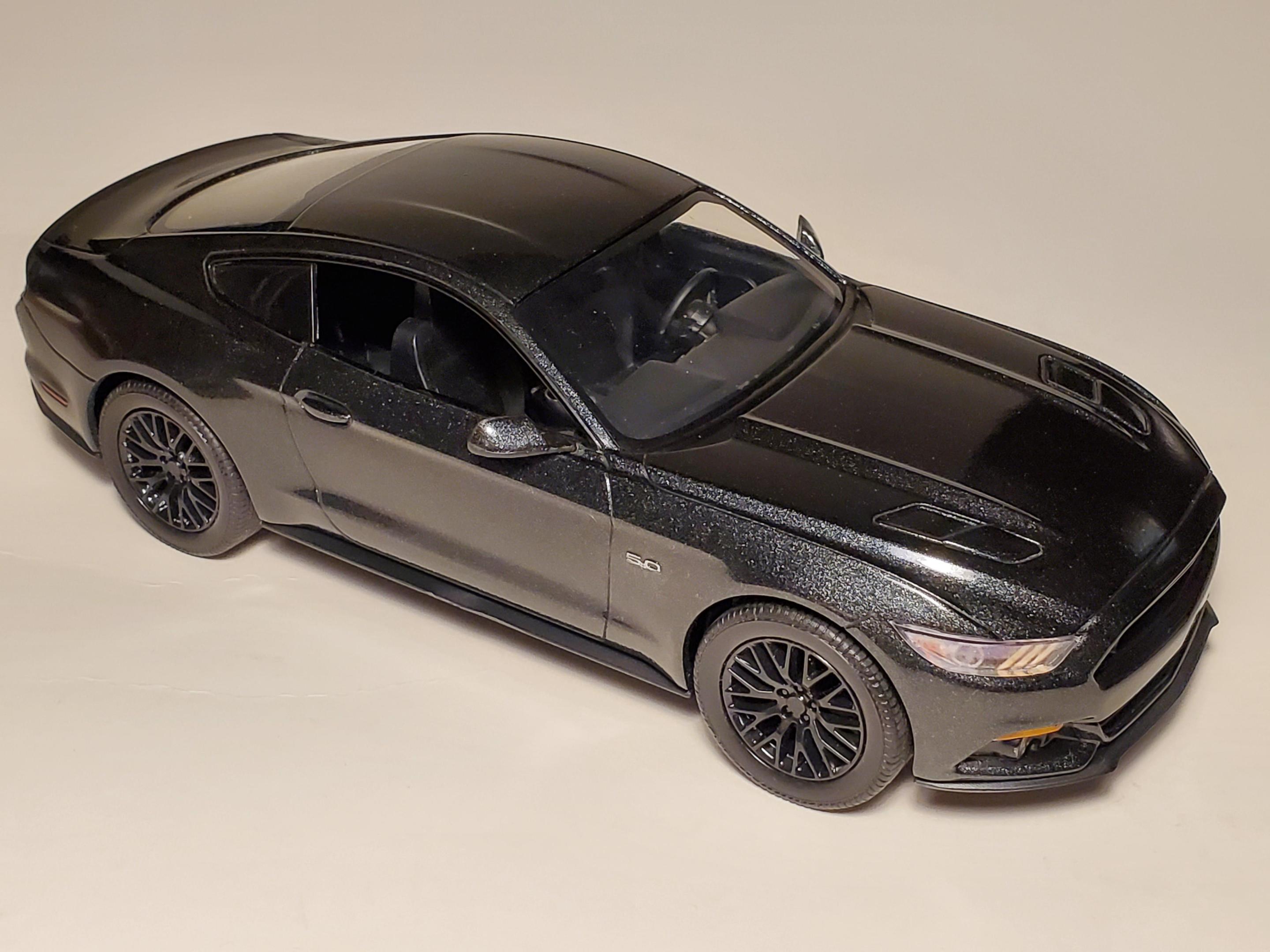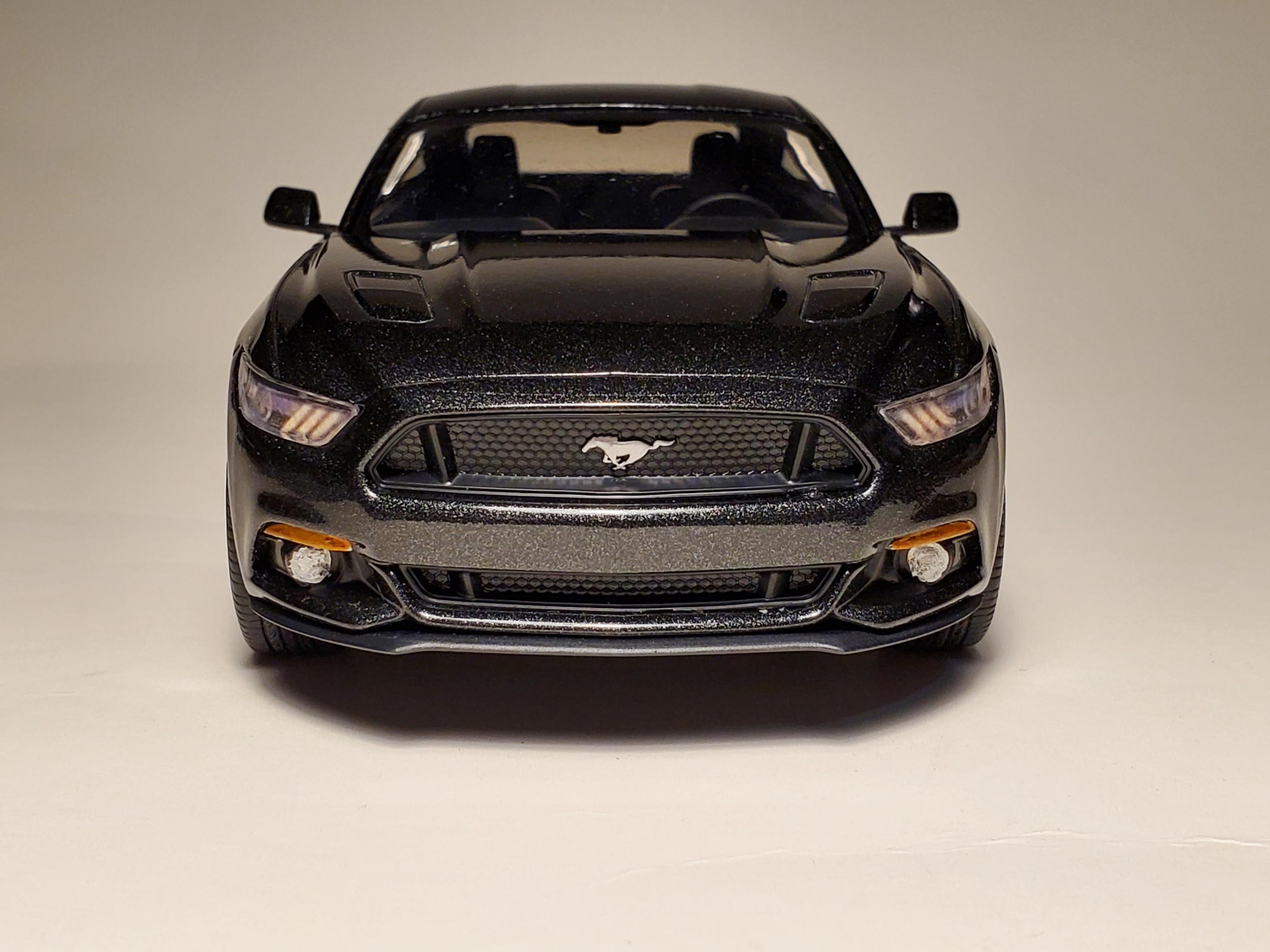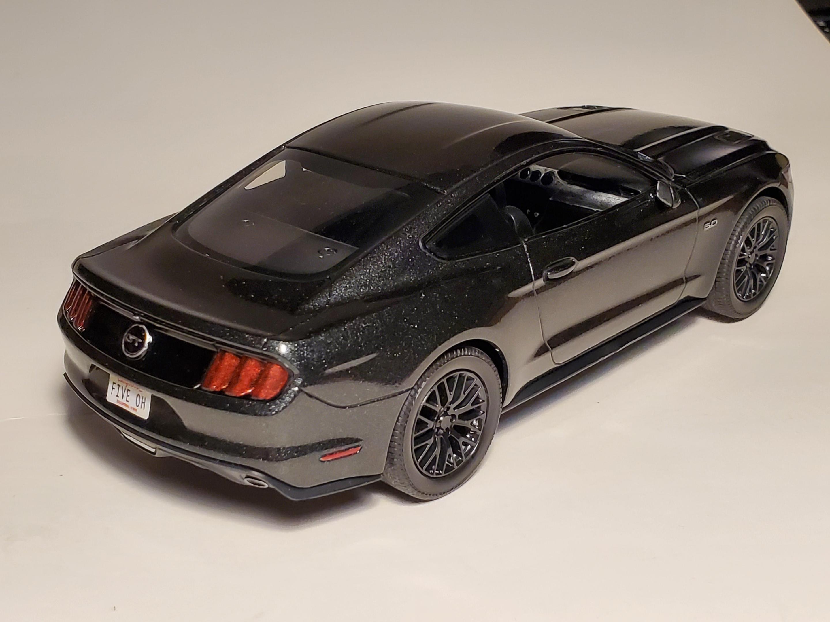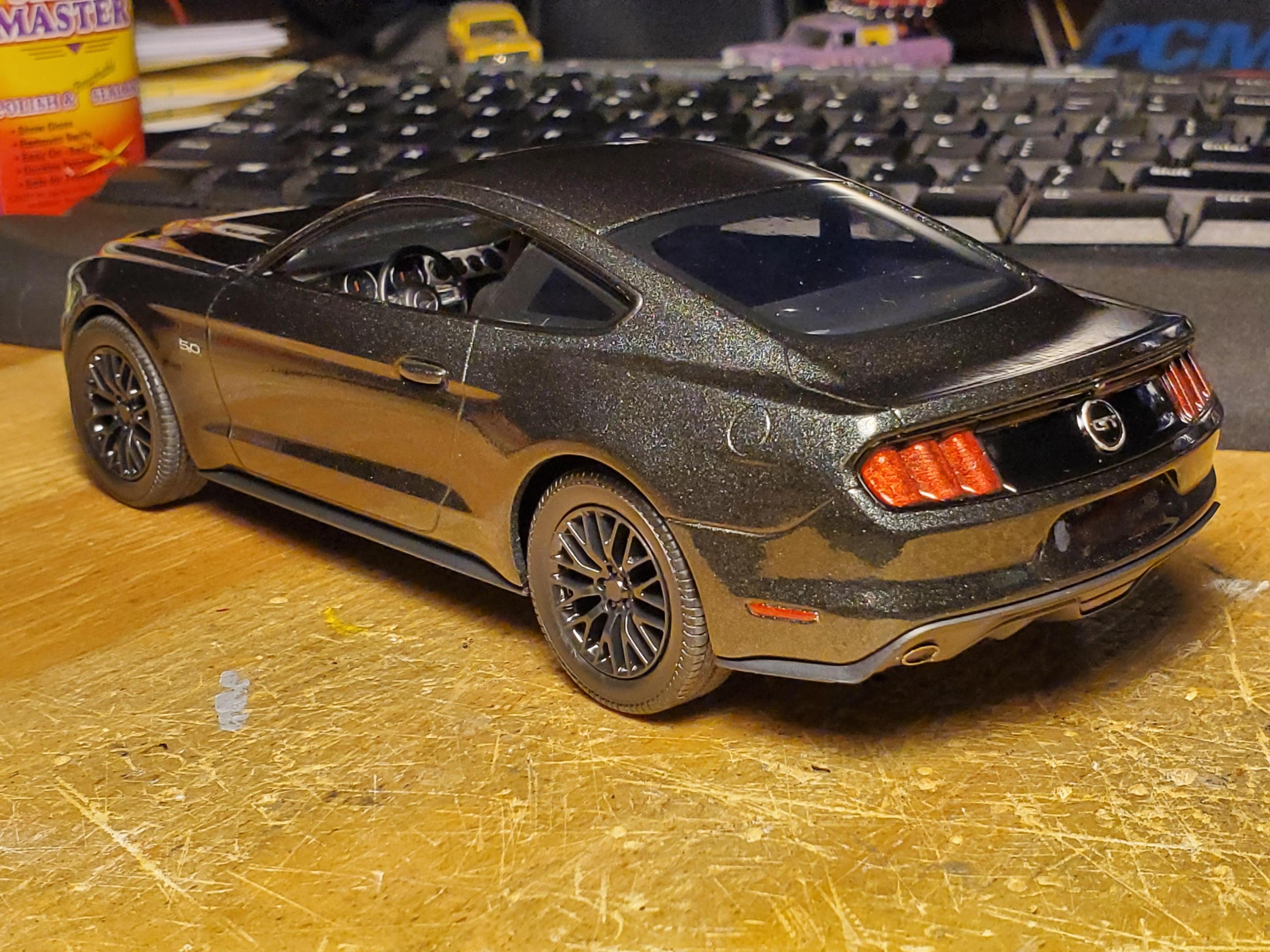 Another one from my archives of somewhat recent builds. This is the Revell basic builder/snap kit, molded in yellow. I love the color these came in called "Guard Metallic" which is sort of a green with a gray tint to it. Anyway, I loved that color so much I had some mixed in basecoat. I foiled the emblems before paint and sanded the paint off before clear. Detailed the window trim, all the lights, and even printed some headlights on paper to put behind the clear lenses to make it look a little better. Interior has basic details painted. I later 3d printed some mirrors for the 2015-up Mustangs and painted those and cleared them, and glued them on the car. So most of these pics, the car won't have door mirrors. The paint is auto body supply mixed basecoat/2k clear out of a rattle can. I painted the windows and wheels with Future to give them a more glossy look. The windows in these kits are really flat-clear looking. Enjoy