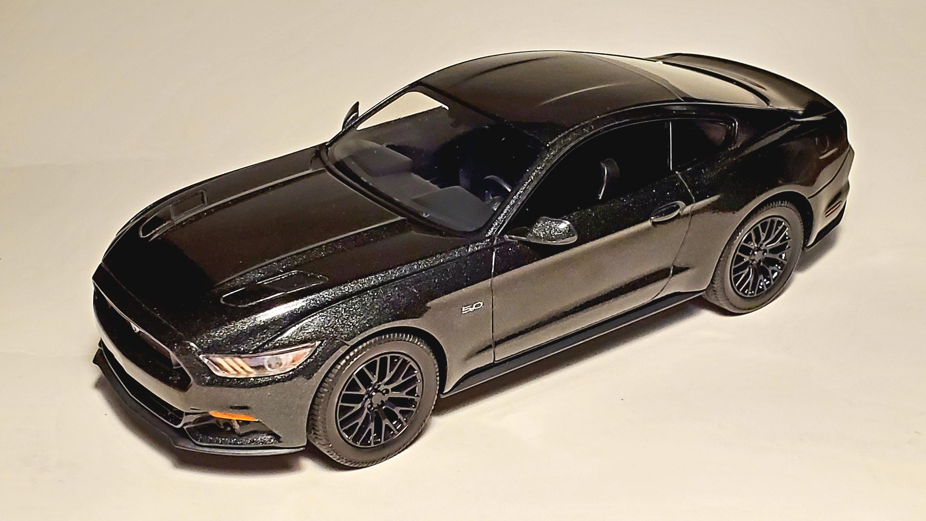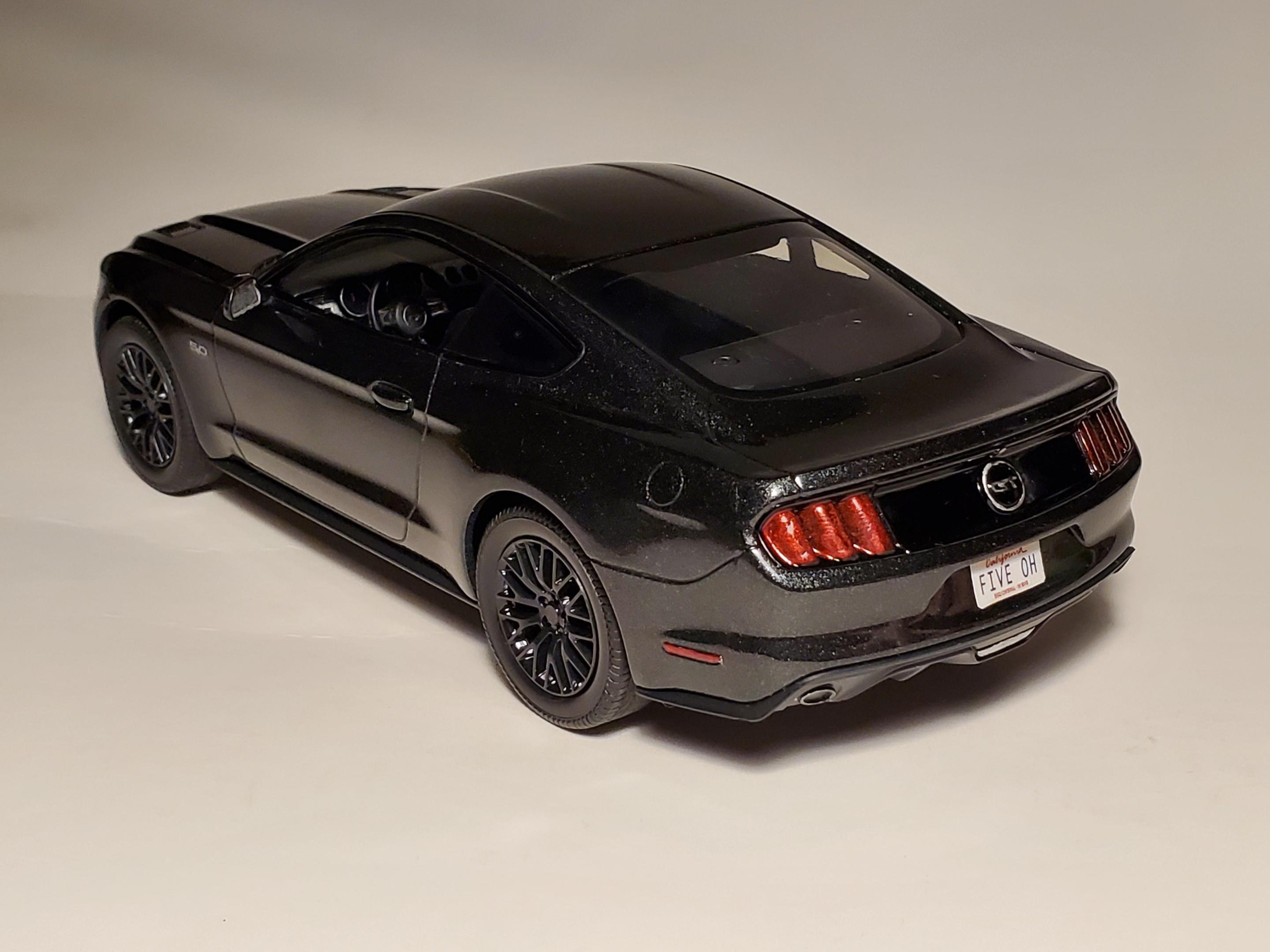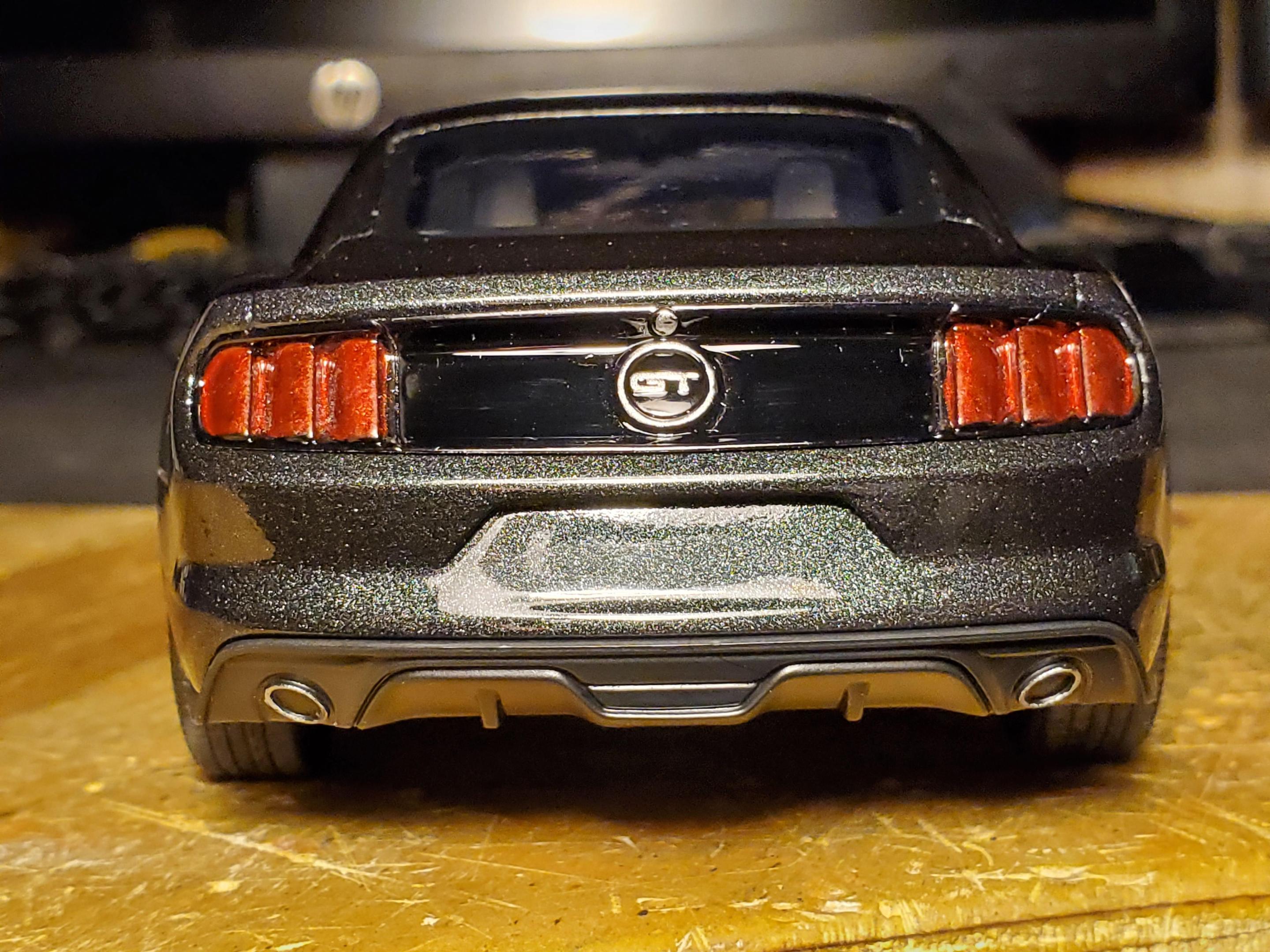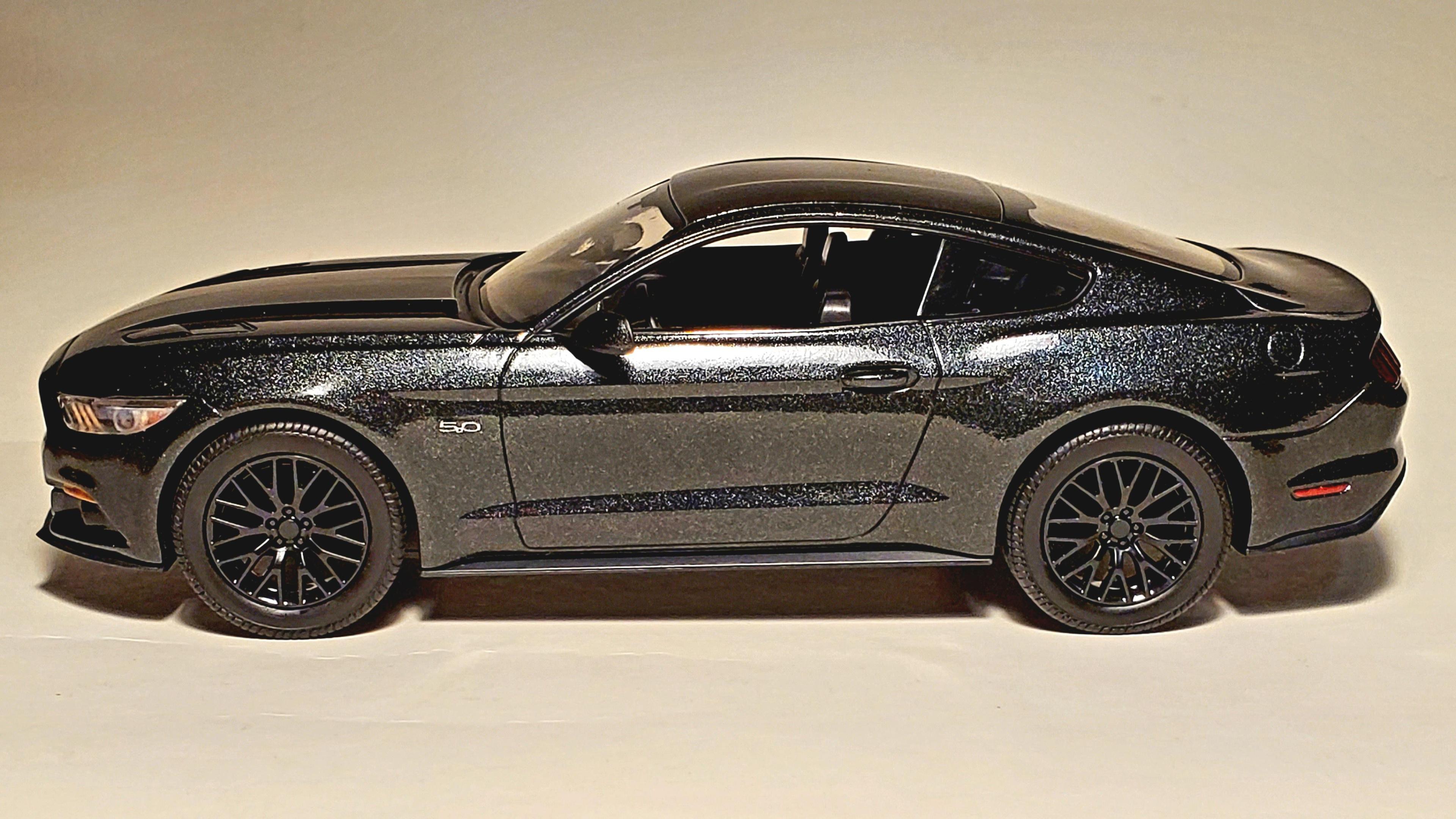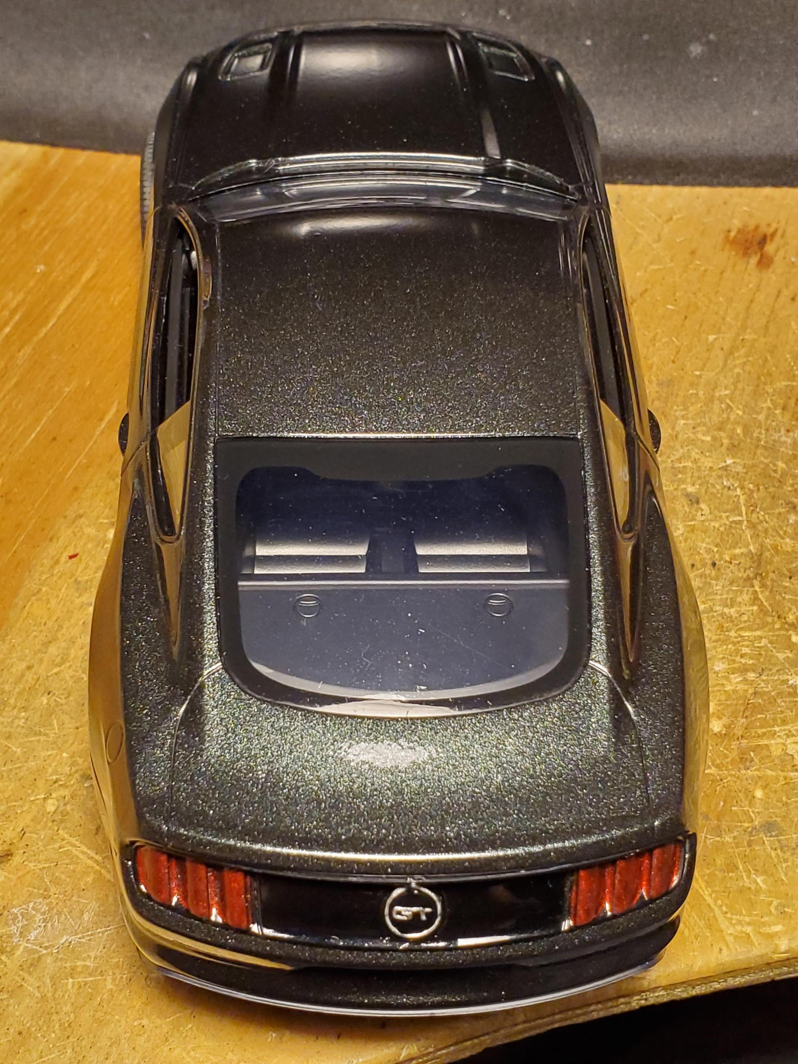 Another one from my archives of somewhat recent builds. This is the Revell basic builder/snap kit, molded in yellow. I love the color these came in called "Guard Metallic" which is sort of a green with a gray tint to it. Anyway, I loved that color so much I had some mixed in basecoat. I foiled the emblems before paint and sanded the paint off before clear. Detailed the window trim, all the lights, and even printed some headlights on paper to put behind the clear lenses to make it look a little better. Interior has basic details painted. I later 3d printed some mirrors for the 2015-up Mustangs and painted those and cleared them, and glued them on the car. So most of these pics, the car won't have door mirrors. The paint is auto body supply mixed basecoat/2k clear out of a rattle can. I painted the windows and wheels with Future to give them a more glossy look. The windows in these kits are really flat-clear looking. Enjoy