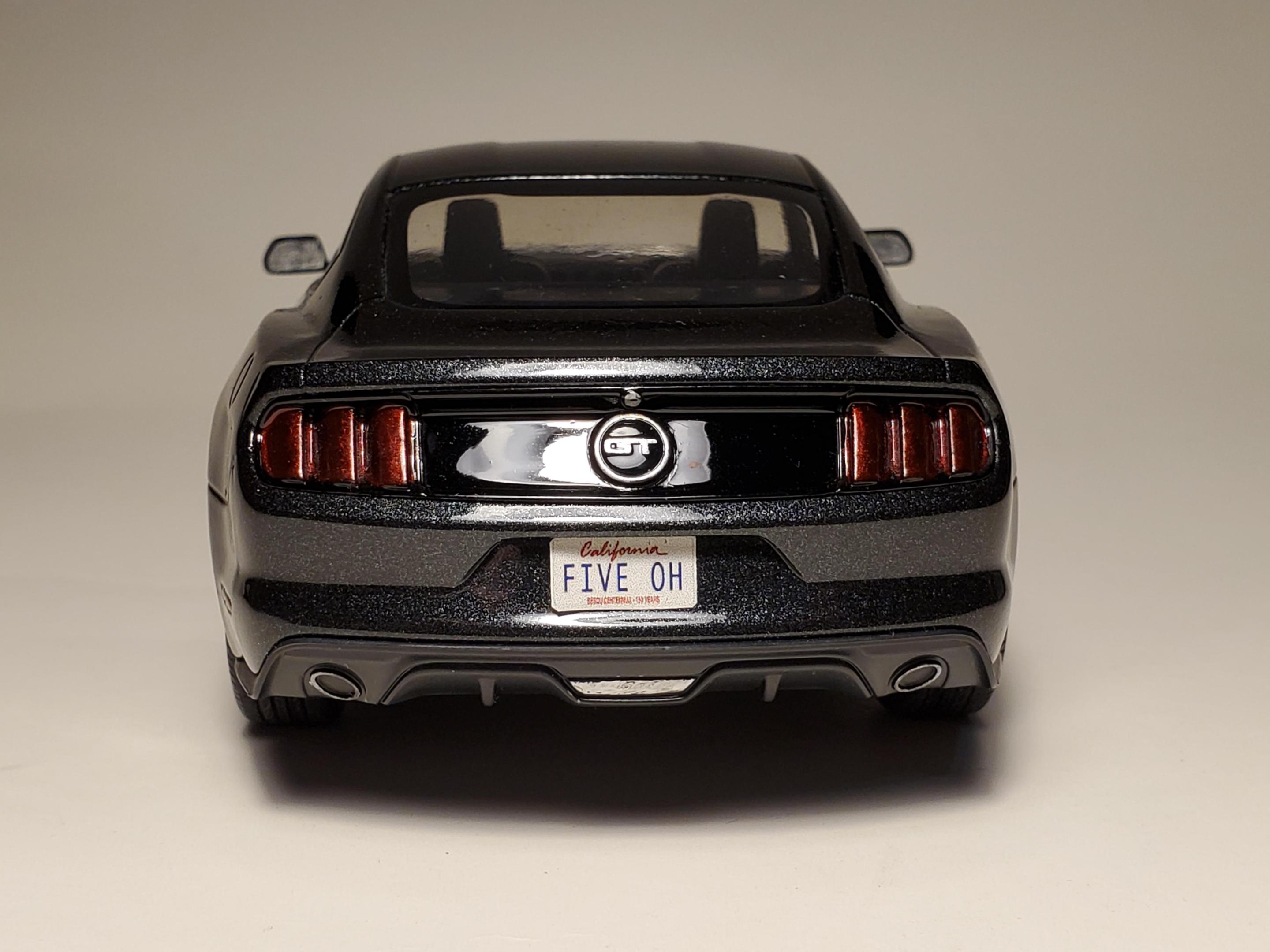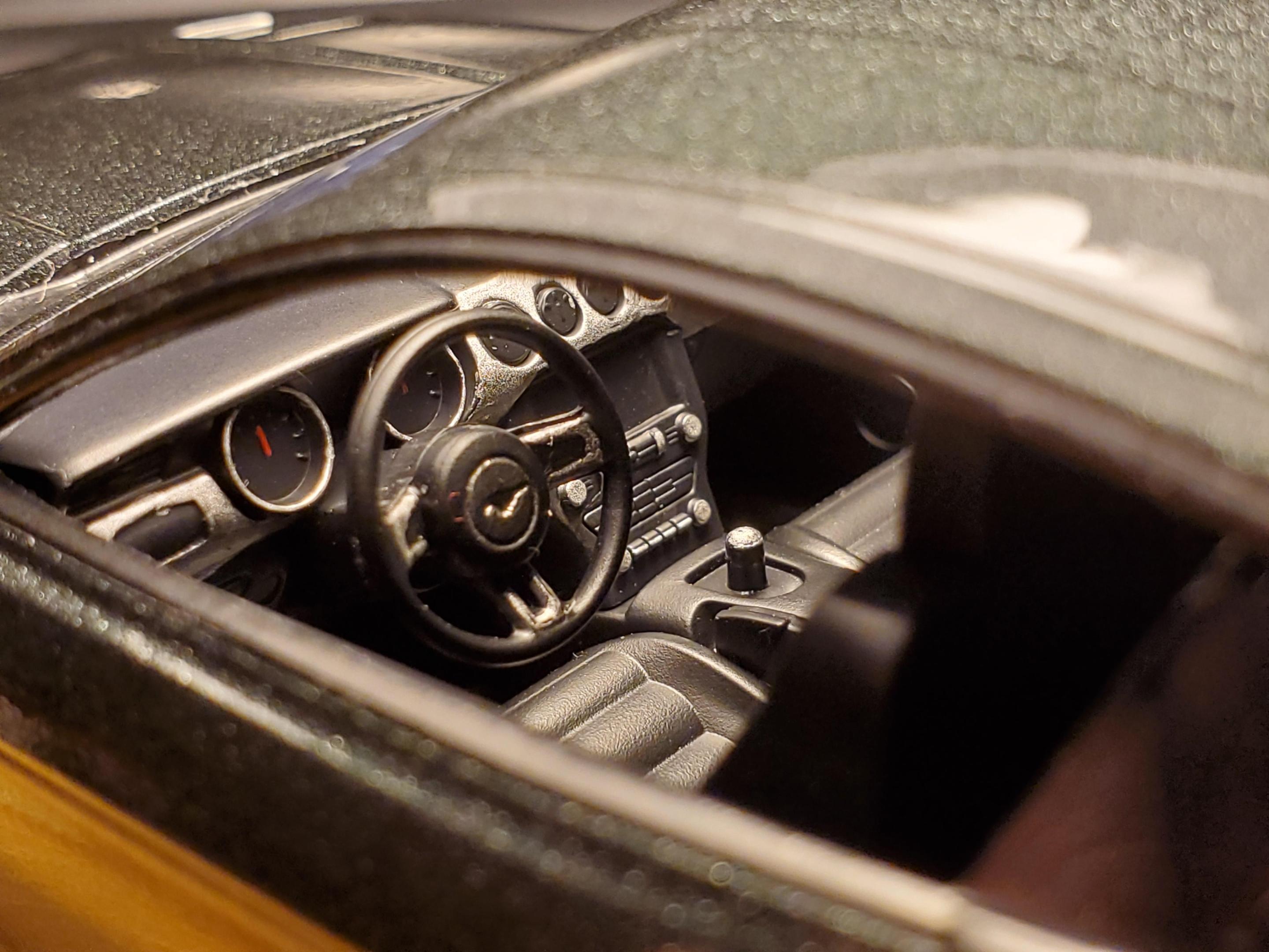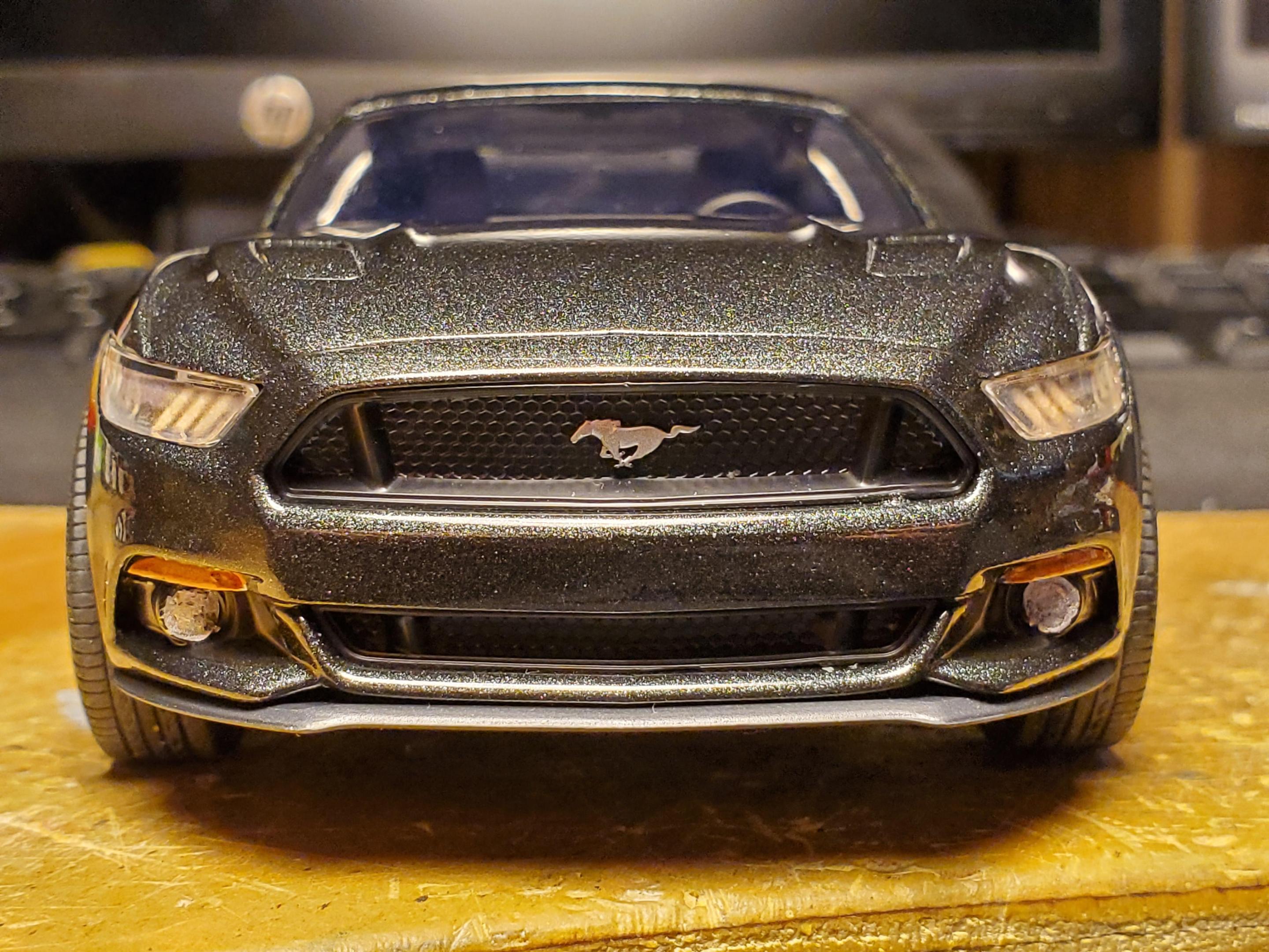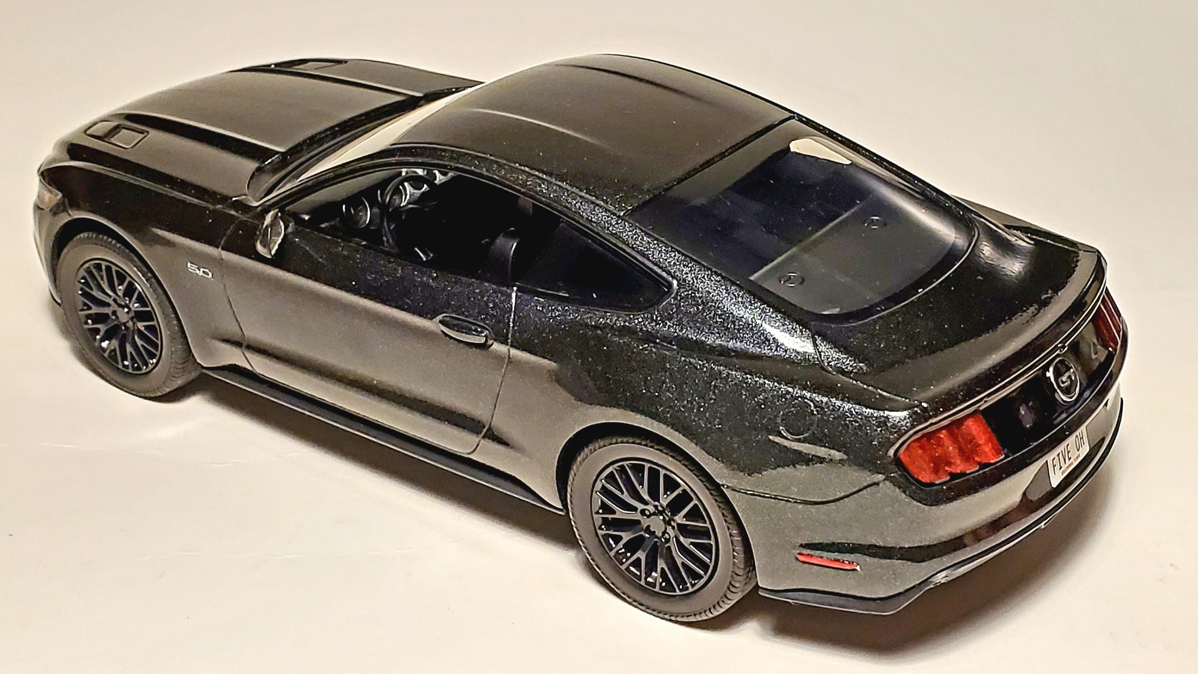 Another one from my archives of somewhat recent builds. This is the Revell basic builder/snap kit, molded in yellow. I love the color these came in called "Guard Metallic" which is sort of a green with a gray tint to it. Anyway, I loved that color so much I had some mixed in basecoat. I foiled the emblems before paint and sanded the paint off before clear. Detailed the window trim, all the lights, and even printed some headlights on paper to put behind the clear lenses to make it look a little better. Interior has basic details painted. I later 3d printed some mirrors for the 2015-up Mustangs and painted those and cleared them, and glued them on the car. So most of these pics, the car won't have door mirrors. The paint is auto body supply mixed basecoat/2k clear out of a rattle can. I painted the windows and wheels with Future to give them a more glossy look. The windows in these kits are really flat-clear looking. Enjoy