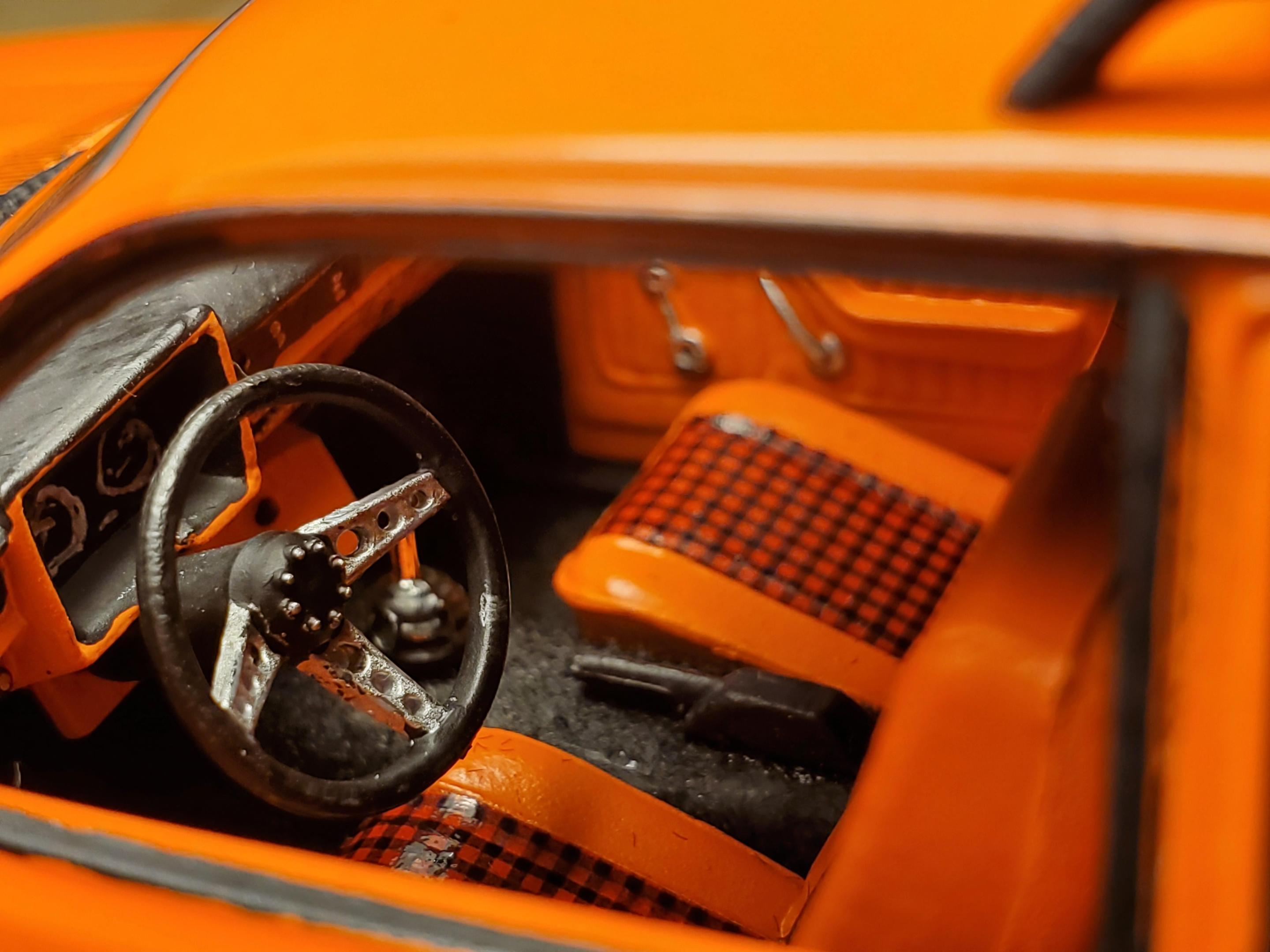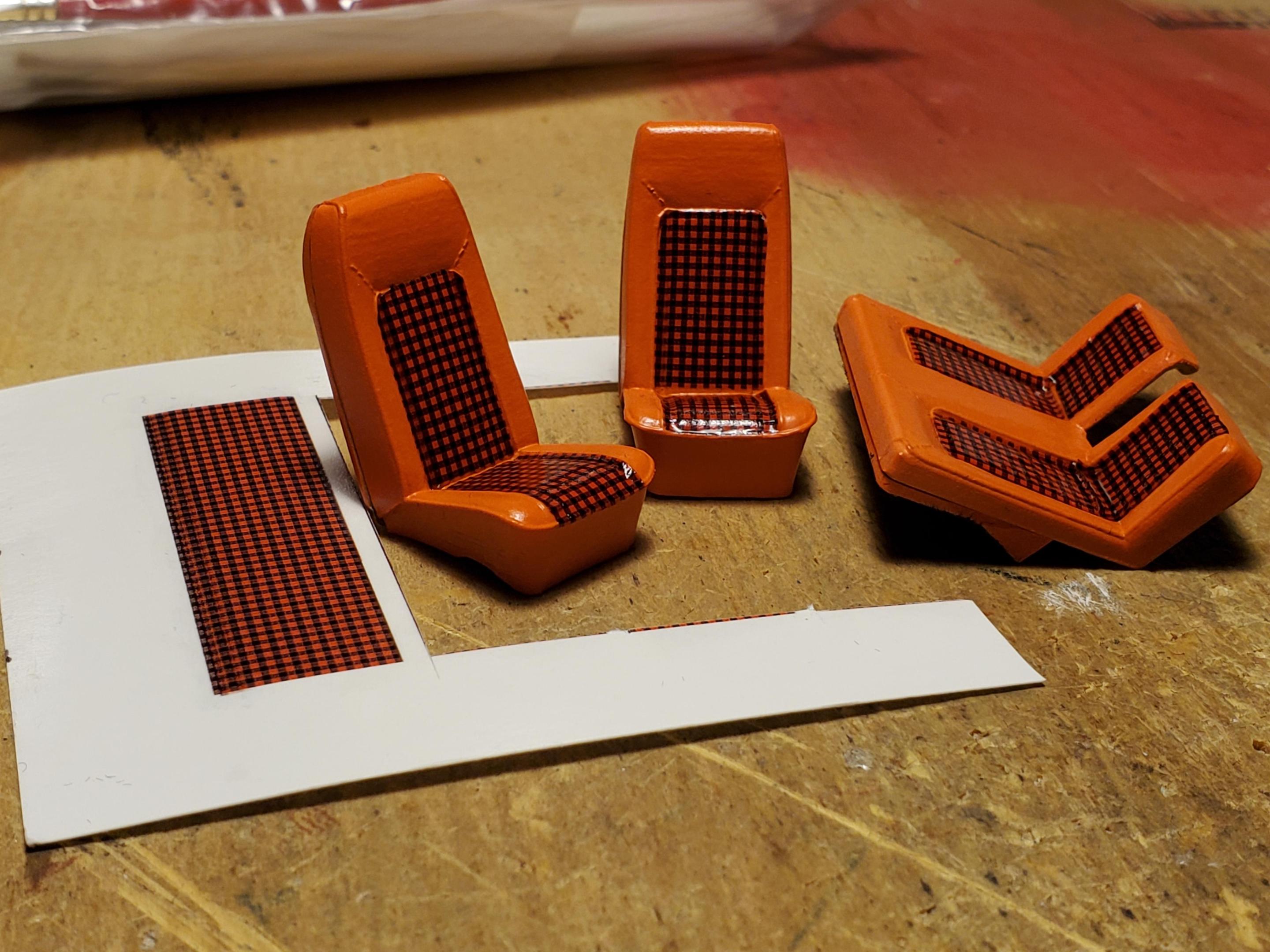 I started a build thread on this car way back in 2016. Well, I painted it and put it back in the box. Got out of models for a short period of time while my job got busy. Last year I finished it. I made my own seat decals, used a M.A.D. distributor for a 4cyl and that's really about it. Paint is rattle can lacquer mixed at the auto body supply store right before they stopped doing lacquer forever. Cleared with Tamiya clear and polished out. I later added a license plate but I don't have a pic of it with it. Here's a pic of my seat decals. I went on the internet and googled orange plaid and found this. Copy and pasted a bunch of them together in the size I liked, and cut them out/trimmed them to fit.