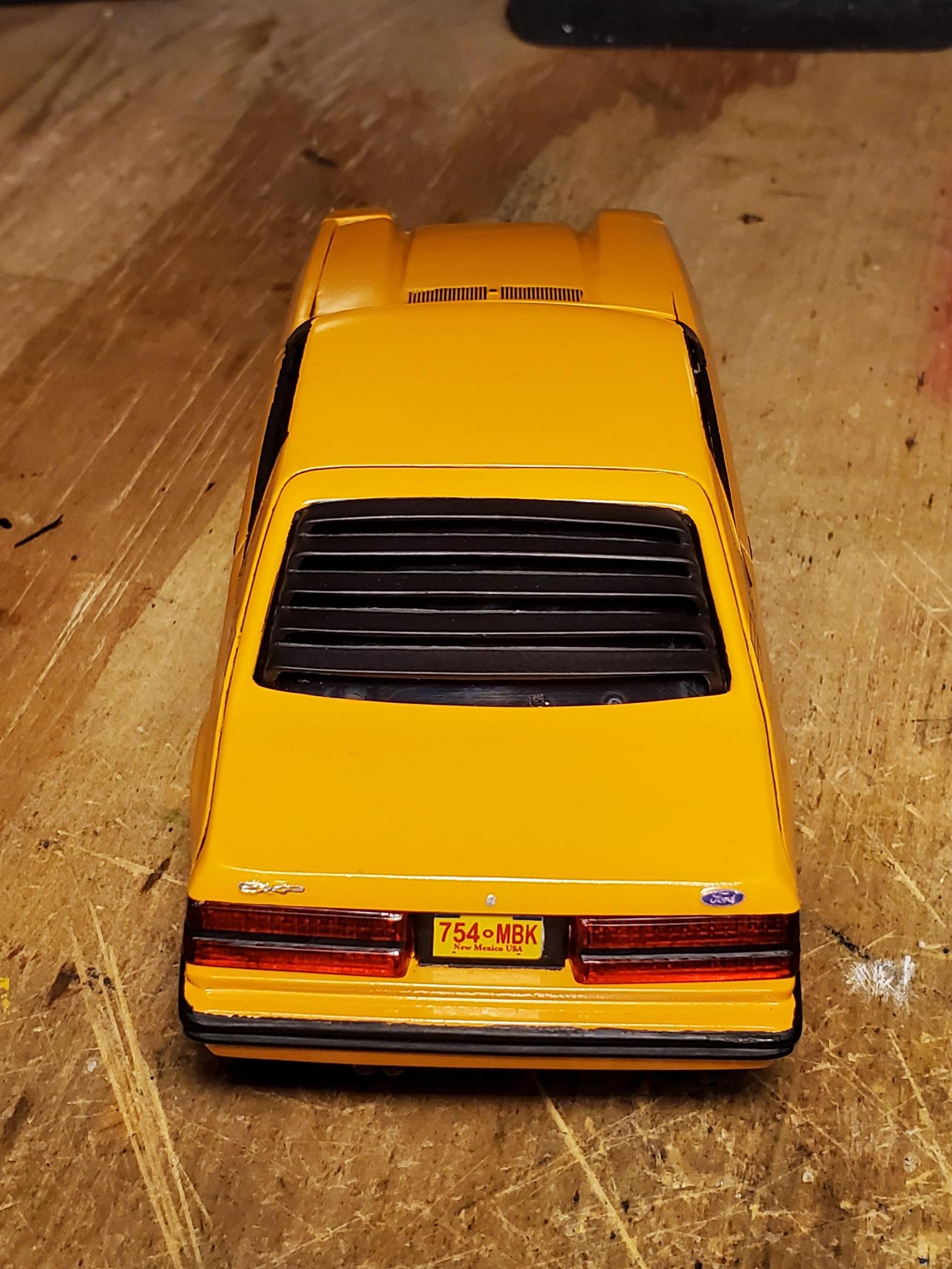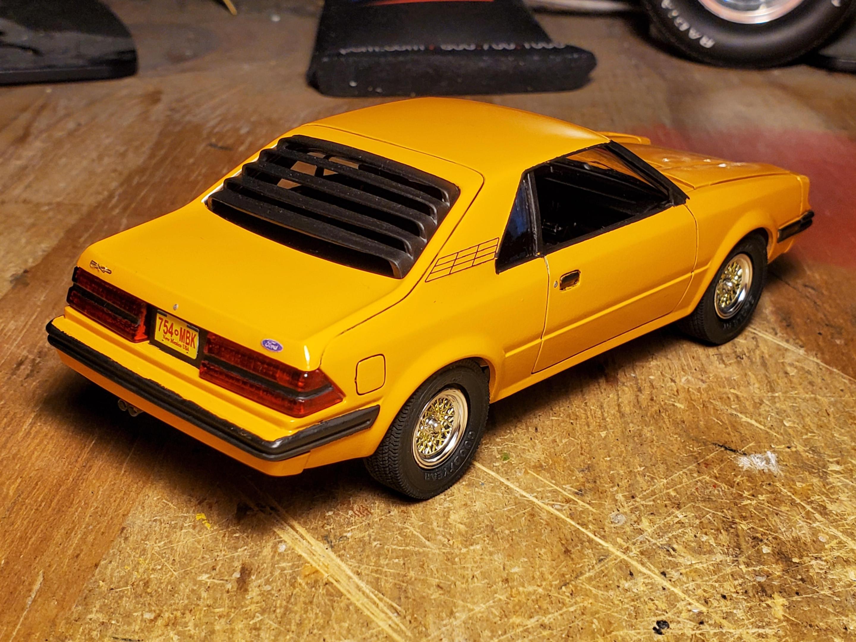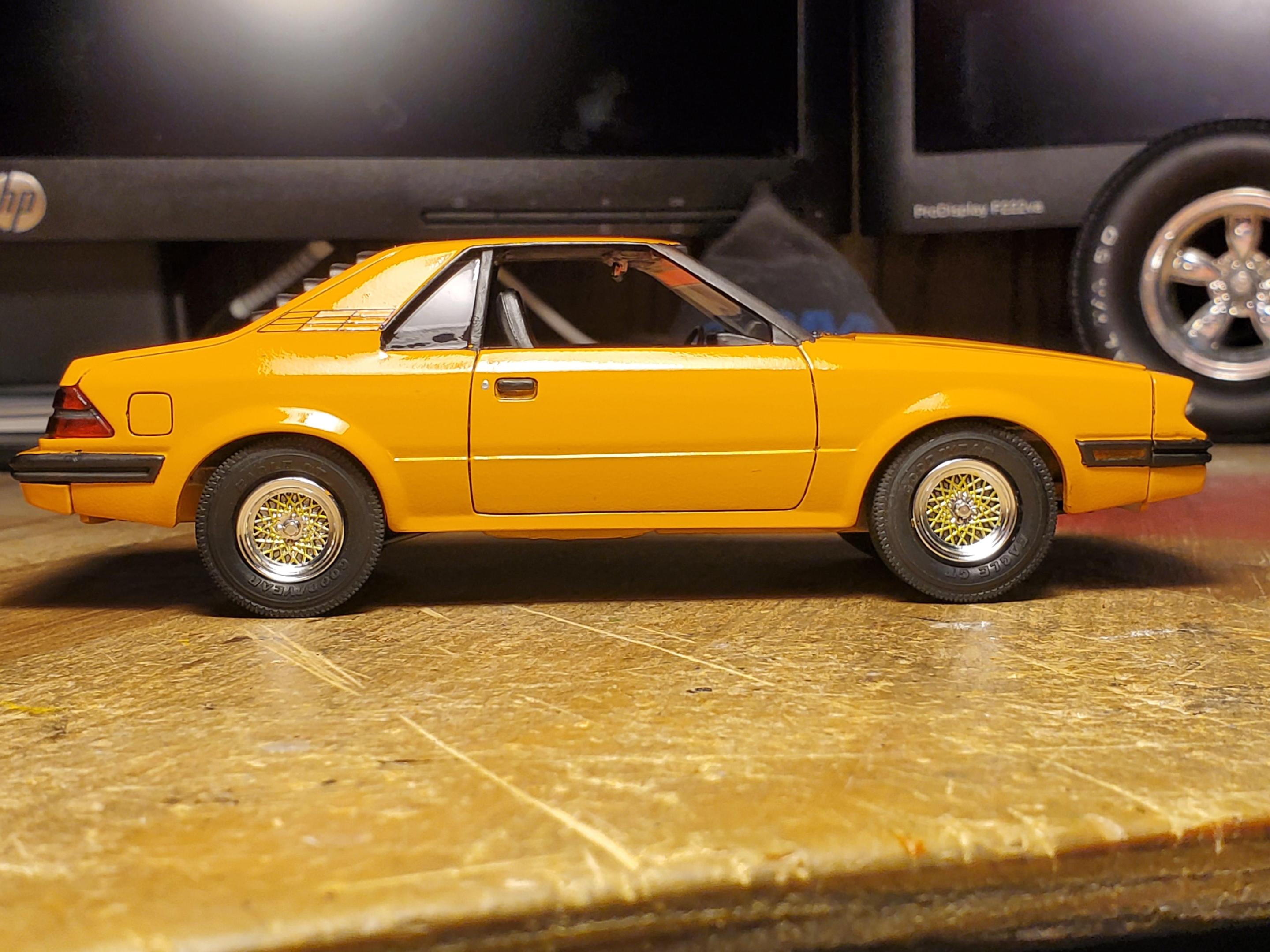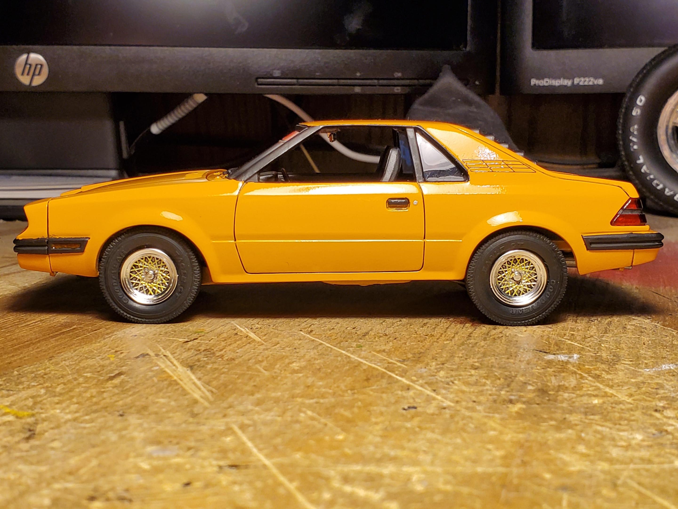 I must have been in an "Orange Mood" in 2016 because I painted several vehicles in varying shades of orange or yellow. This being one of them. MPC '83 Ford EXP. I used some spares from a RaysKits Decal sheet for some detail on this one. Used the Banks turbo kit that came with it and the optional wheels. The tires in the kit were much like some Taco Bell I've had before.... that being, Melty. They were sticking to everything that touched them. Thankfully none of the kit was damaged but I had to toss the tires. Which I didn't like because I really wanted to use them. So I had to settle for some Revell tires that somewhat fit the wheels but look the part. Color is Ford Bright Caramel basecoat with 2k clear. All from a rattle can. I taped off the trim and used a brush to make the trim all black. It was a little messy but the best way I could do it. I used a M.A.D. Distributor for a 4cyl as well. The rest of it is pretty much as the kit comes. OH, and I forgot to clear the mirrors when I finished the car, and so they got cleared much, much later, but they ARE on the car NOW just not in the pics here.