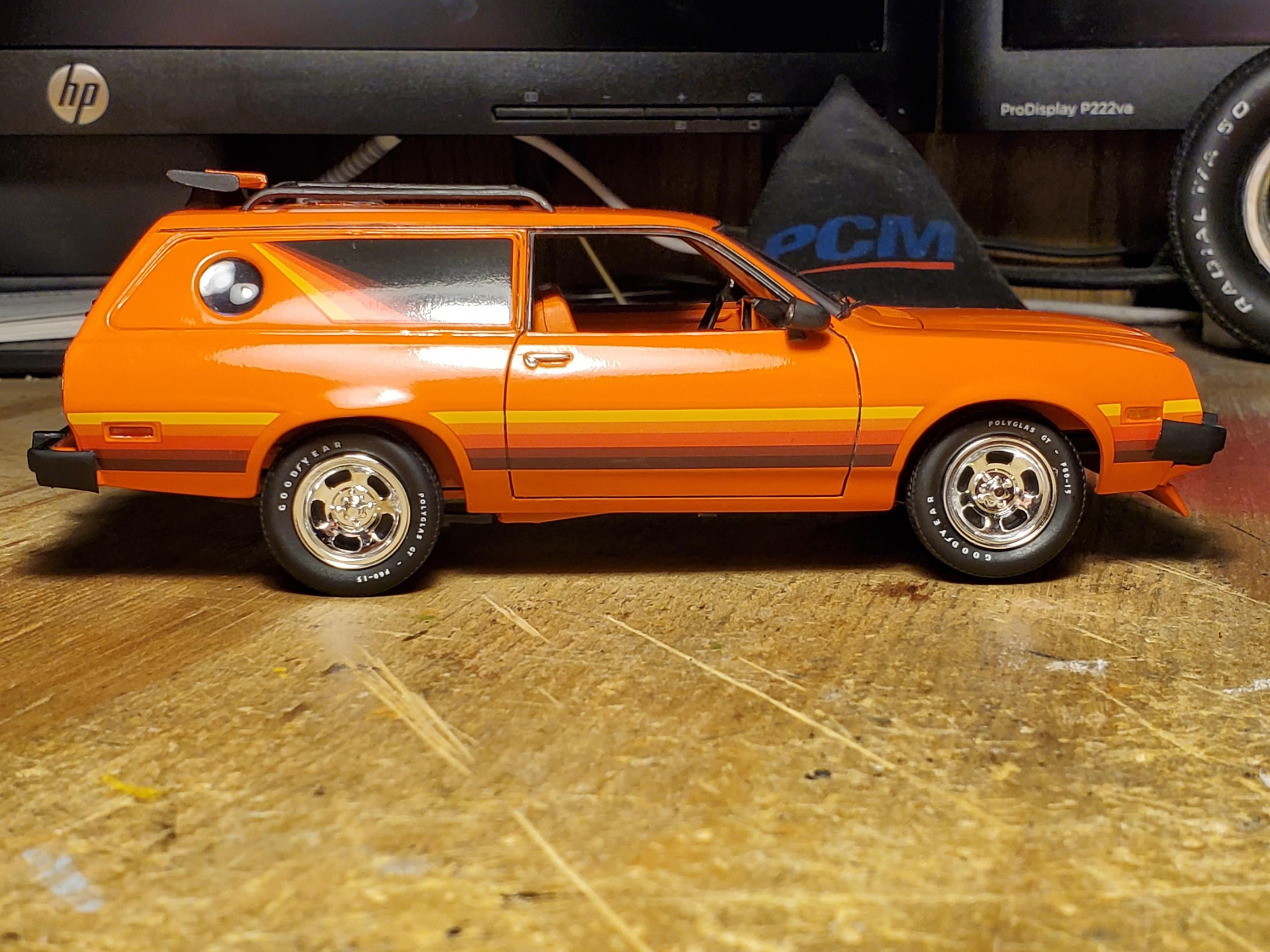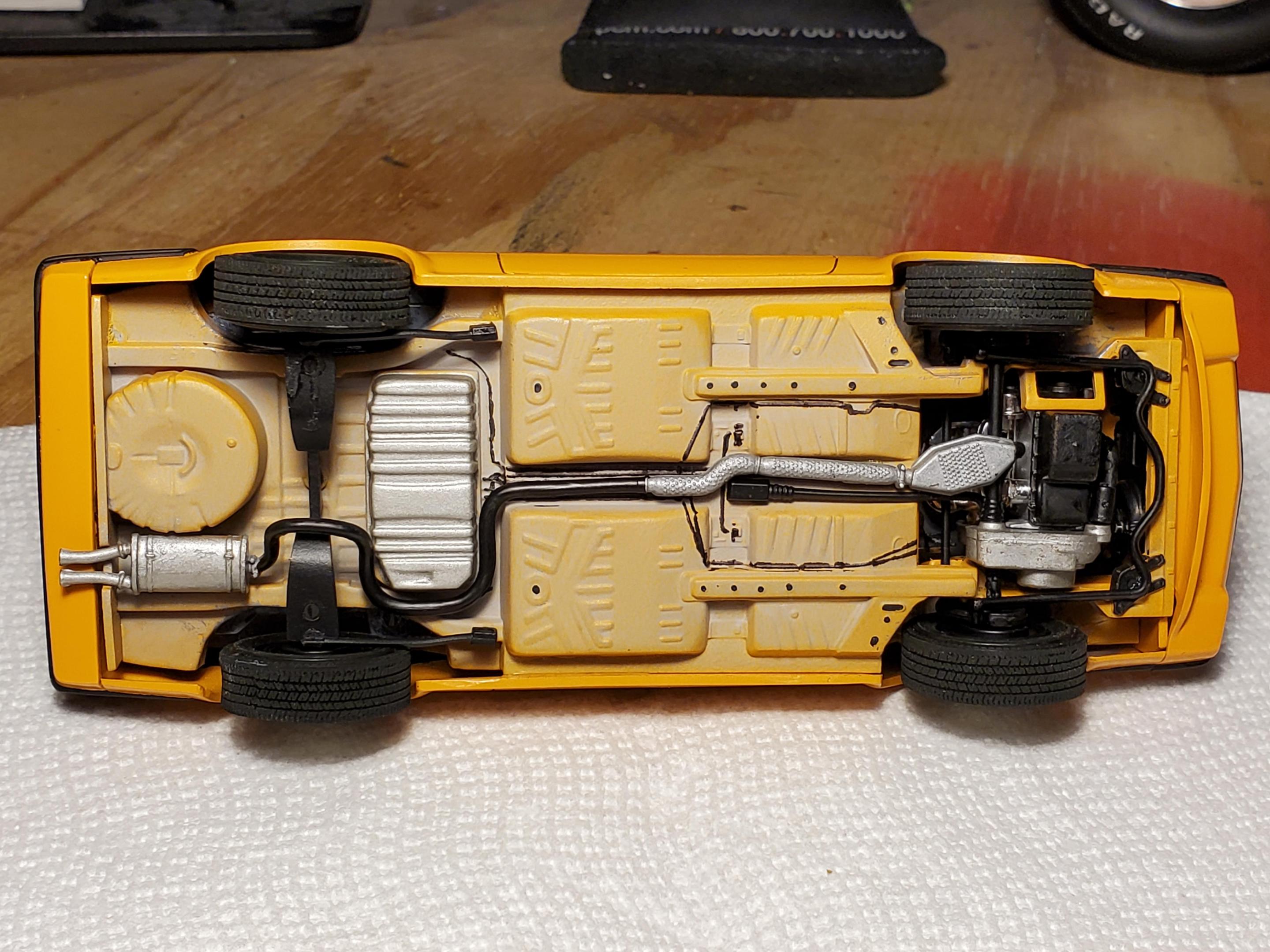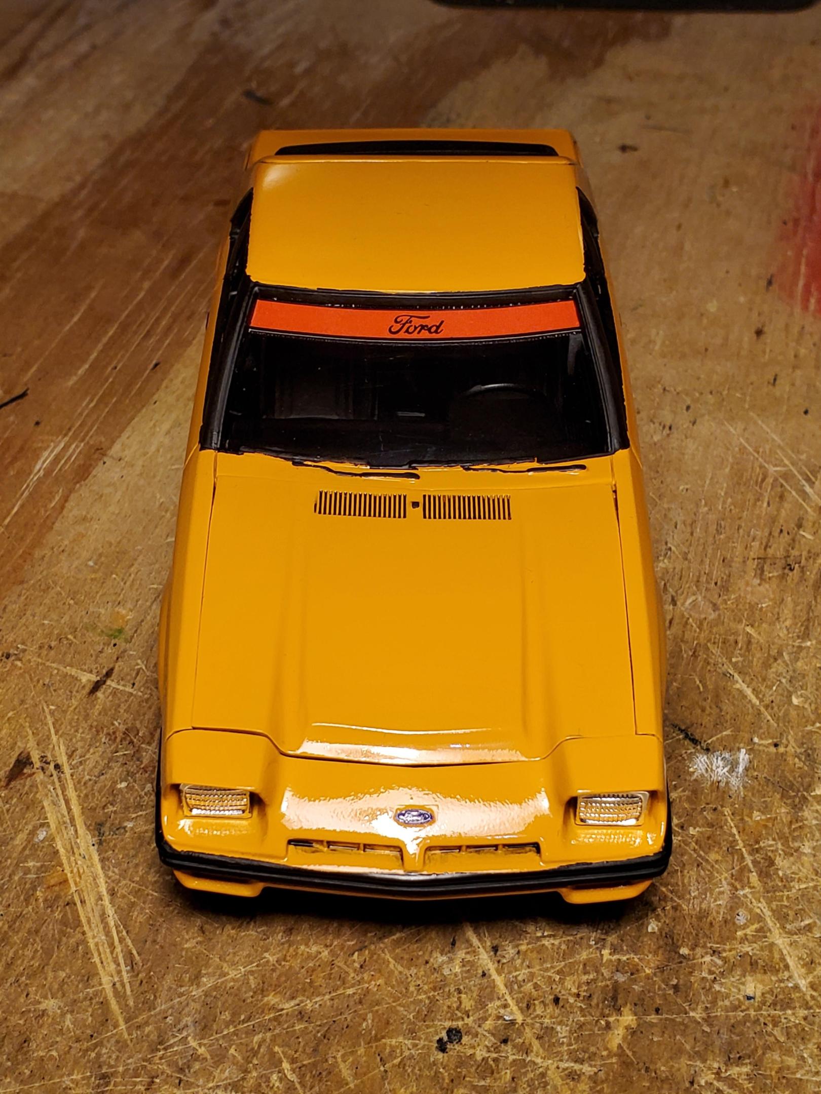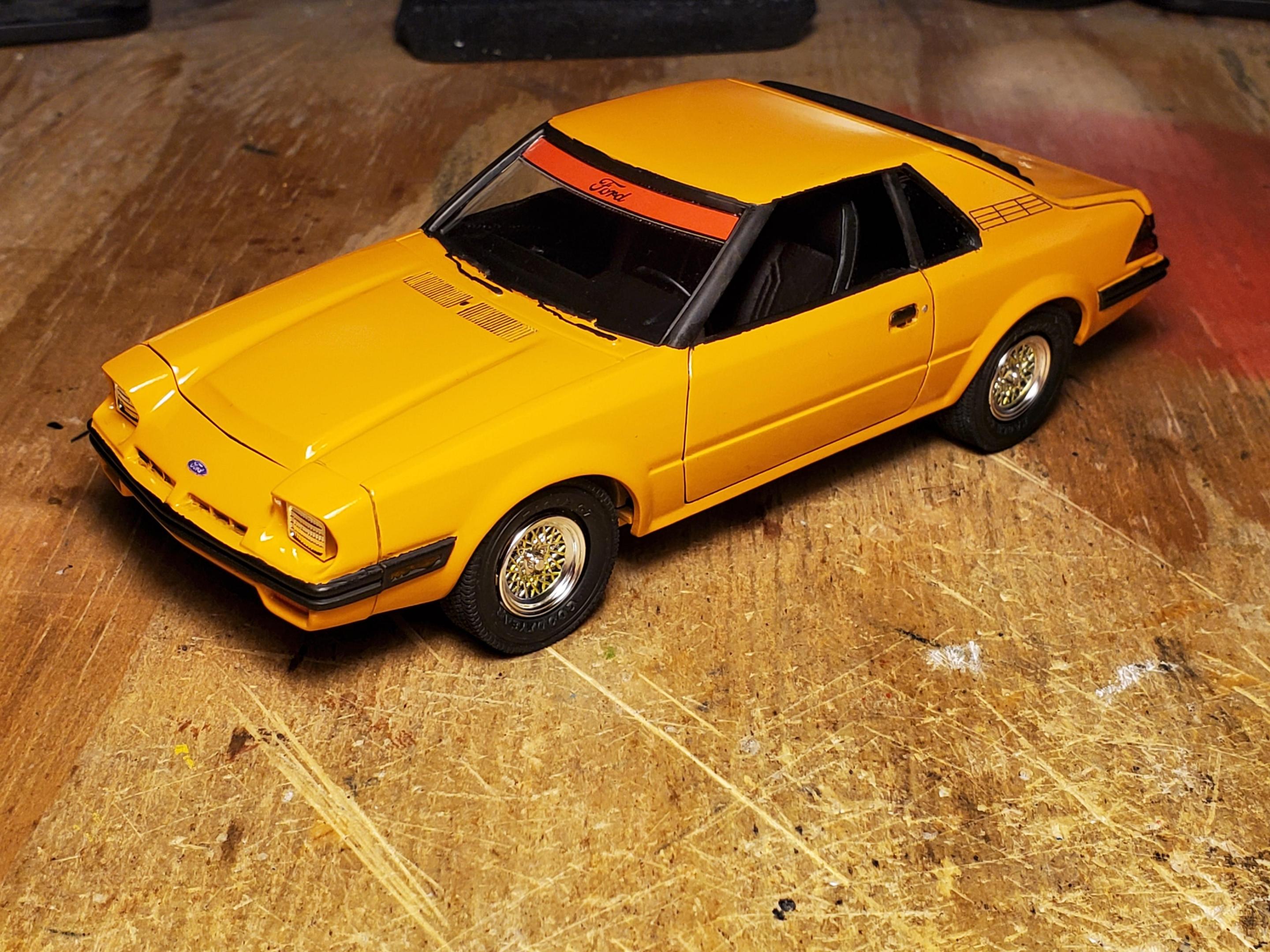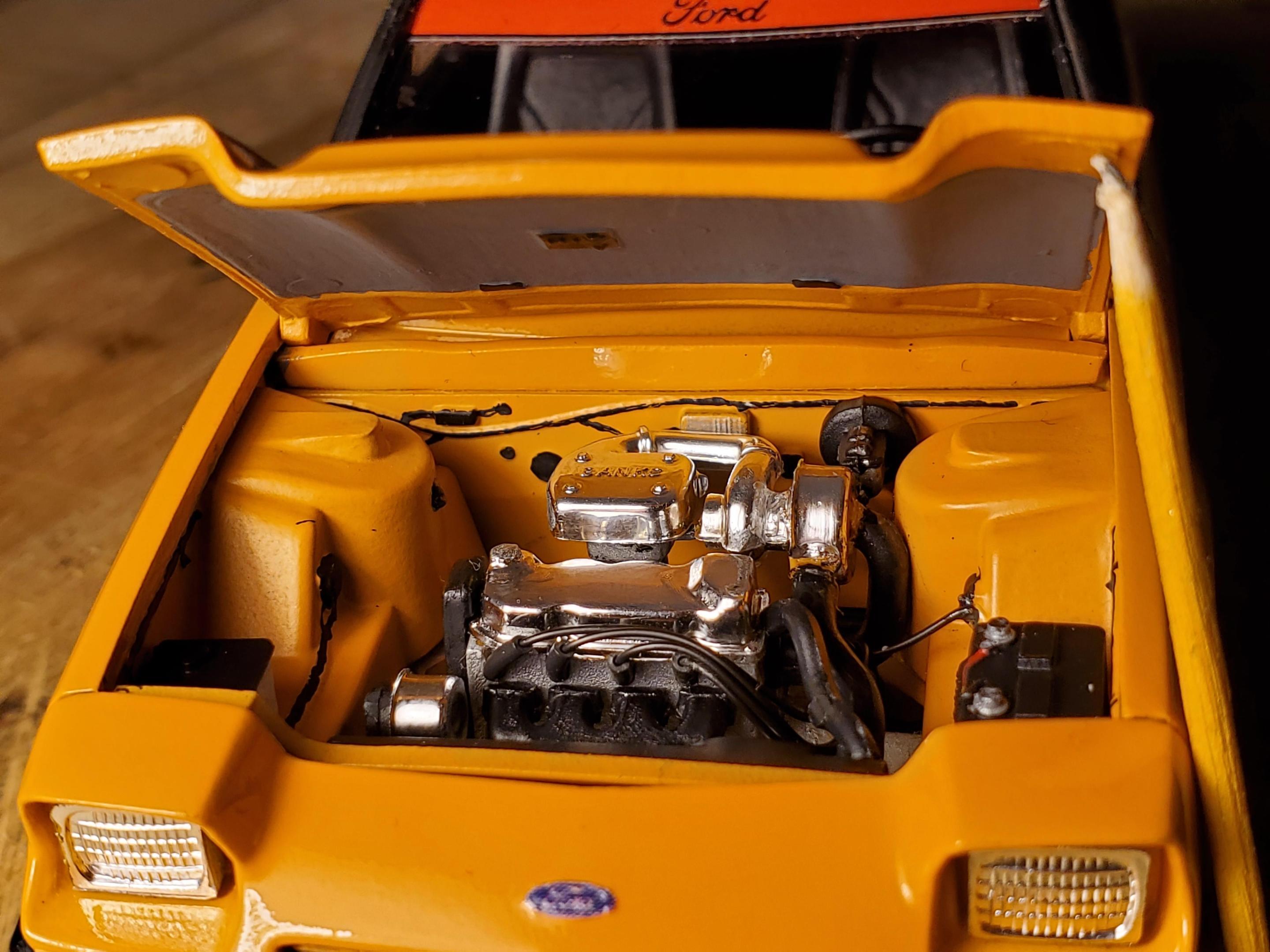 I must have been in an "Orange Mood" in 2016 because I painted several vehicles in varying shades of orange or yellow. This being one of them. MPC '83 Ford EXP. I used some spares from a RaysKits Decal sheet for some detail on this one. Used the Banks turbo kit that came with it and the optional wheels. The tires in the kit were much like some Taco Bell I've had before.... that being, Melty. They were sticking to everything that touched them. Thankfully none of the kit was damaged but I had to toss the tires. Which I didn't like because I really wanted to use them. So I had to settle for some Revell tires that somewhat fit the wheels but look the part. Color is Ford Bright Caramel basecoat with 2k clear. All from a rattle can. I taped off the trim and used a brush to make the trim all black. It was a little messy but the best way I could do it. I used a M.A.D. Distributor for a 4cyl as well. The rest of it is pretty much as the kit comes. OH, and I forgot to clear the mirrors when I finished the car, and so they got cleared much, much later, but they ARE on the car NOW just not in the pics here.