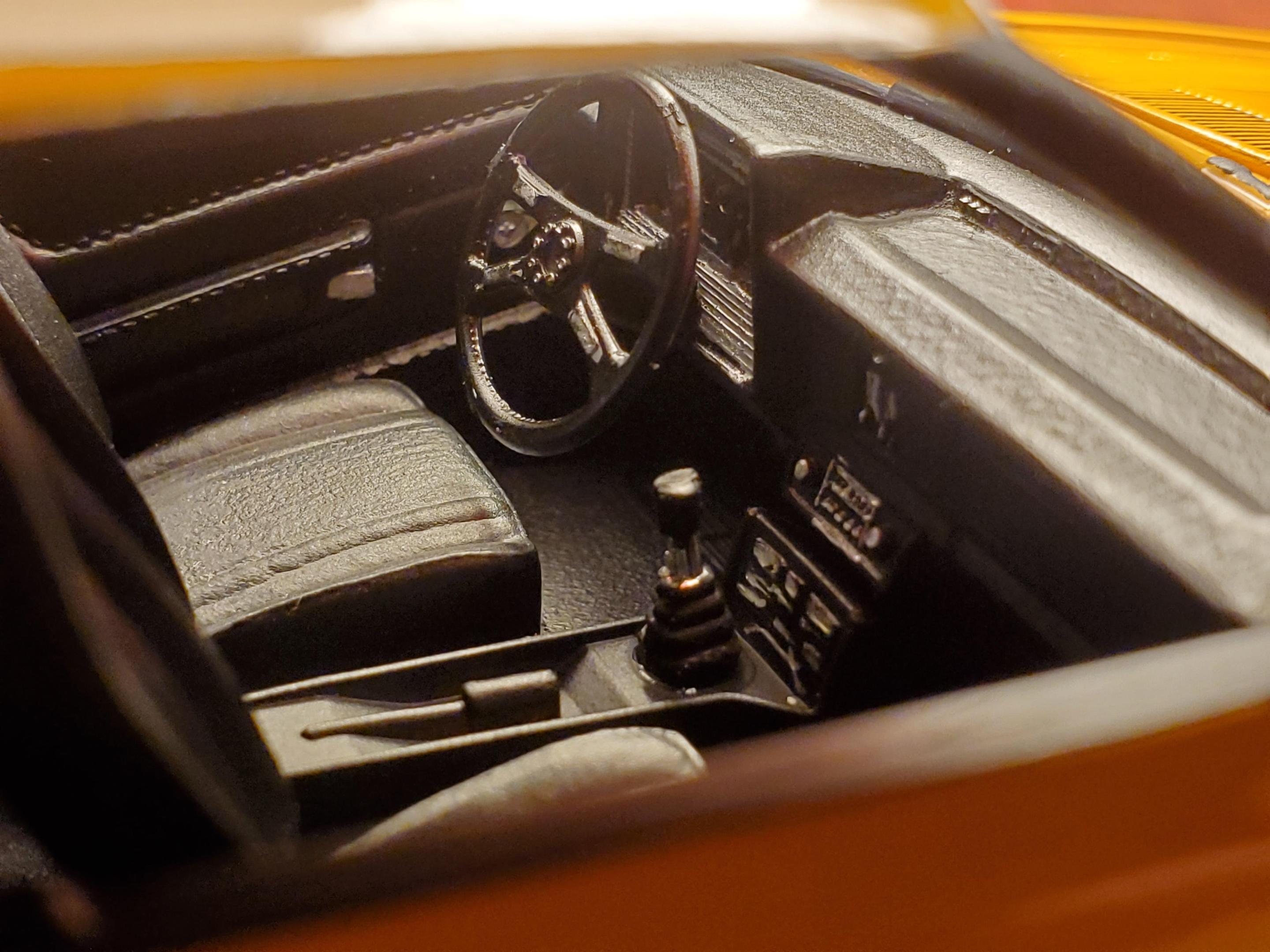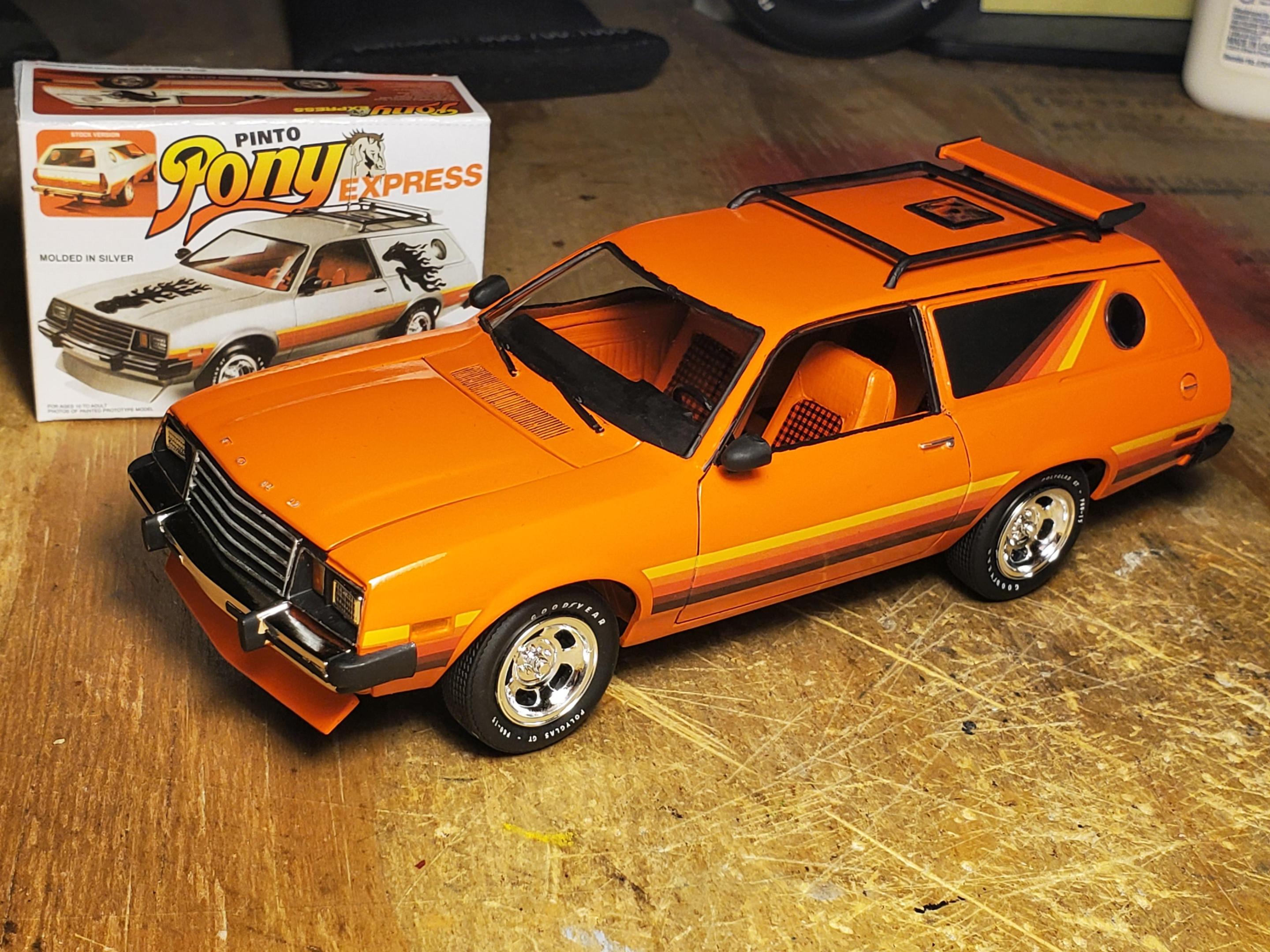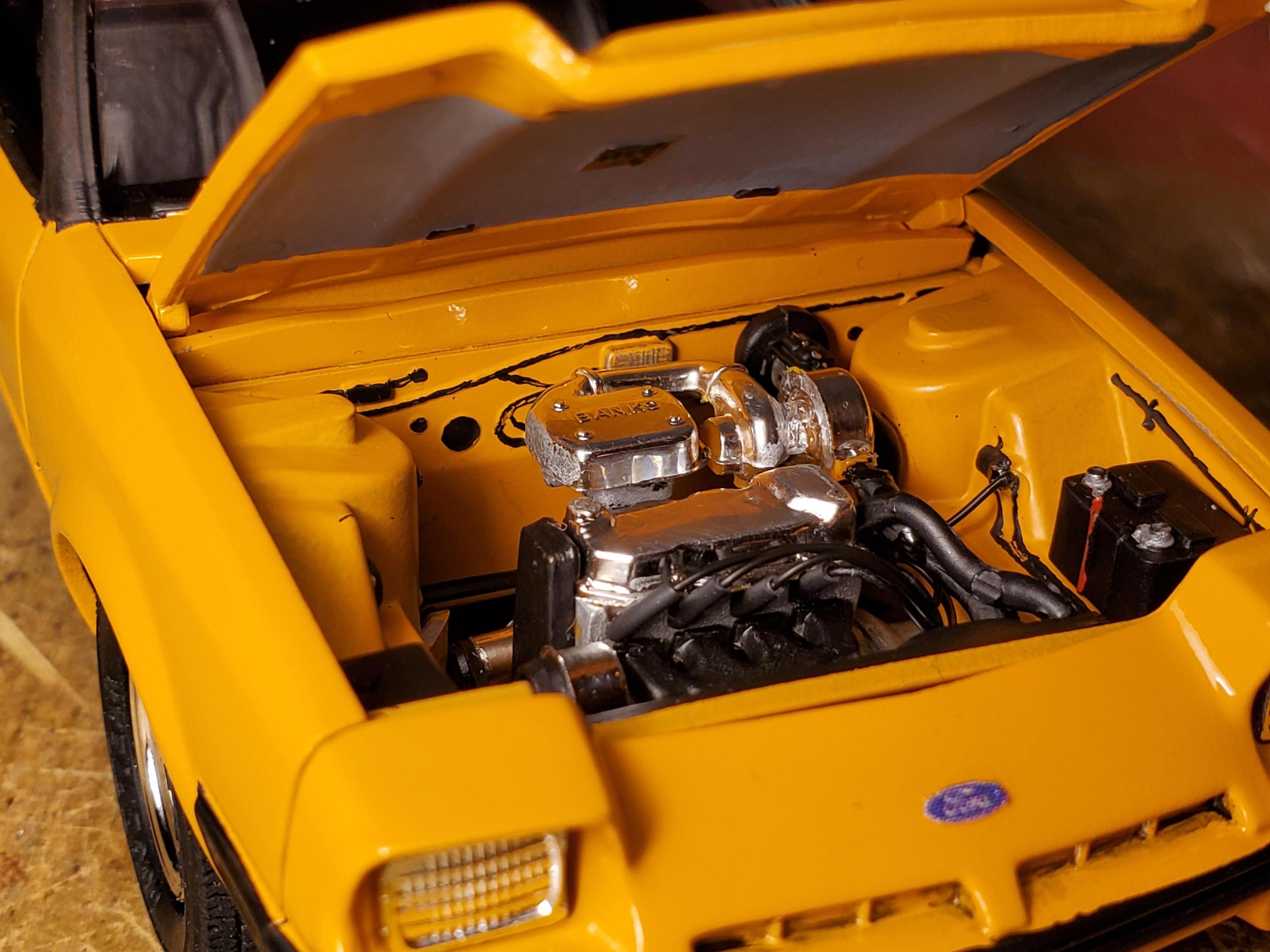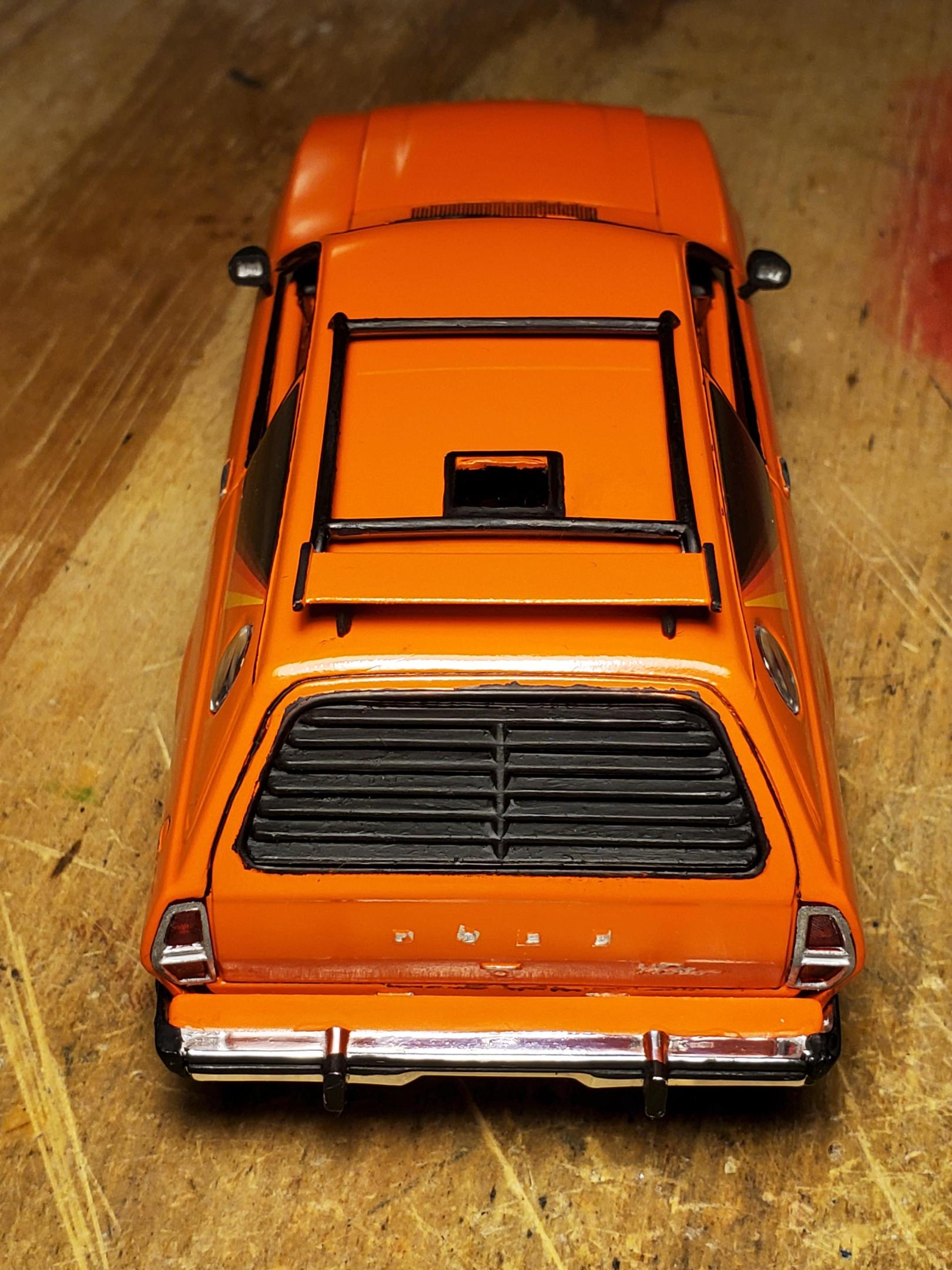 I must have been in an "Orange Mood" in 2016 because I painted several vehicles in varying shades of orange or yellow. This being one of them. MPC '83 Ford EXP. I used some spares from a RaysKits Decal sheet for some detail on this one. Used the Banks turbo kit that came with it and the optional wheels. The tires in the kit were much like some Taco Bell I've had before.... that being, Melty. They were sticking to everything that touched them. Thankfully none of the kit was damaged but I had to toss the tires. Which I didn't like because I really wanted to use them. So I had to settle for some Revell tires that somewhat fit the wheels but look the part. Color is Ford Bright Caramel basecoat with 2k clear. All from a rattle can. I taped off the trim and used a brush to make the trim all black. It was a little messy but the best way I could do it. I used a M.A.D. Distributor for a 4cyl as well. The rest of it is pretty much as the kit comes. OH, and I forgot to clear the mirrors when I finished the car, and so they got cleared much, much later, but they ARE on the car NOW just not in the pics here.