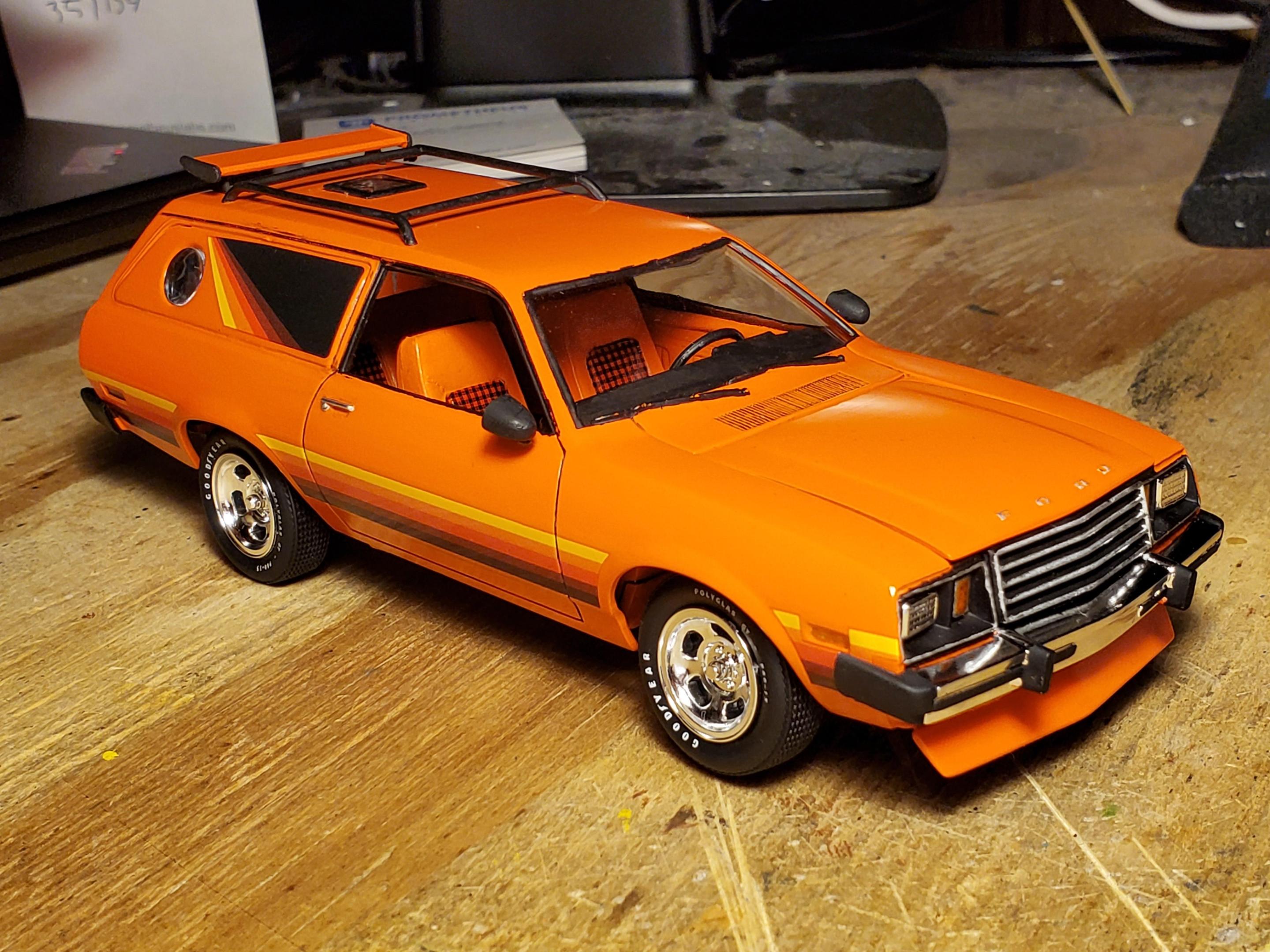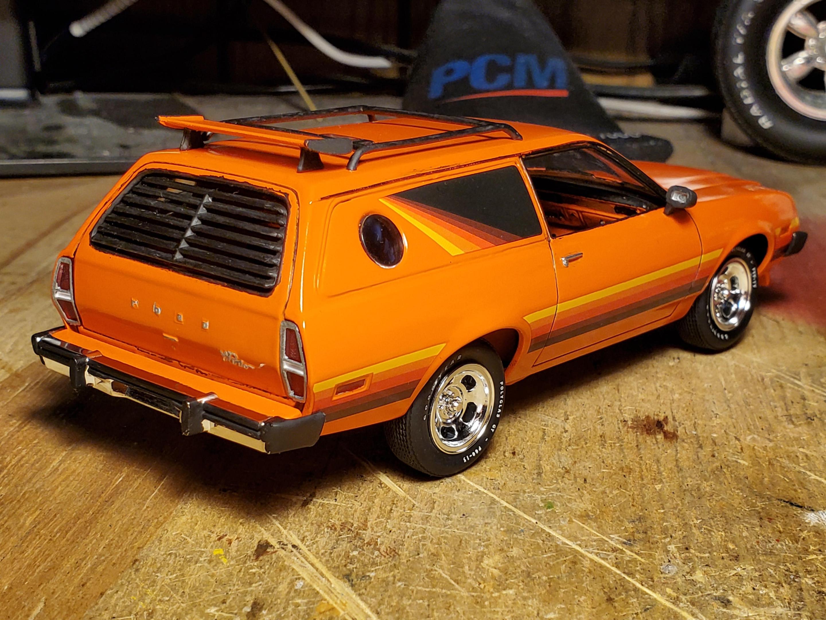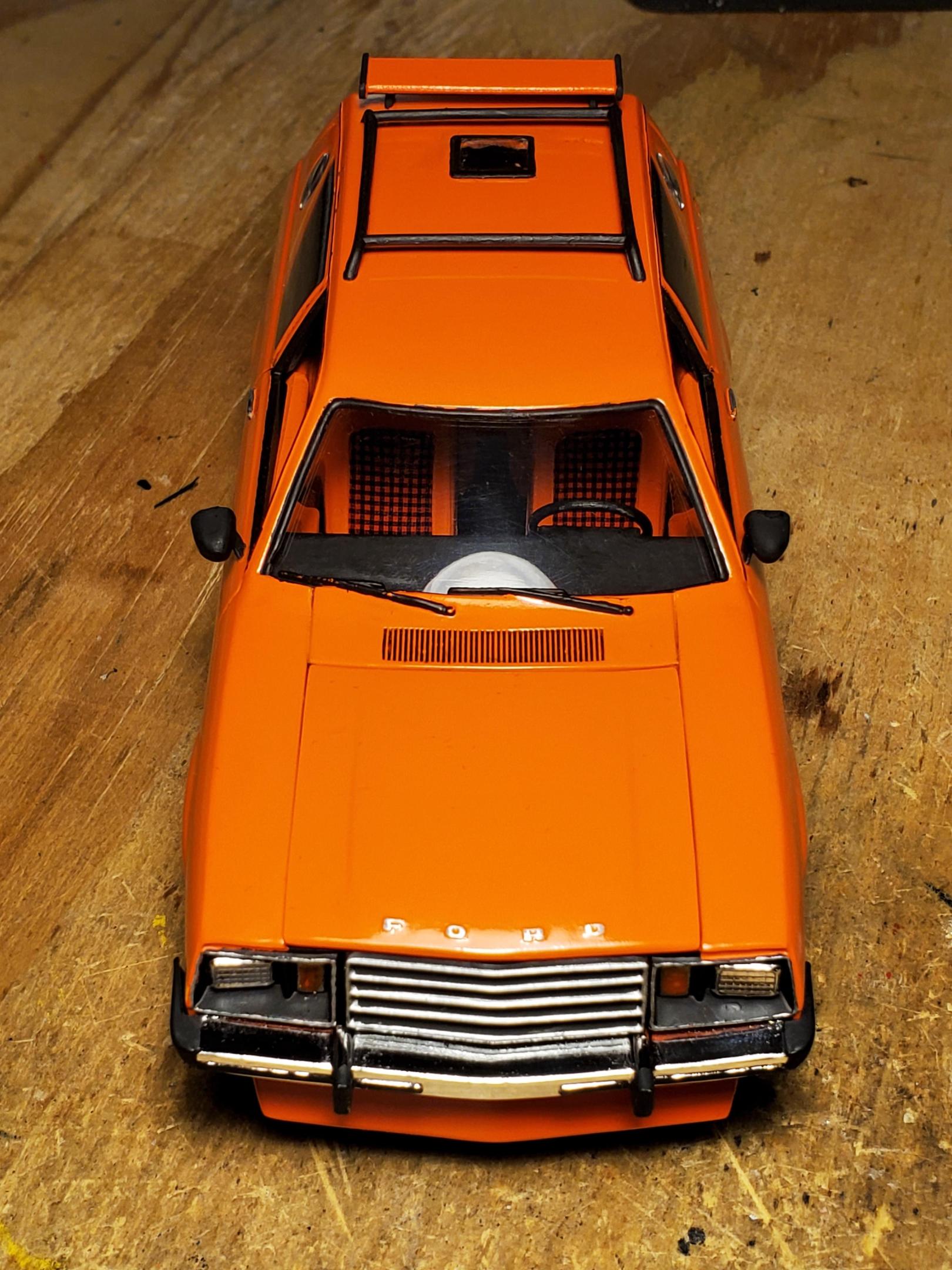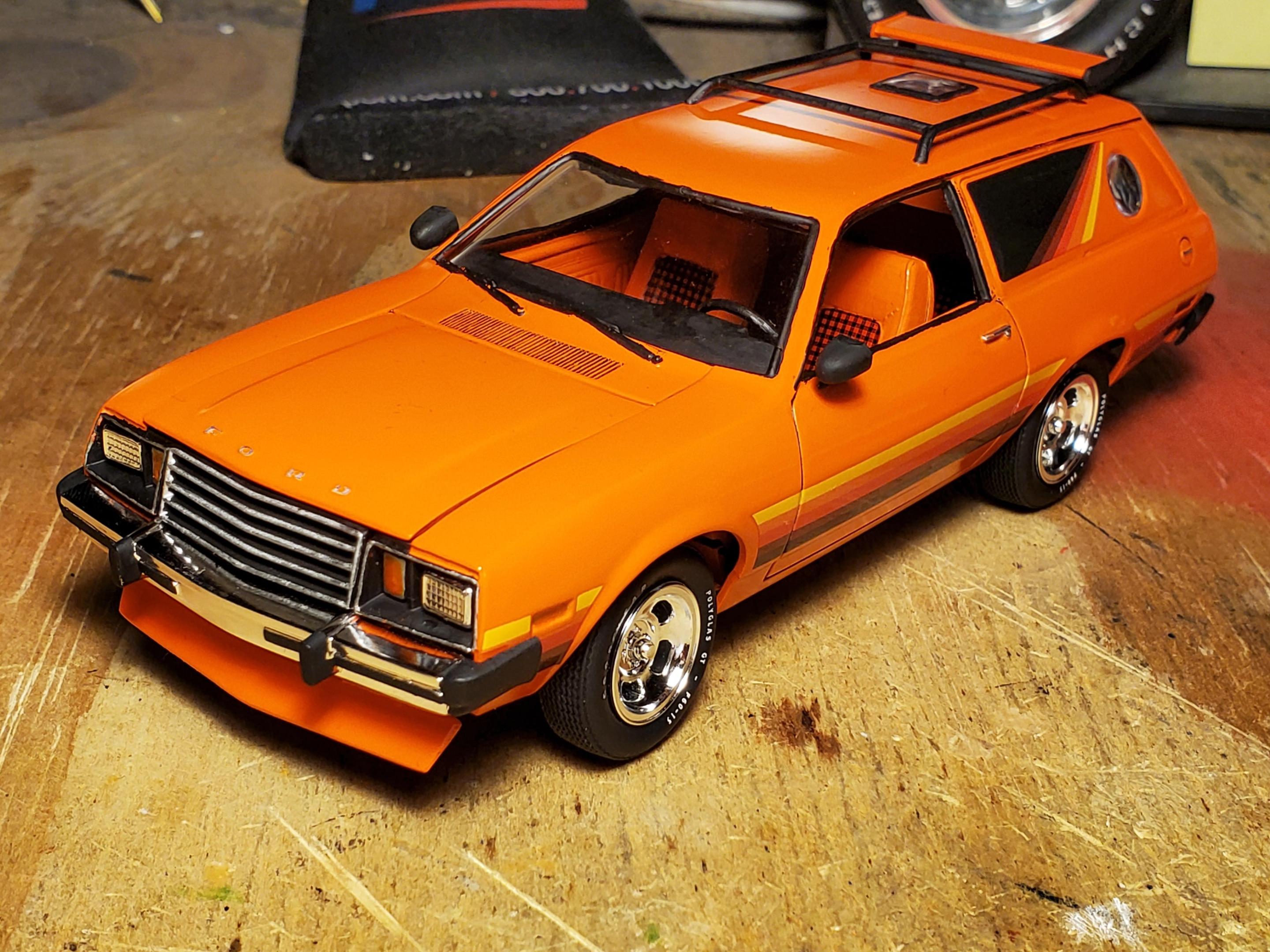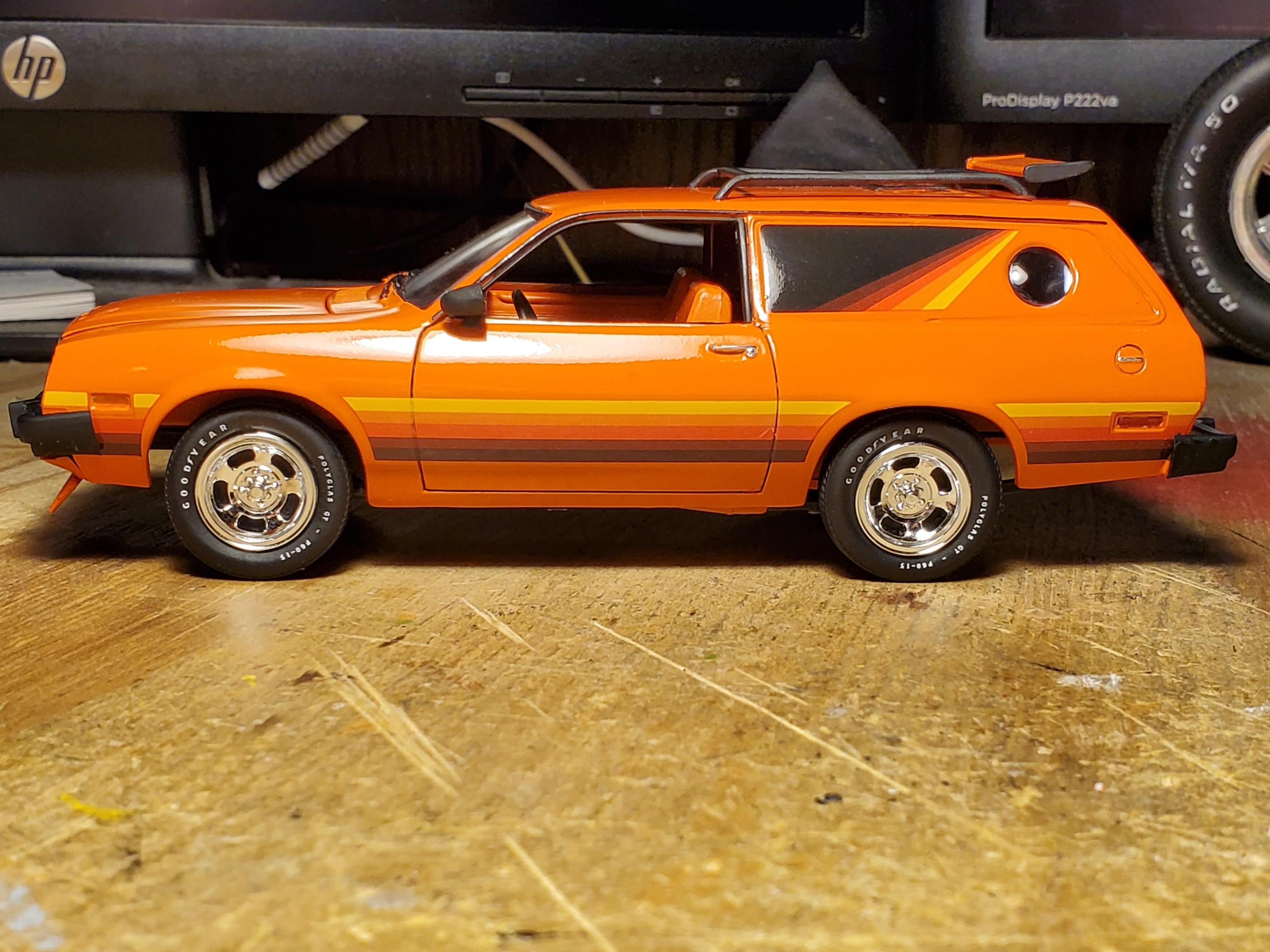 I must have been in an "Orange Mood" in 2016 because I painted several vehicles in varying shades of orange or yellow. This being one of them. MPC '83 Ford EXP. I used some spares from a RaysKits Decal sheet for some detail on this one. Used the Banks turbo kit that came with it and the optional wheels. The tires in the kit were much like some Taco Bell I've had before.... that being, Melty. They were sticking to everything that touched them. Thankfully none of the kit was damaged but I had to toss the tires. Which I didn't like because I really wanted to use them. So I had to settle for some Revell tires that somewhat fit the wheels but look the part. Color is Ford Bright Caramel basecoat with 2k clear. All from a rattle can. I taped off the trim and used a brush to make the trim all black. It was a little messy but the best way I could do it. I used a M.A.D. Distributor for a 4cyl as well. The rest of it is pretty much as the kit comes. OH, and I forgot to clear the mirrors when I finished the car, and so they got cleared much, much later, but they ARE on the car NOW just not in the pics here.