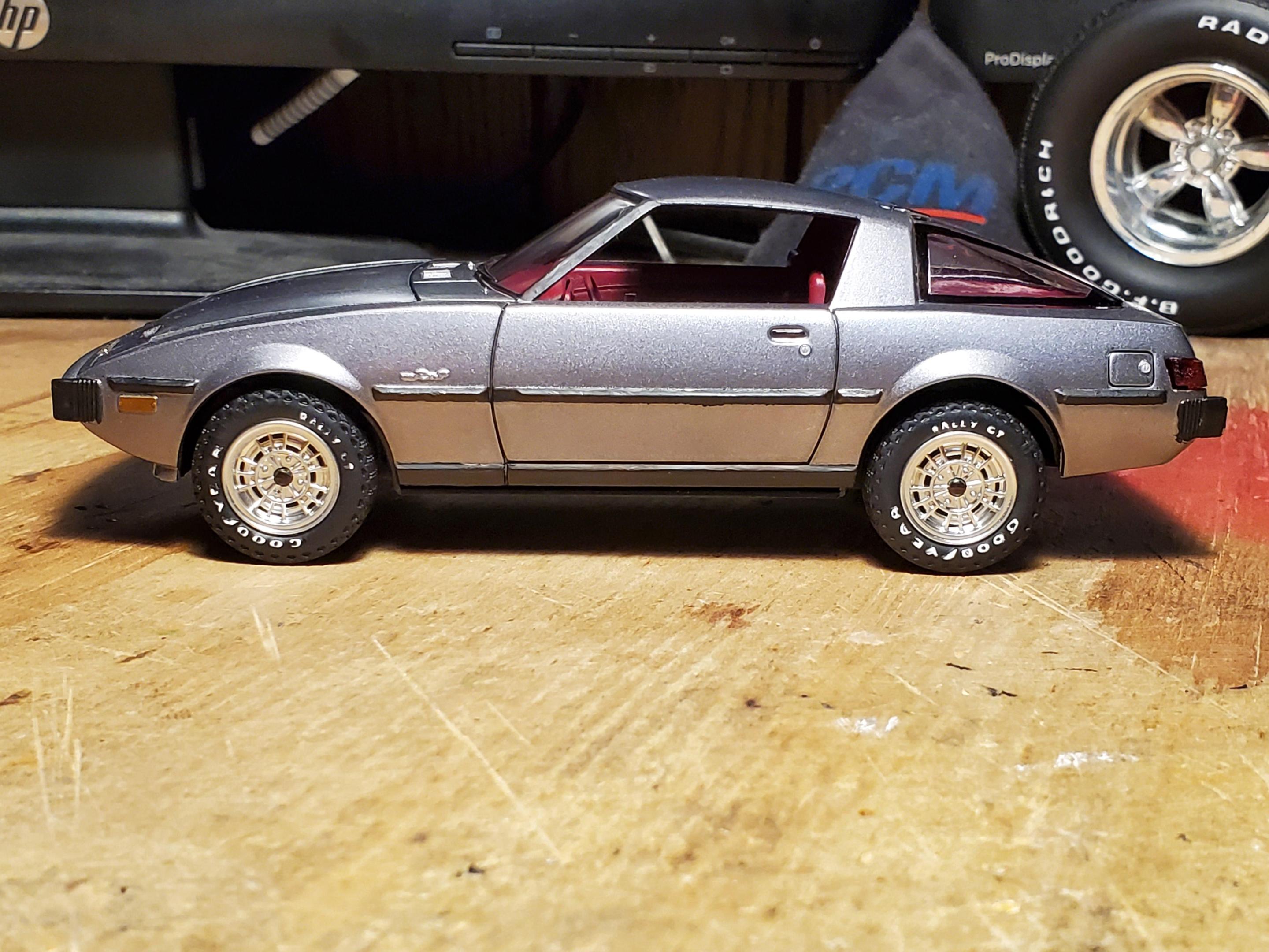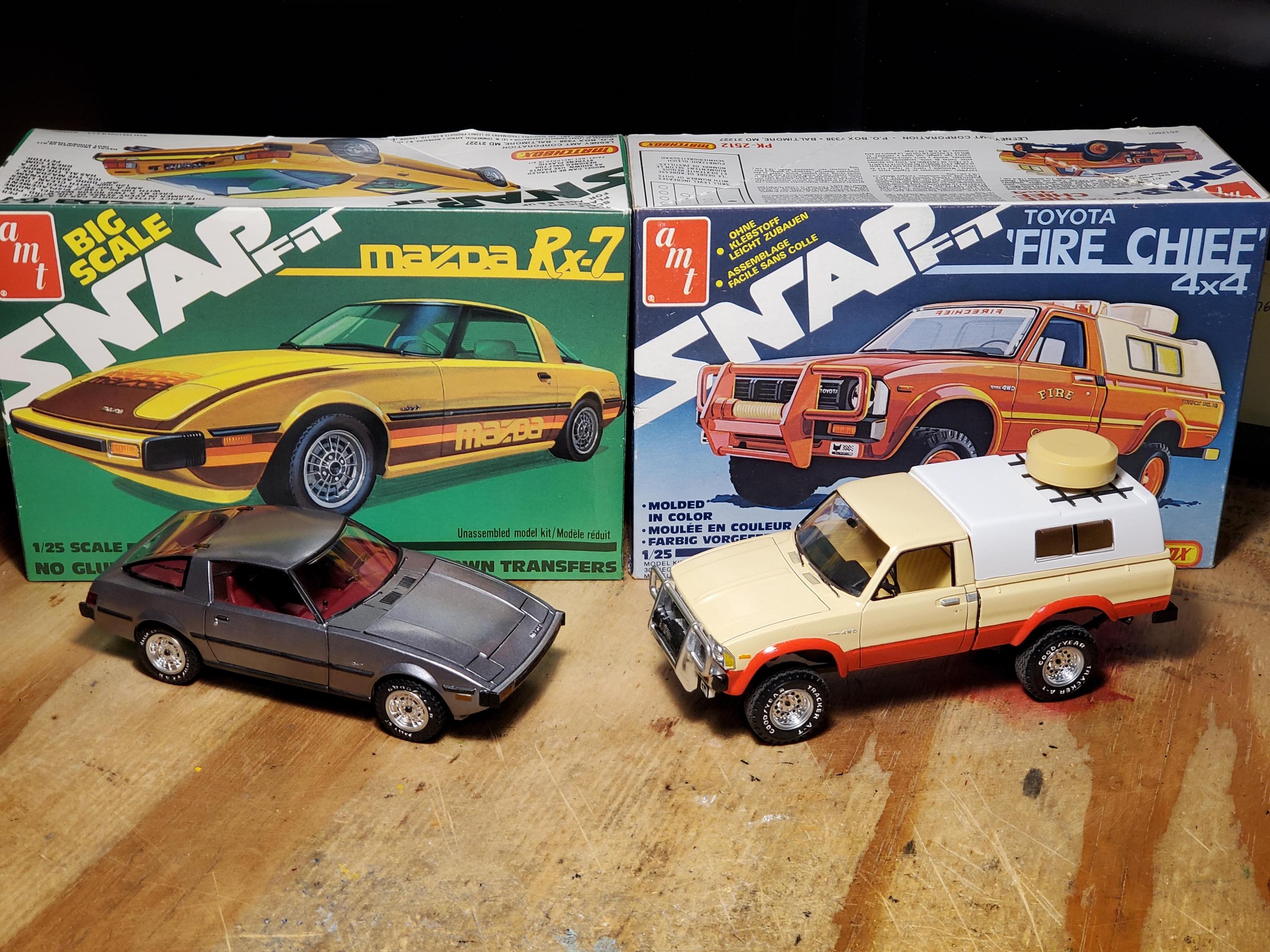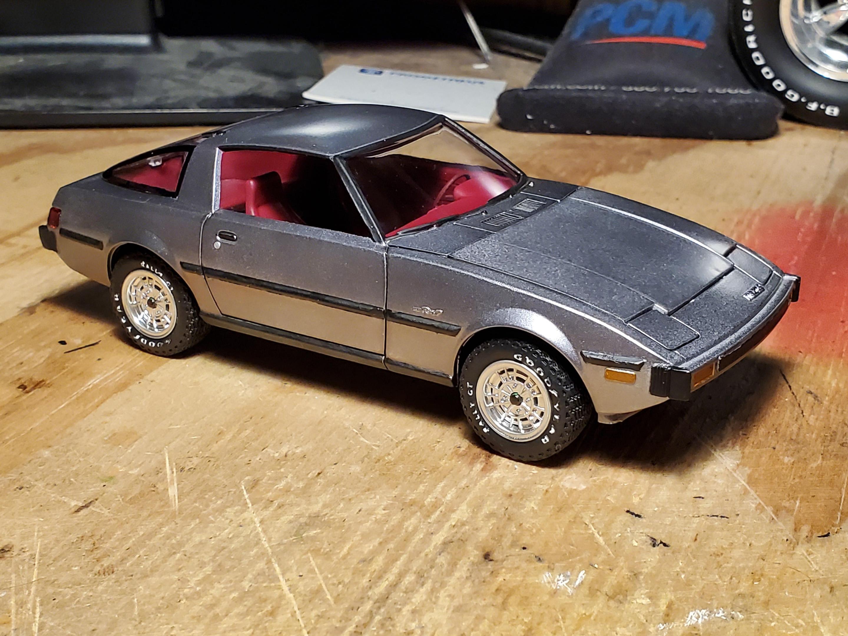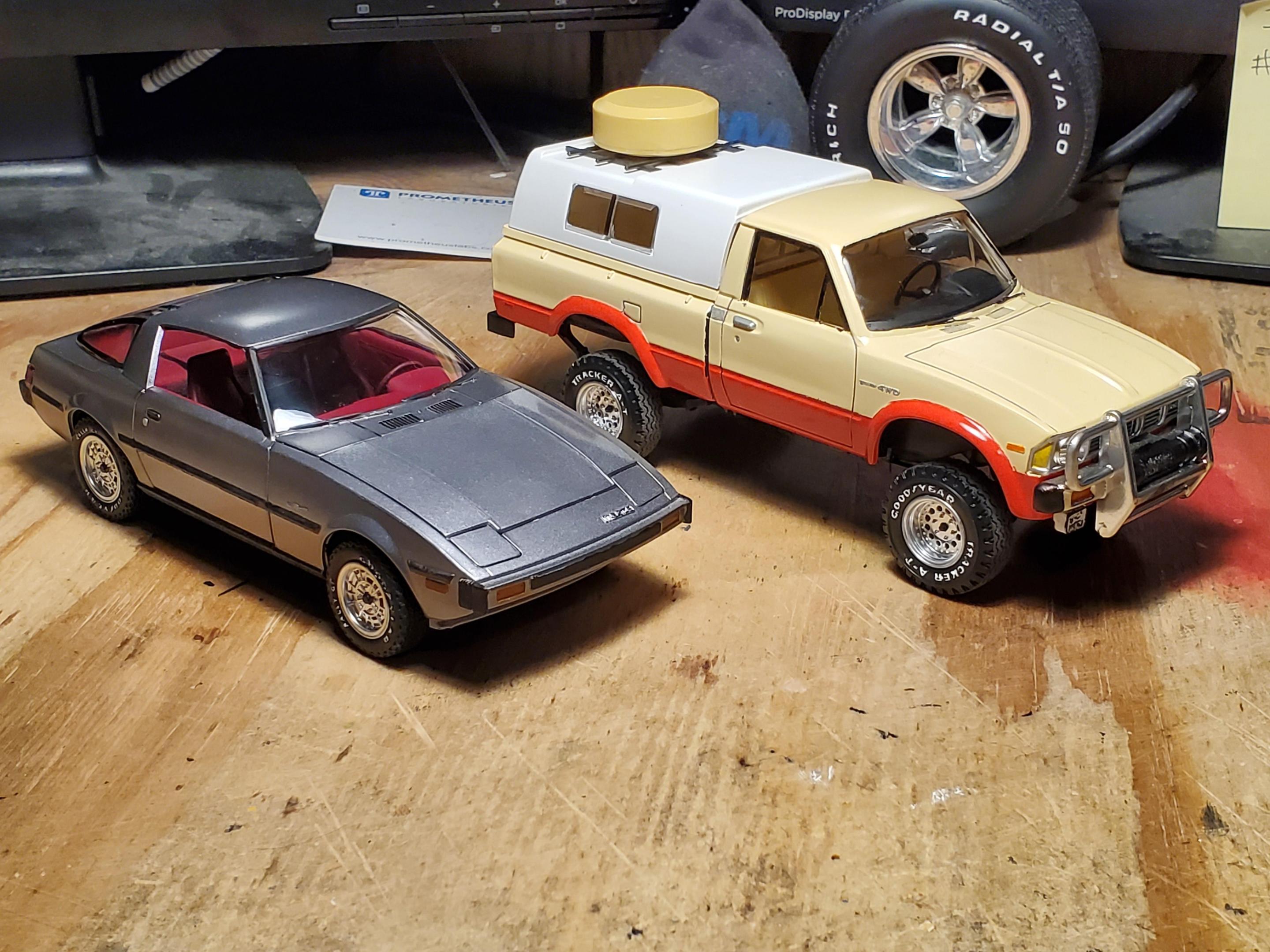 Another estate pick. Another quick build. I think this is like a 1980 issue AMT snap kit. I always liked the first gen RX7's with a red interior. So I painted this one a Tamiya gunmetal gray with a sort of dark red interior. Also posing with the Toyota pickup from the same series of kits. Also I literally painted this car in the dark and missed a little a little on the hood. LOL.