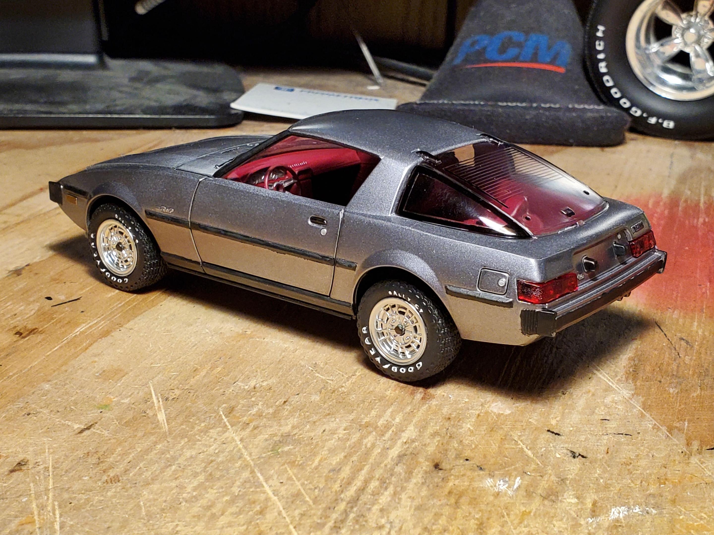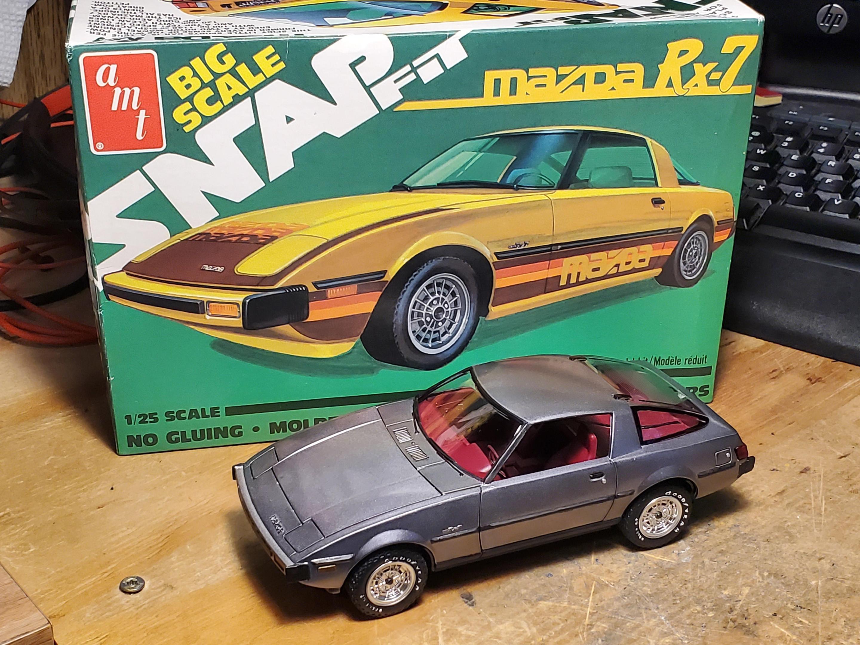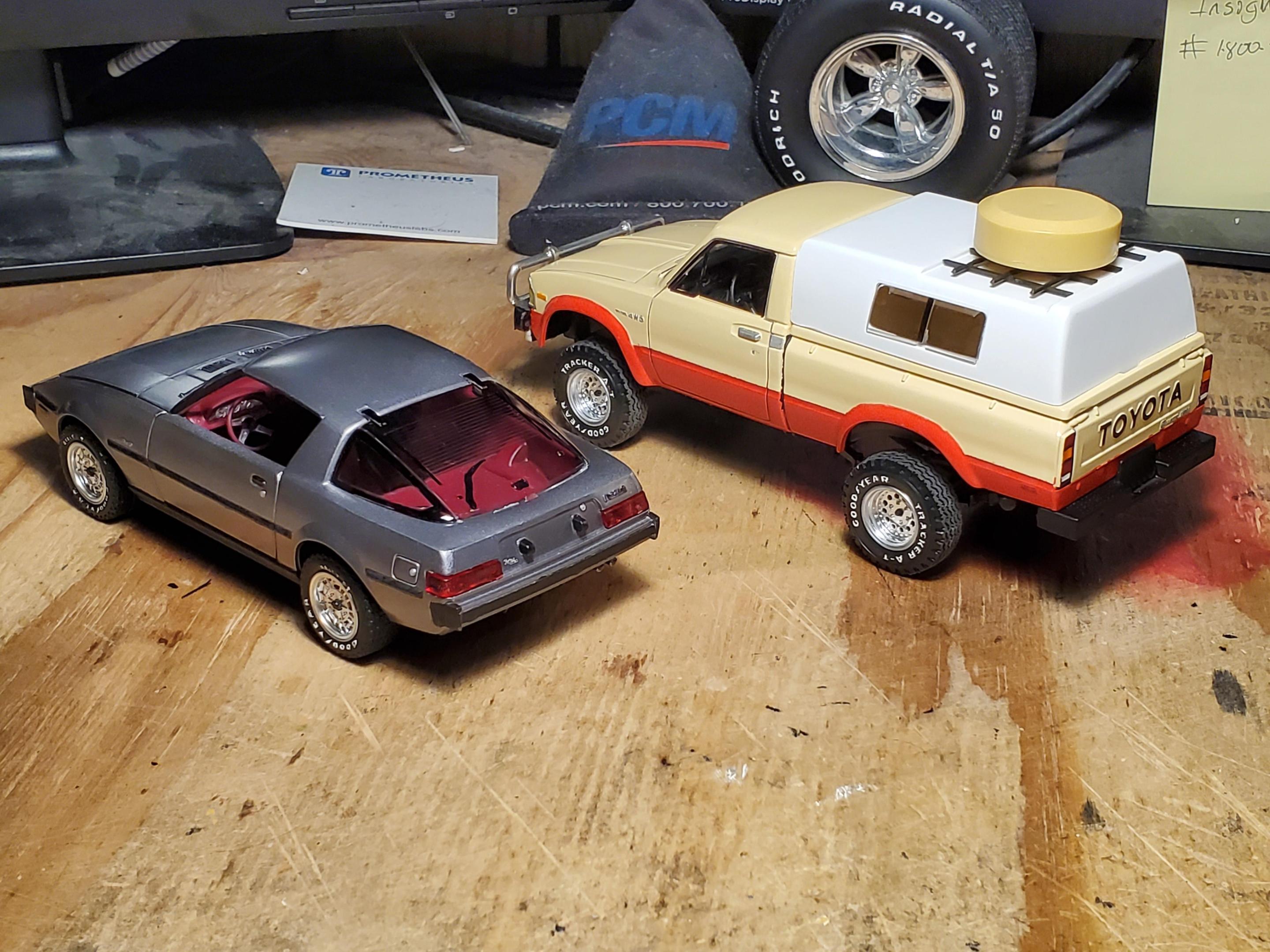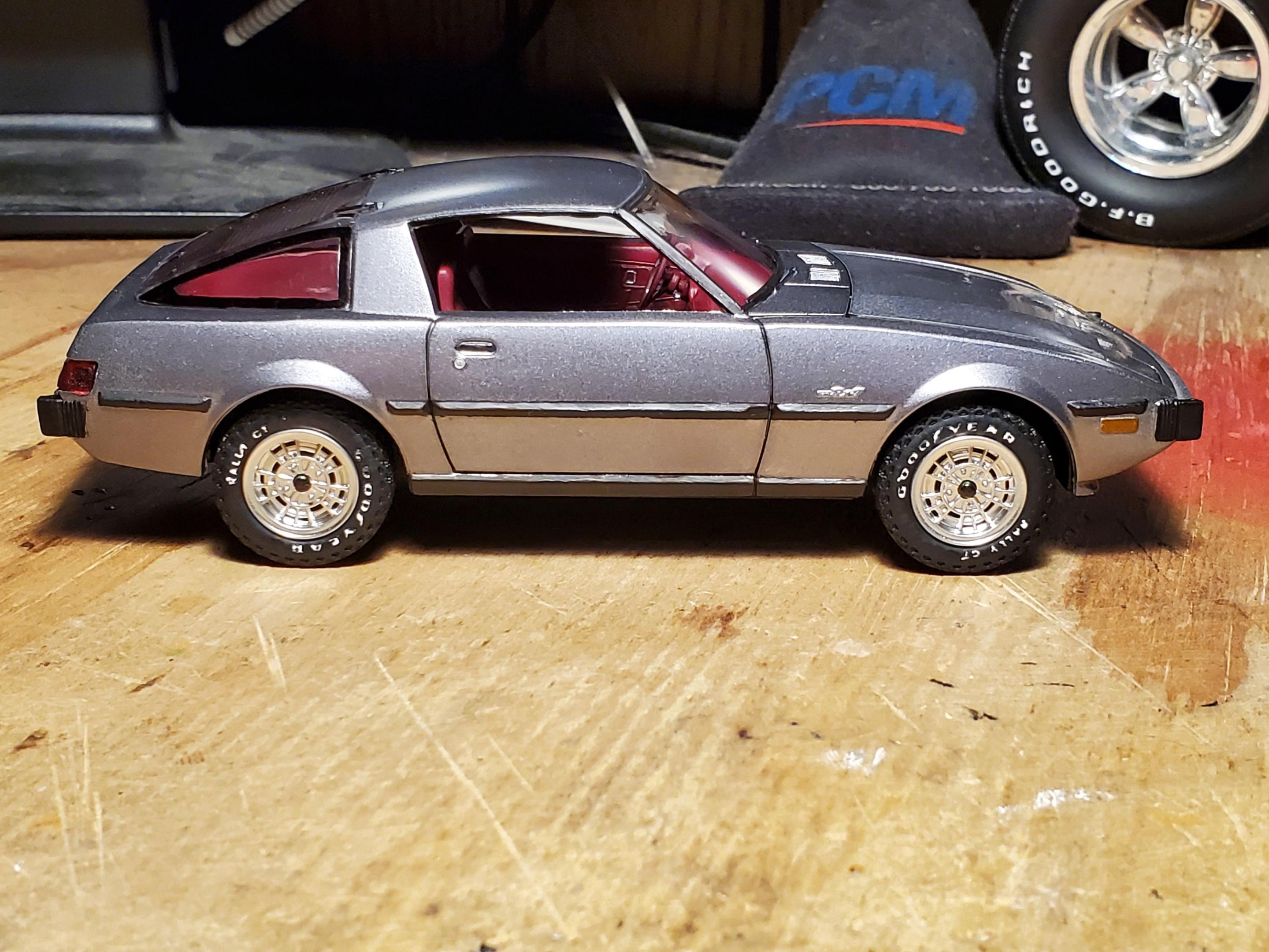 Another estate pick. Another quick build. I think this is like a 1980 issue AMT snap kit. I always liked the first gen RX7's with a red interior. So I painted this one a Tamiya gunmetal gray with a sort of dark red interior. Also posing with the Toyota pickup from the same series of kits. Also I literally painted this car in the dark and missed a little a little on the hood. LOL.