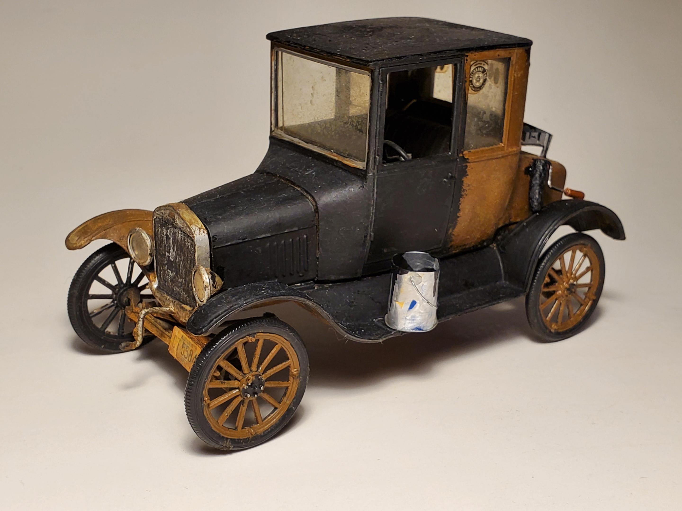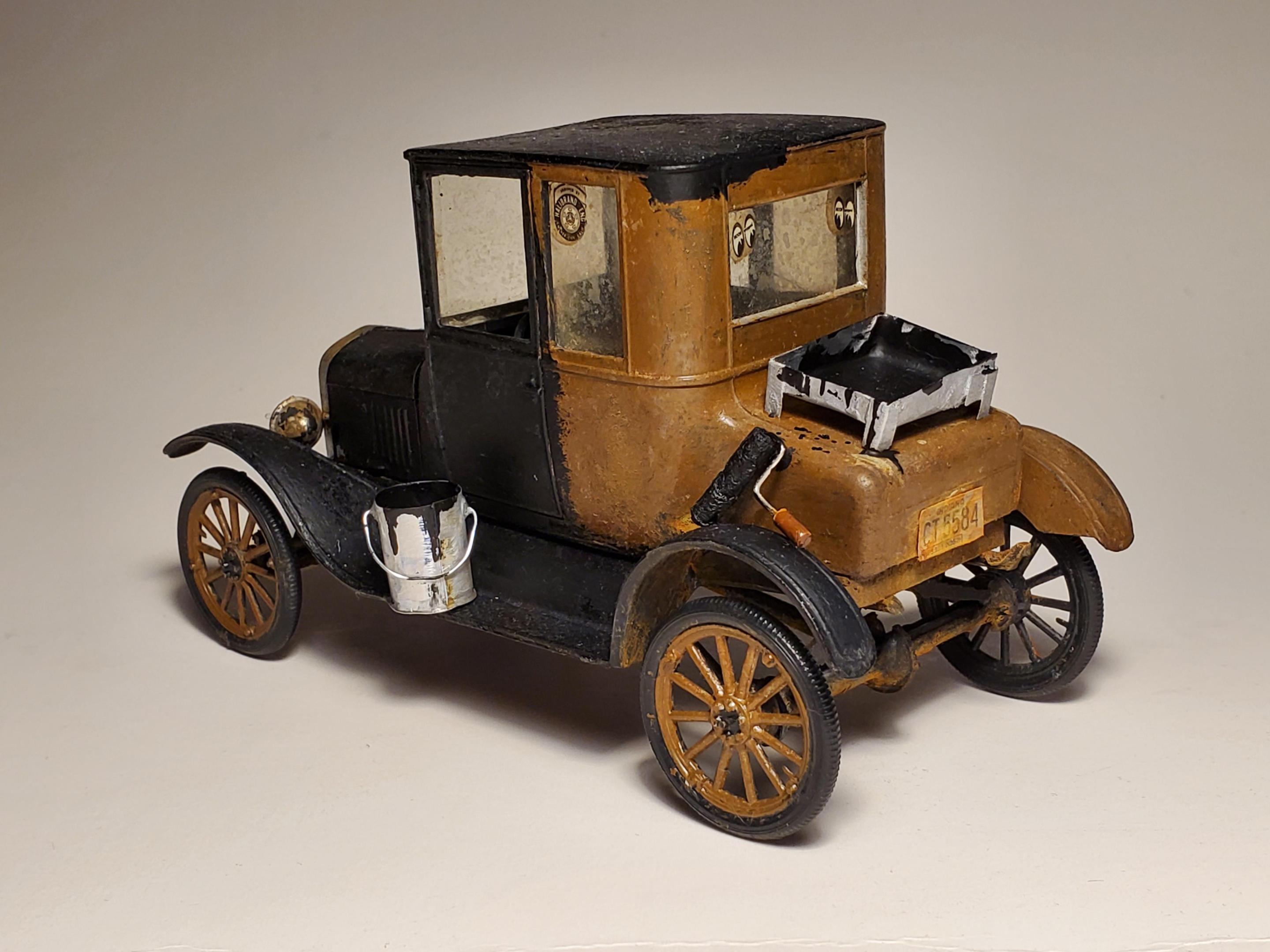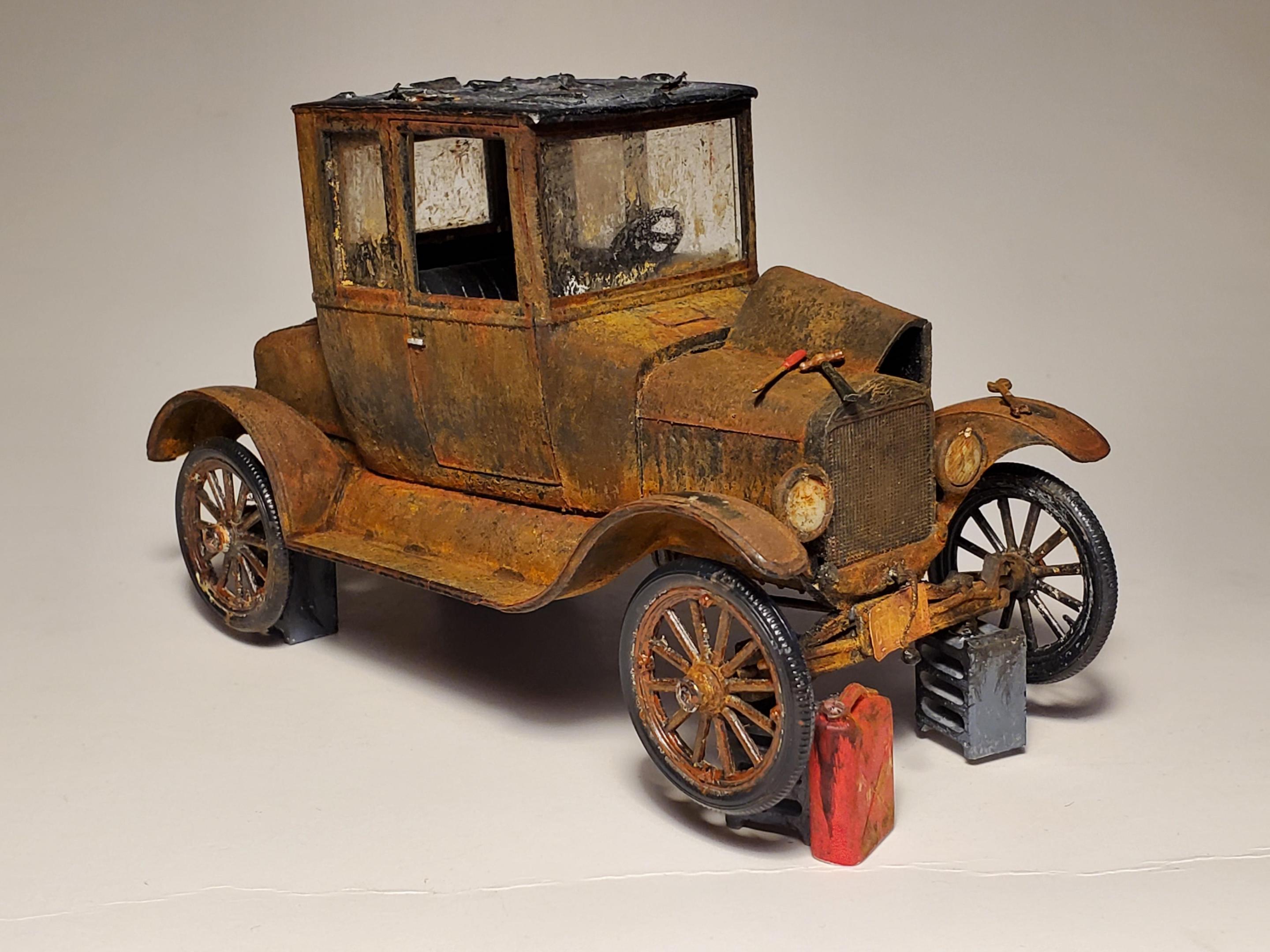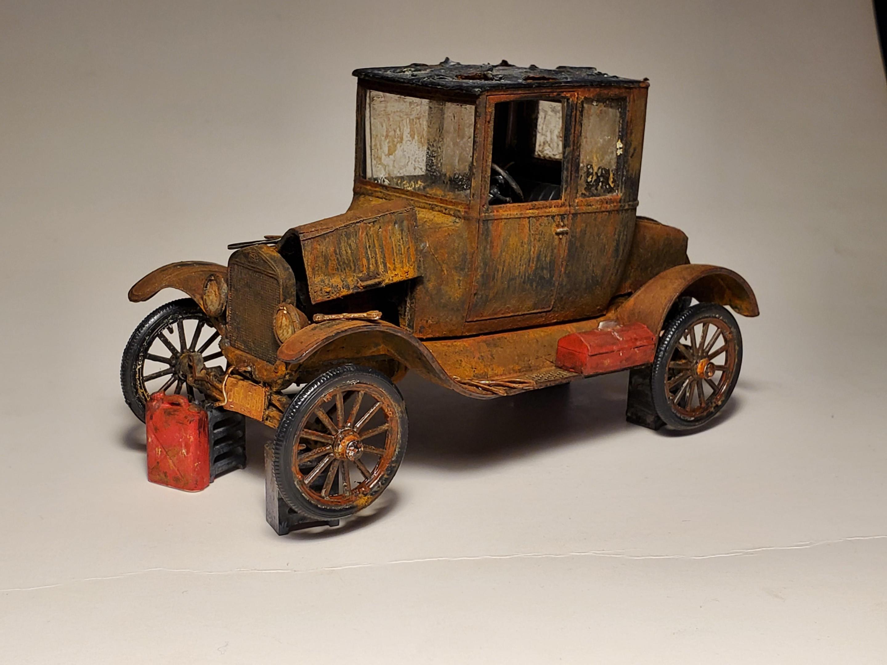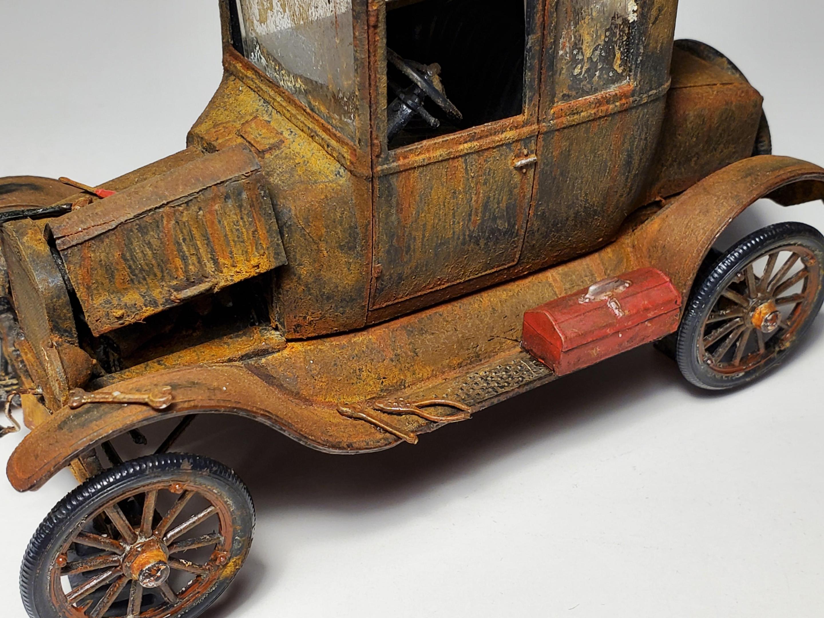 I rescued these two original issue AMT 1925 Model T built up's, separately from each other, from different people, years apart, because they were going to be thrown away. They sat on my shelf for a while collecting dust. Some model building friends and I occasionally get together and go somewhere for the day and get lunch. We chose a return trip to the Model T Museum in Richmond, Indiana. We'd been there before but we wanted to see if they had anything new going on. So one day a couple weeks before we went, I looked up at my shelf and saw those two Model T's stacked on top of each other collecting dust and said you know what I'm going to do something with those and so I took em down, dusted them off, and proceeded to figure out where to start. One of the T's was brown and black, like someone painted it brown and decided later to paint it black. I thought it was funny because that's legitimately what someone would do back in the day in real life. The other one was an old mostly complete unpainted build up. I wanted to give these T's somewhat of a backstory to explain their looks. By doing so they took on their own names. So the half repainted one became known as "Rolly" and the unpainted one would become "Rusty". So here's the tale of Rusty and Rolly: Rolly the T had been used regularly by a small town Indiana family since new, and at one time painted brown... all over... even the wheels. Rolly fulfilled it's uses and was sold to another family in town for their young son in the 50s, It was driven home, but abandoned sometime thereafter during a black repaint with a roller. You might say it's owner was taunted by the fins and chrome of the era, and was struggling to get the old T running right, so they abandoned the job mid-repaint. Left the roller on the rear fender, bucket of paint on the running board, and paint tray on the trunk. Deciding instead to go get a newer, more reliable car as a first car, instead of fixing up the ole T. So it was left in the shed out back and forgotten about. I used Modern Masters rust antiquing kit to add some details of rust on this car on the brown areas. The black areas I did have to repaint/retouch because they reacted with the rust solution once sprayed on. I suspect because it was old lead-based Testors. I scratch built the roller, bucket, and paint tray. The bucket and paint tray are made out of a pop can and the handle on the can was silver wire. The roller is silver wire with a paper towel wrapped around and super glued, then dipped in paint. The paint tray and bucket both have paint in them as well. I made an Indiana License plate for it and added it to front and rear. I think the year is 1954, but now it's too rusty to tell. Haha! Unfortunately I was missing two of the hubs for the wheels. Forgive that omission. Rusty the T was the family vehicle on the rural Indiana farm from new. It's seen it all and been through it all and was well used. By the time Rusty was 11 years old it had already fallen into disuse as cars were much more reliable and easy to drive, and those new 1936 Fords were just too nice for the now well-to-do farmer to turn down. The ole T was used around the farm for a short time before being put in the barn. The owner's son needed a vehicle to drive in the early 1940's and was given the T. The new owner put plates on the T, however while he was trying to get it fixed up, WWII broke out. The T's new owner had to ship off to war. Leaving the T to rust in the barn where it sat on blocks. Thankfully the T's owner returned at the end of the war, but a young war hero couldn't be seen in a rusty old Model T trying to impress the ladies. So a '46 Ford was bought. Rusty the T stayed in the same spot in the barn for many years, but was always kept in the family. Rusty is covered in Modern Masters rust antiquing 2 part system, (think sophisticated finishes) and several colors of Vallejo rust washes and black washes. Also several colors of Tamiya weathering powders. I used a piece of masking tape for the top, and shredded it up with an xacto knife. License plates were made by me, and I think this one is an Indiana 1943 plate. I couldn't seal any of my weathering, or take down the shine on the tires because it was January here in Ohio, and too cold to spray a flat clear down. When I get them back I will. The tools and tooboxes were parts box items I dug up and weathered. The hand crank on this one was scratch built with silver wire, with a superglue blob as the knob/handle. One thing I forgot to do, after taking these pictures, was actually prop the hood up. Because they wouldn't sit like that on their own. I also added some "barn bird poo" on the back of it by flicking white paint on with a paint brush. So here's that pic. I used a piece of styrene carved randomly to look like a stick that was a Y-shape, found somewhere on the ground and used to hold the hood up. And some white testors paint splattered on it w/ a paint brush to look like birds in the rafters were leaving some presents. Here's both of the cars at the Museum after I donated them temporarily for display, sitting with some other die-cast T's.