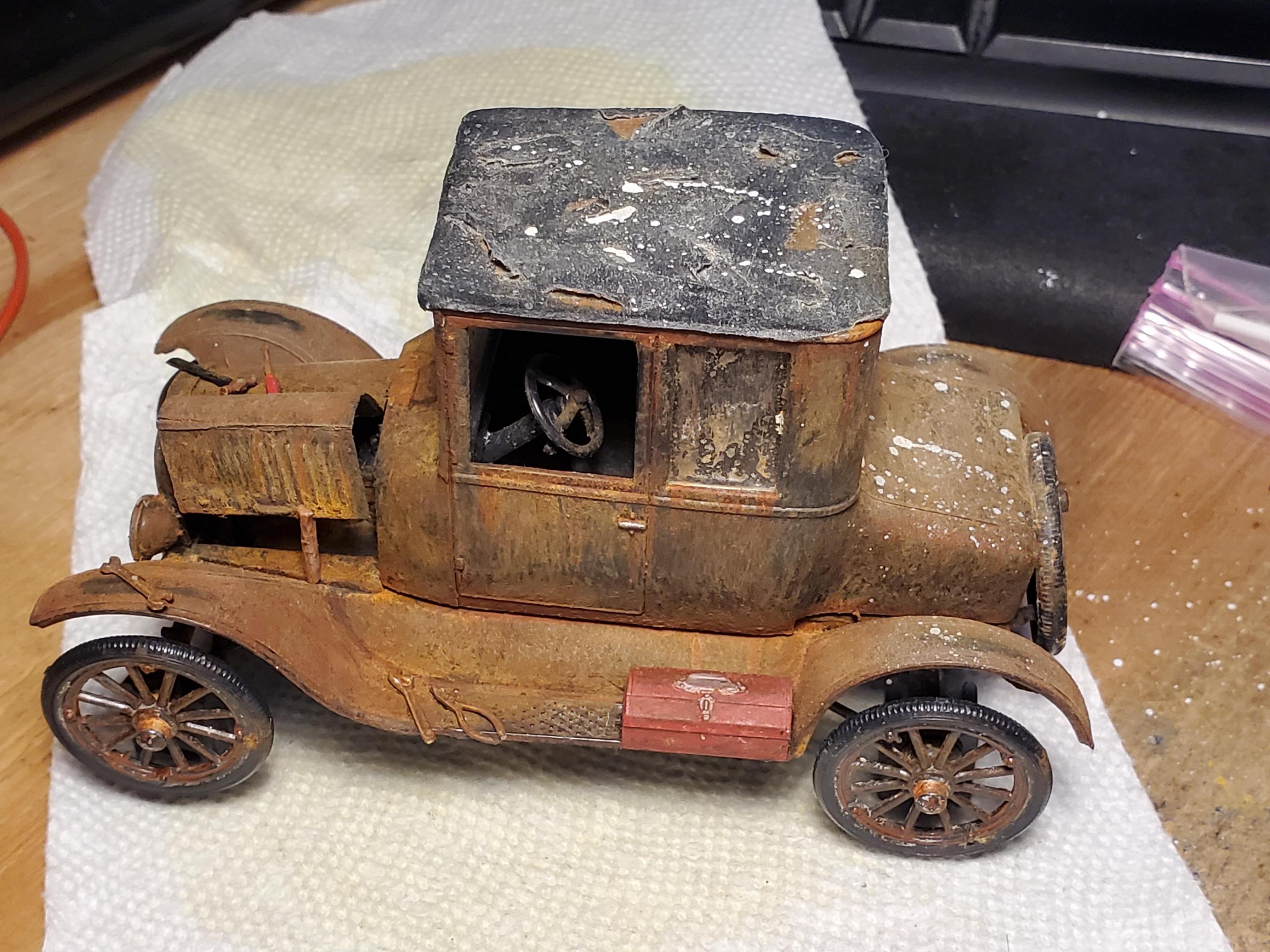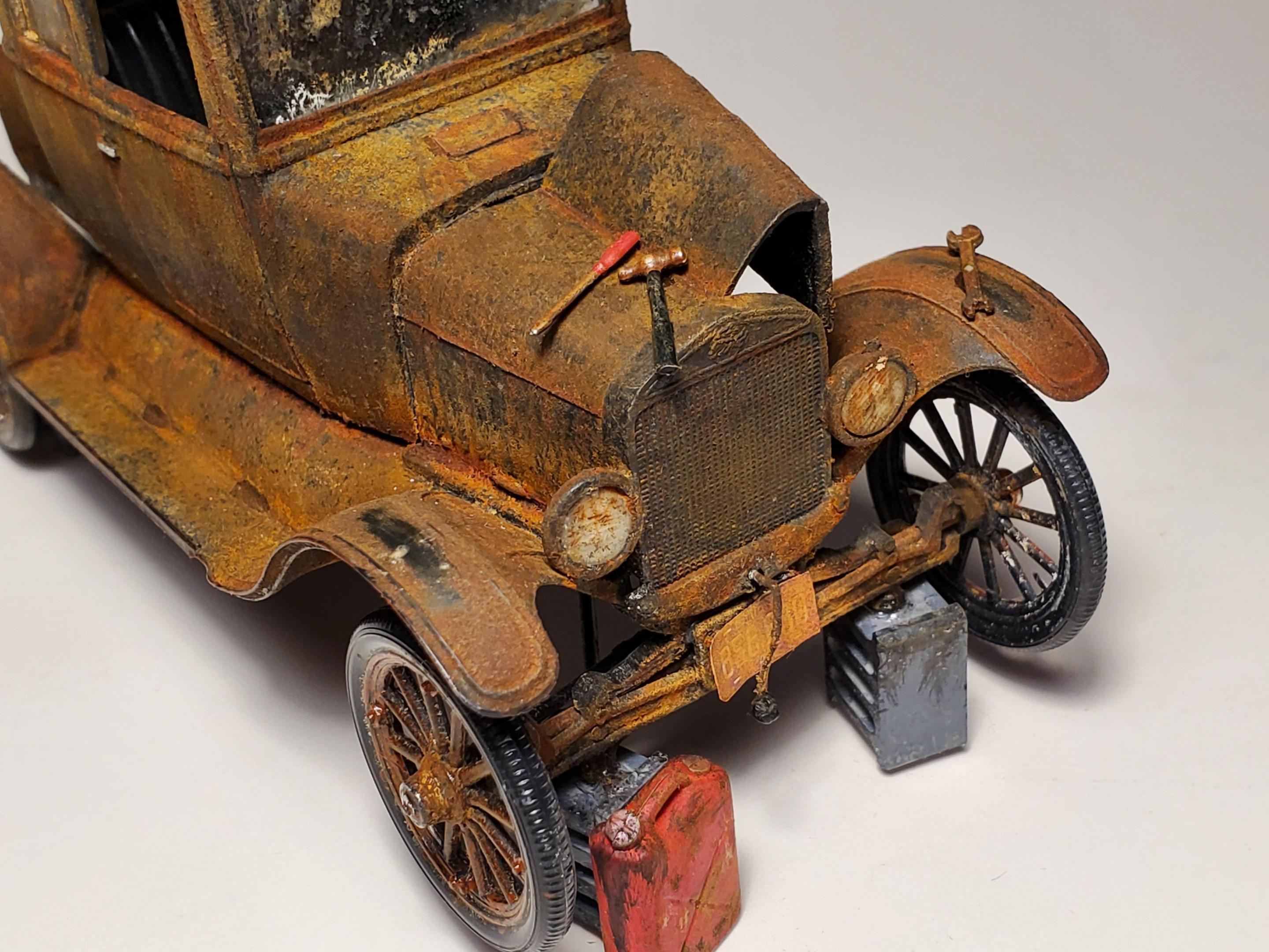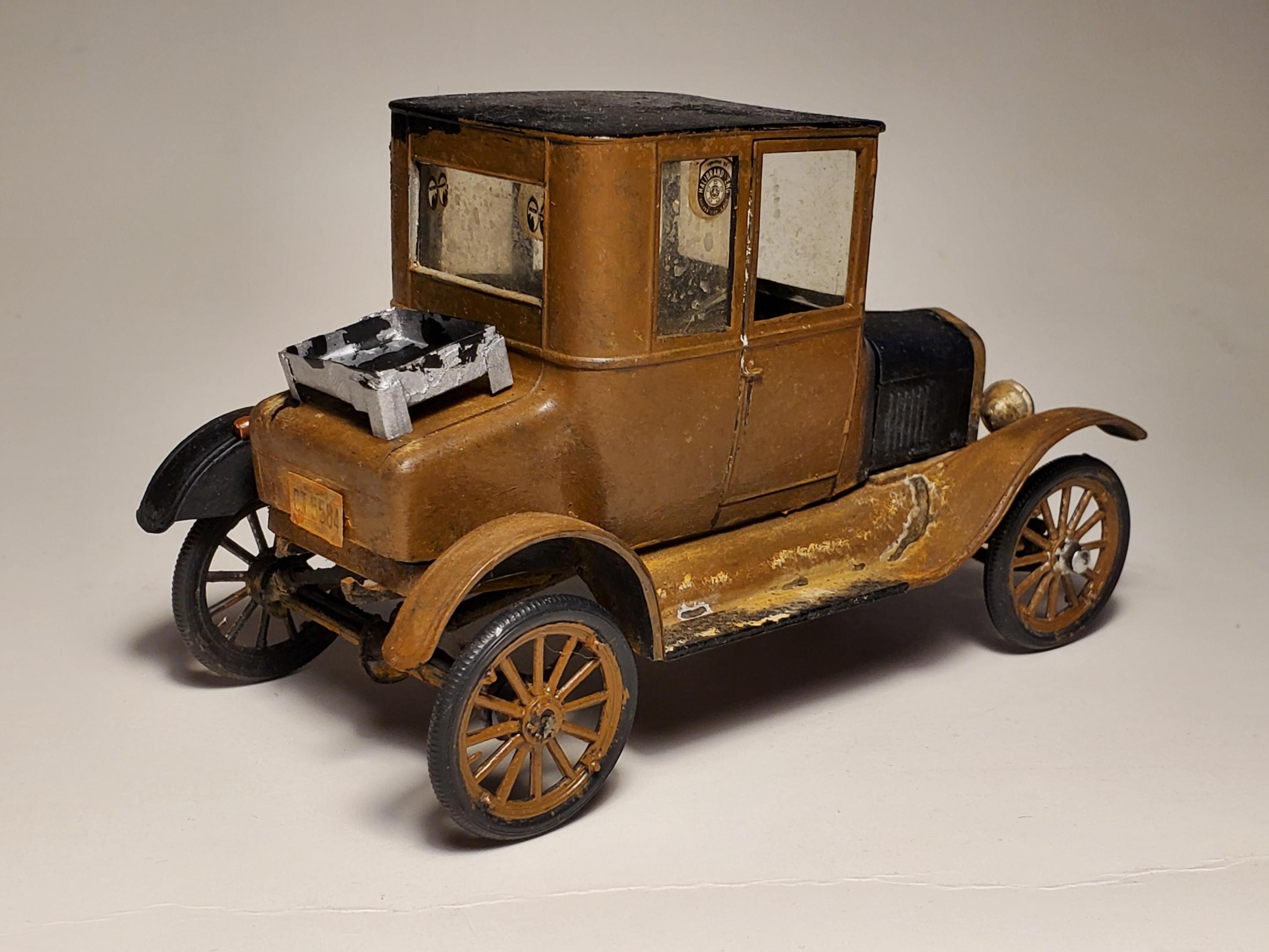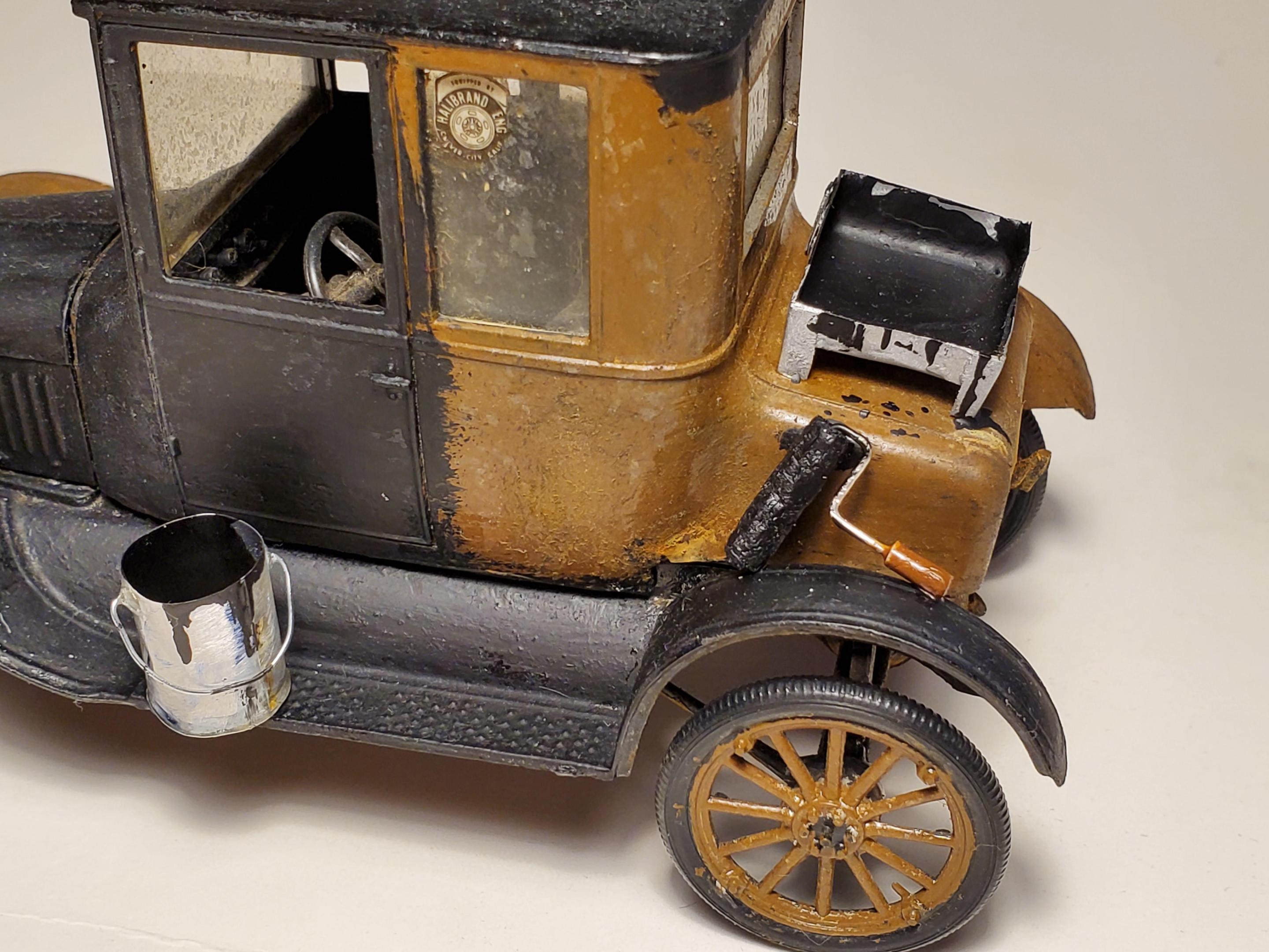 I rescued these two original issue AMT 1925 Model T built up's, separately from each other, from different people, years apart, because they were going to be thrown away. They sat on my shelf for a while collecting dust. Some model building friends and I occasionally get together and go somewhere for the day and get lunch. We chose a return trip to the Model T Museum in Richmond, Indiana. We'd been there before but we wanted to see if they had anything new going on. So one day a couple weeks before we went, I looked up at my shelf and saw those two Model T's stacked on top of each other collecting dust and said you know what I'm going to do something with those and so I took em down, dusted them off, and proceeded to figure out where to start. One of the T's was brown and black, like someone painted it brown and decided later to paint it black. I thought it was funny because that's legitimately what someone would do back in the day in real life. The other one was an old mostly complete unpainted build up. I wanted to give these T's somewhat of a backstory to explain their looks. By doing so they took on their own names. So the half repainted one became known as "Rolly" and the unpainted one would become "Rusty". So here's the tale of Rusty and Rolly: Rolly the T had been used regularly by a small town Indiana family since new, and at one time painted brown... all over... even the wheels. Rolly fulfilled it's uses and was sold to another family in town for their young son in the 50s, It was driven home, but abandoned sometime thereafter during a black repaint with a roller. You might say it's owner was taunted by the fins and chrome of the era, and was struggling to get the old T running right, so they abandoned the job mid-repaint. Left the roller on the rear fender, bucket of paint on the running board, and paint tray on the trunk. Deciding instead to go get a newer, more reliable car as a first car, instead of fixing up the ole T. So it was left in the shed out back and forgotten about. I used Modern Masters rust antiquing kit to add some details of rust on this car on the brown areas. The black areas I did have to repaint/retouch because they reacted with the rust solution once sprayed on. I suspect because it was old lead-based Testors. I scratch built the roller, bucket, and paint tray. The bucket and paint tray are made out of a pop can and the handle on the can was silver wire. The roller is silver wire with a paper towel wrapped around and super glued, then dipped in paint. The paint tray and bucket both have paint in them as well. I made an Indiana License plate for it and added it to front and rear. I think the year is 1954, but now it's too rusty to tell. Haha! Unfortunately I was missing two of the hubs for the wheels. Forgive that omission. Rusty the T was the family vehicle on the rural Indiana farm from new. It's seen it all and been through it all and was well used. By the time Rusty was 11 years old it had already fallen into disuse as cars were much more reliable and easy to drive, and those new 1936 Fords were just too nice for the now well-to-do farmer to turn down. The ole T was used around the farm for a short time before being put in the barn. The owner's son needed a vehicle to drive in the early 1940's and was given the T. The new owner put plates on the T, however while he was trying to get it fixed up, WWII broke out. The T's new owner had to ship off to war. Leaving the T to rust in the barn where it sat on blocks. Thankfully the T's owner returned at the end of the war, but a young war hero couldn't be seen in a rusty old Model T trying to impress the ladies. So a '46 Ford was bought. Rusty the T stayed in the same spot in the barn for many years, but was always kept in the family. Rusty is covered in Modern Masters rust antiquing 2 part system, (think sophisticated finishes) and several colors of Vallejo rust washes and black washes. Also several colors of Tamiya weathering powders. I used a piece of masking tape for the top, and shredded it up with an xacto knife. License plates were made by me, and I think this one is an Indiana 1943 plate. I couldn't seal any of my weathering, or take down the shine on the tires because it was January here in Ohio, and too cold to spray a flat clear down. When I get them back I will. The tools and tooboxes were parts box items I dug up and weathered. The hand crank on this one was scratch built with silver wire, with a superglue blob as the knob/handle. One thing I forgot to do, after taking these pictures, was actually prop the hood up. Because they wouldn't sit like that on their own. I also added some "barn bird poo" on the back of it by flicking white paint on with a paint brush. So here's that pic. I used a piece of styrene carved randomly to look like a stick that was a Y-shape, found somewhere on the ground and used to hold the hood up. And some white testors paint splattered on it w/ a paint brush to look like birds in the rafters were leaving some presents. Here's both of the cars at the Museum after I donated them temporarily for display, sitting with some other die-cast T's.