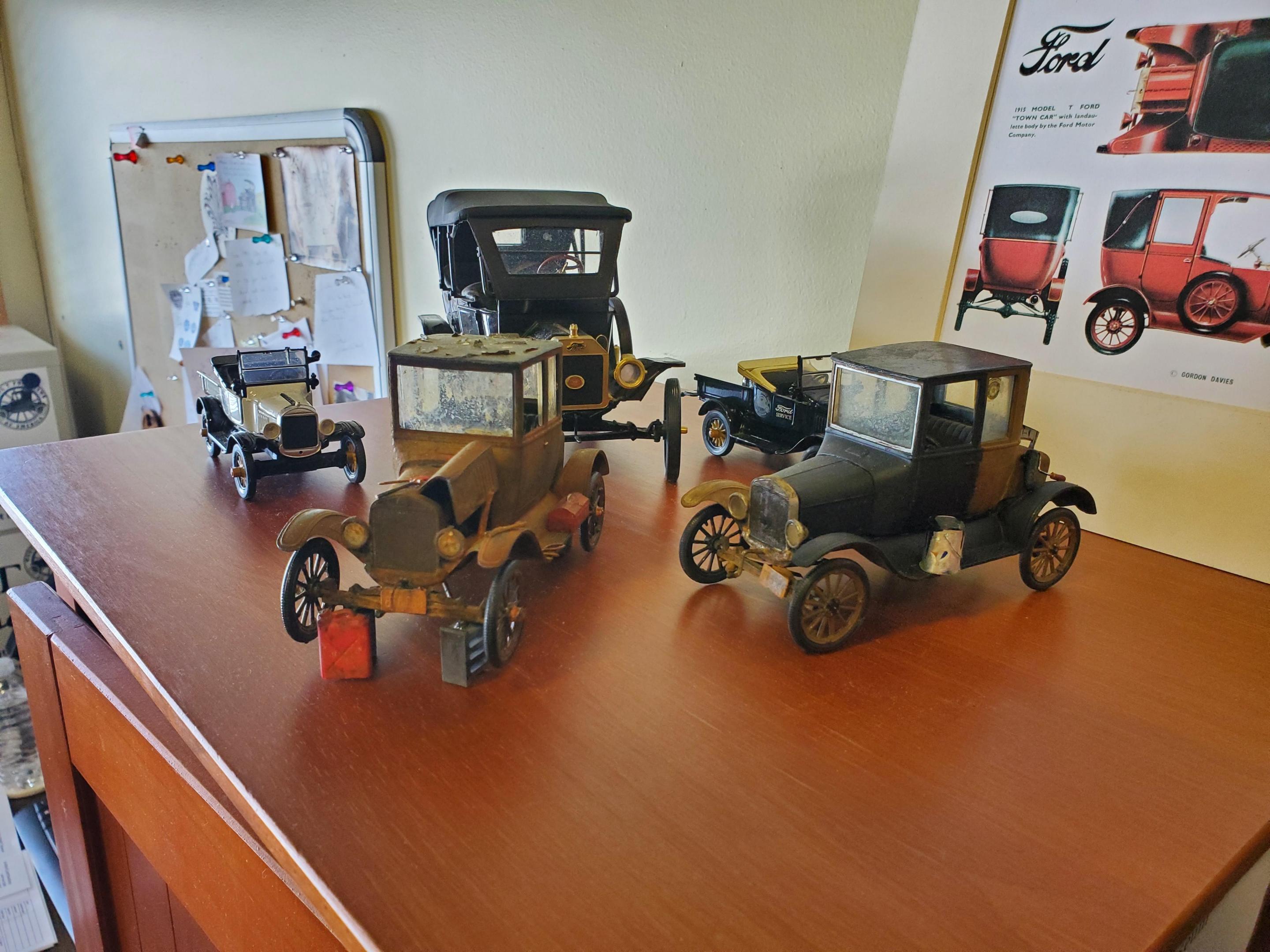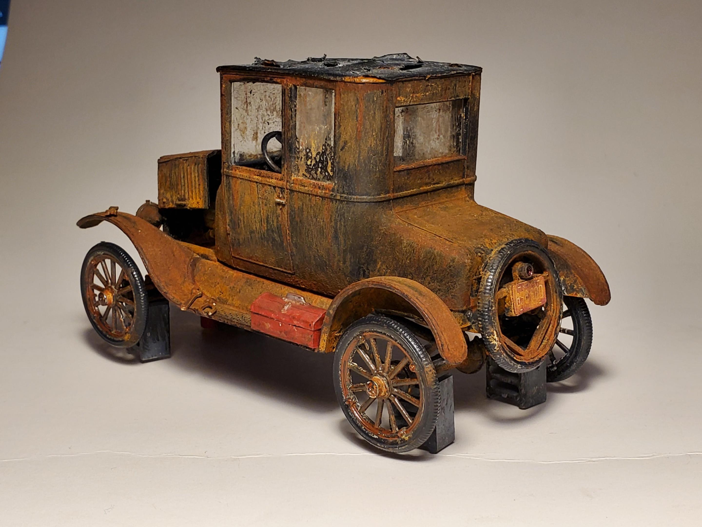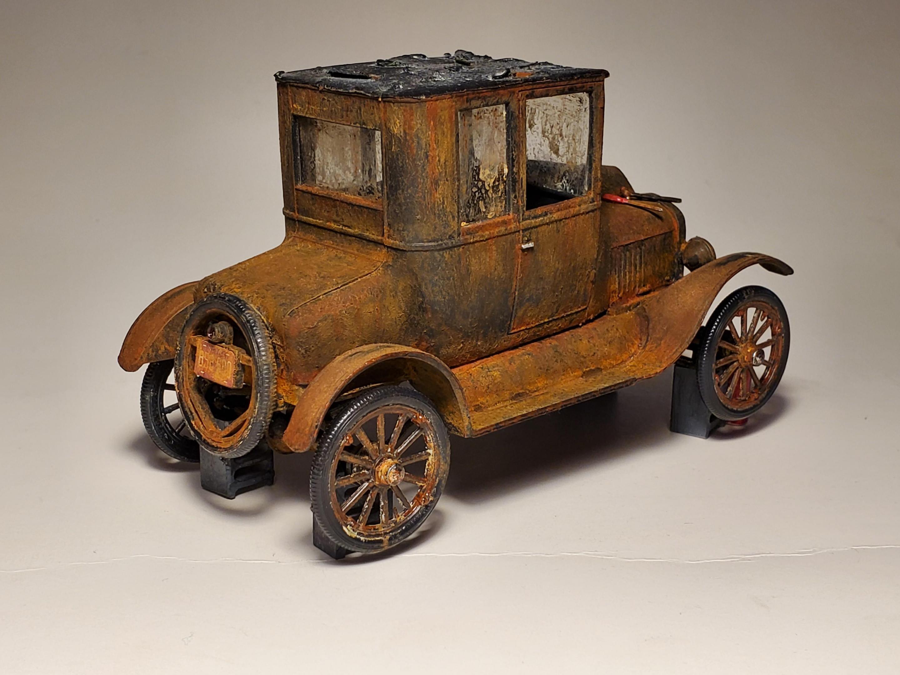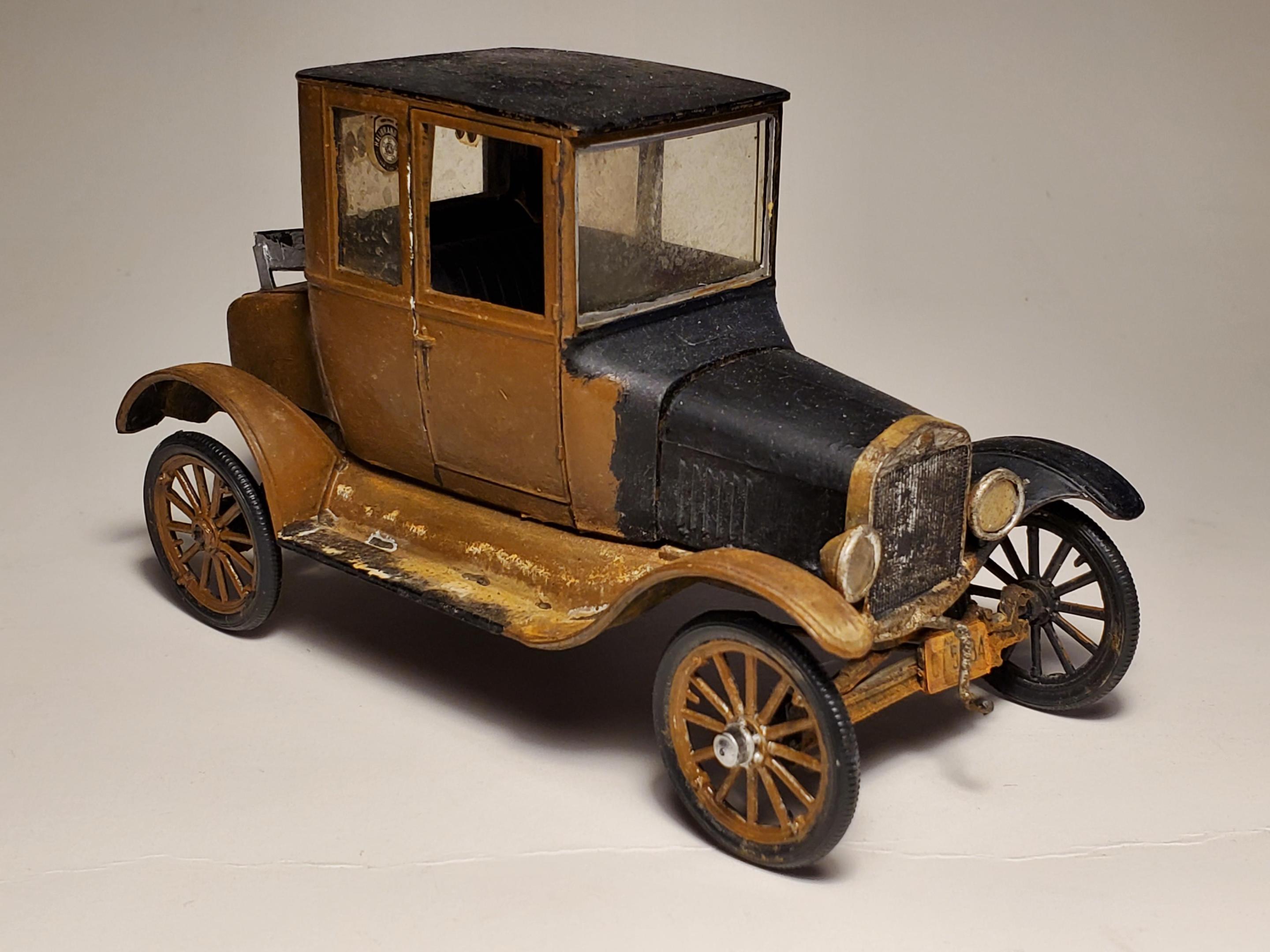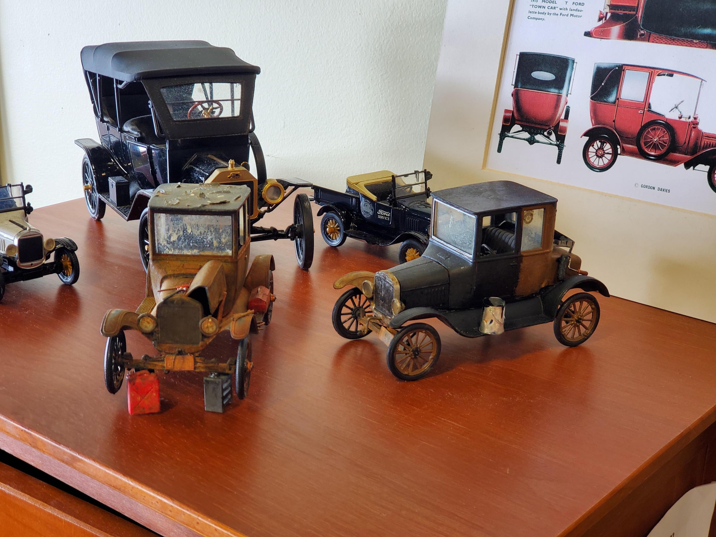 I rescued these two original issue AMT 1925 Model T built up's, separately from each other, from different people, years apart, because they were going to be thrown away. They sat on my shelf for a while collecting dust. Some model building friends and I occasionally get together and go somewhere for the day and get lunch. We chose a return trip to the Model T Museum in Richmond, Indiana. We'd been there before but we wanted to see if they had anything new going on. So one day a couple weeks before we went, I looked up at my shelf and saw those two Model T's stacked on top of each other collecting dust and said you know what I'm going to do something with those and so I took em down, dusted them off, and proceeded to figure out where to start. One of the T's was brown and black, like someone painted it brown and decided later to paint it black. I thought it was funny because that's legitimately what someone would do back in the day in real life. The other one was an old mostly complete unpainted build up. I wanted to give these T's somewhat of a backstory to explain their looks. By doing so they took on their own names. So the half repainted one became known as "Rolly" and the unpainted one would become "Rusty". So here's the tale of Rusty and Rolly: Rolly the T had been used regularly by a small town Indiana family since new, and at one time painted brown... all over... even the wheels. Rolly fulfilled it's uses and was sold to another family in town for their young son in the 50s, It was driven home, but abandoned sometime thereafter during a black repaint with a roller. You might say it's owner was taunted by the fins and chrome of the era, and was struggling to get the old T running right, so they abandoned the job mid-repaint. Left the roller on the rear fender, bucket of paint on the running board, and paint tray on the trunk. Deciding instead to go get a newer, more reliable car as a first car, instead of fixing up the ole T. So it was left in the shed out back and forgotten about. I used Modern Masters rust antiquing kit to add some details of rust on this car on the brown areas. The black areas I did have to repaint/retouch because they reacted with the rust solution once sprayed on. I suspect because it was old lead-based Testors. I scratch built the roller, bucket, and paint tray. The bucket and paint tray are made out of a pop can and the handle on the can was silver wire. The roller is silver wire with a paper towel wrapped around and super glued, then dipped in paint. The paint tray and bucket both have paint in them as well. I made an Indiana License plate for it and added it to front and rear. I think the year is 1954, but now it's too rusty to tell. Haha! Unfortunately I was missing two of the hubs for the wheels. Forgive that omission. Rusty the T was the family vehicle on the rural Indiana farm from new. It's seen it all and been through it all and was well used. By the time Rusty was 11 years old it had already fallen into disuse as cars were much more reliable and easy to drive, and those new 1936 Fords were just too nice for the now well-to-do farmer to turn down. The ole T was used around the farm for a short time before being put in the barn. The owner's son needed a vehicle to drive in the early 1940's and was given the T. The new owner put plates on the T, however while he was trying to get it fixed up, WWII broke out. The T's new owner had to ship off to war. Leaving the T to rust in the barn where it sat on blocks. Thankfully the T's owner returned at the end of the war, but a young war hero couldn't be seen in a rusty old Model T trying to impress the ladies. So a '46 Ford was bought. Rusty the T stayed in the same spot in the barn for many years, but was always kept in the family. Rusty is covered in Modern Masters rust antiquing 2 part system, (think sophisticated finishes) and several colors of Vallejo rust washes and black washes. Also several colors of Tamiya weathering powders. I used a piece of masking tape for the top, and shredded it up with an xacto knife. License plates were made by me, and I think this one is an Indiana 1943 plate. I couldn't seal any of my weathering, or take down the shine on the tires because it was January here in Ohio, and too cold to spray a flat clear down. When I get them back I will. The tools and tooboxes were parts box items I dug up and weathered. The hand crank on this one was scratch built with silver wire, with a superglue blob as the knob/handle. One thing I forgot to do, after taking these pictures, was actually prop the hood up. Because they wouldn't sit like that on their own. I also added some "barn bird poo" on the back of it by flicking white paint on with a paint brush. So here's that pic. I used a piece of styrene carved randomly to look like a stick that was a Y-shape, found somewhere on the ground and used to hold the hood up. And some white testors paint splattered on it w/ a paint brush to look like birds in the rafters were leaving some presents. Here's both of the cars at the Museum after I donated them temporarily for display, sitting with some other die-cast T's.