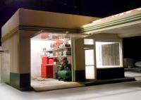 3. I'm starting on the lobby interior. I made the soda cooler & counter out of styrene & then printed up some maps & posters. The cardboard stand up is the Texaco Man : ) I still need to make some displays for the counter, a cash register & perhaps a rack of snacks. I don't want to go totally crazy on the lobby interior because most of it will not show in the end anyway. That was one of the things I learned when I worked in L.A. as a scenic artist, never waste time on things that won't show on camera. : ) Notice how through the lobby windows just a hint of an interior sells it as being completely detailed.