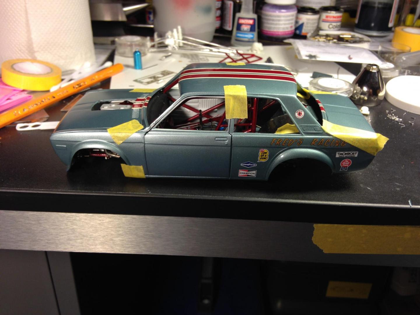 Dave,Scott,Tyrone,john and Art, Thank you guys,your words means a lot. It is time to uppload the completed build,and of course,if you want to ask something or see a picture of some details that are blurry on some picture,i will try to uppload a better picture. And also again,thank you all,for watching this build,maybe you could use it as a guide,or just inspiration. We all want to build better models and this forum is a very great source. My competition is primarily against myself,but if i visit a modelshow and takes a trophy,it´s a bonus. I have also done a list of what i have used for this build, and if you like to read it or not ?,after the list comes the completed pictures. The original kit: Revell 1/25 Datsun 510 Used from kit: Body, firewall, only two halves without the transmission tunnel, floor,glass, upper dash, Door panel (inside) headlight lenses. Cardan tunnel: Scratchbuilt of a ballpoint pen. Hood scoop: Competition resin. Rivets on scoop: Model factory hiro. Headlight reflectors: scratchbuilt of metal rivets for clothes. Paint: Zero-paints Body Color: Aston Martin Celeste blue. Stripe Color: Aston Martin Toro red. Bolts,Nuts,washers: Scale hardware and RB-motion. Wheeliebar: RB-motion stainless tube, Evergreen rod. Wheeliebar Photo etch: Machine aluminum specialties. Wheeliebar WHEELS: Scratchbuilt. A/N fittings: RB-Motion Carburator linkage: Model car garage. Seatbelt hardware: Model car garage Seatbelt: Tamiya masking tape. Gauges: Model car garage. Nitous bottle with photo etch: Detail master. Nitrous pump: Scratchbuilt Fire extinguisher: Detail master. Seat: Revell Firebird Pro Stock. Pedals: Futurattraction Fuelfilter bracket: Machine aluminum specialties. Ignition wire and battery cable: Detail master. Wire looms: Pro tech. Braided line: Pro tech. Fan: Pro tech. Rollcage: Scratchbuilt of Evergreen rod. Wheeltubs: Scratchbuilt of Evergreen platic sheets. Trunk floor: Scratchbuilt of Evergreen plastic sheets. Tube chassis: Scratchbuilt of Evergreen rod. Chassis tabs: Dirt modeler Rack and pinion: Scratchbuilt 4-Link plates: Futurattraction Rod ends: RB-Motion. Brakes: Futurattraction Front struts: Futurattraction Headers: Scratchbilt of Evergreen rod, Painted with Alclad Chrome. Engine:351 Cleveland/lenco transmission : Futurattraction Pulleys: Scratchbuilt. Radiator: scratchbuilt. Hinges: scratchbuilt. (Made of rod ends and pins.) Rear end springs: scratchbuilt in aluminum. Checker floor plate: Aber Electronic boxes: SMBC Knobs on dash: Model factory hiro. Decals: Slixx Rear tires: Competition resin Front tires: Revell Jungle Jim Vega F/C Front rims: competition resin,painted with Alclad and Humbrol grey. Center cap: Scratchbuilt. Rear rims: Competition resin,painted with Alclad. Rear panel: cast in clear and replaced. Chute: Revell Vega F/C Chute bracket: Scratchbuilt of Evergreen plastic. Fuel cell: Scratchbuilt of plastic. Batteries: Revell Olds Pro stock, (separated) Fuel filter/fuelpump: scratchbuilt. Battery harware: Detail master. The painted wheeliebar. Scratchbuilt wheels and some Hardware. Sorry guys,i have forgot to assamble the cardan axle,.....i will... Ok guys, this is it ! I ´m just wondering what build i will do next?? any suggests ? And comments are welcome. Fred. -