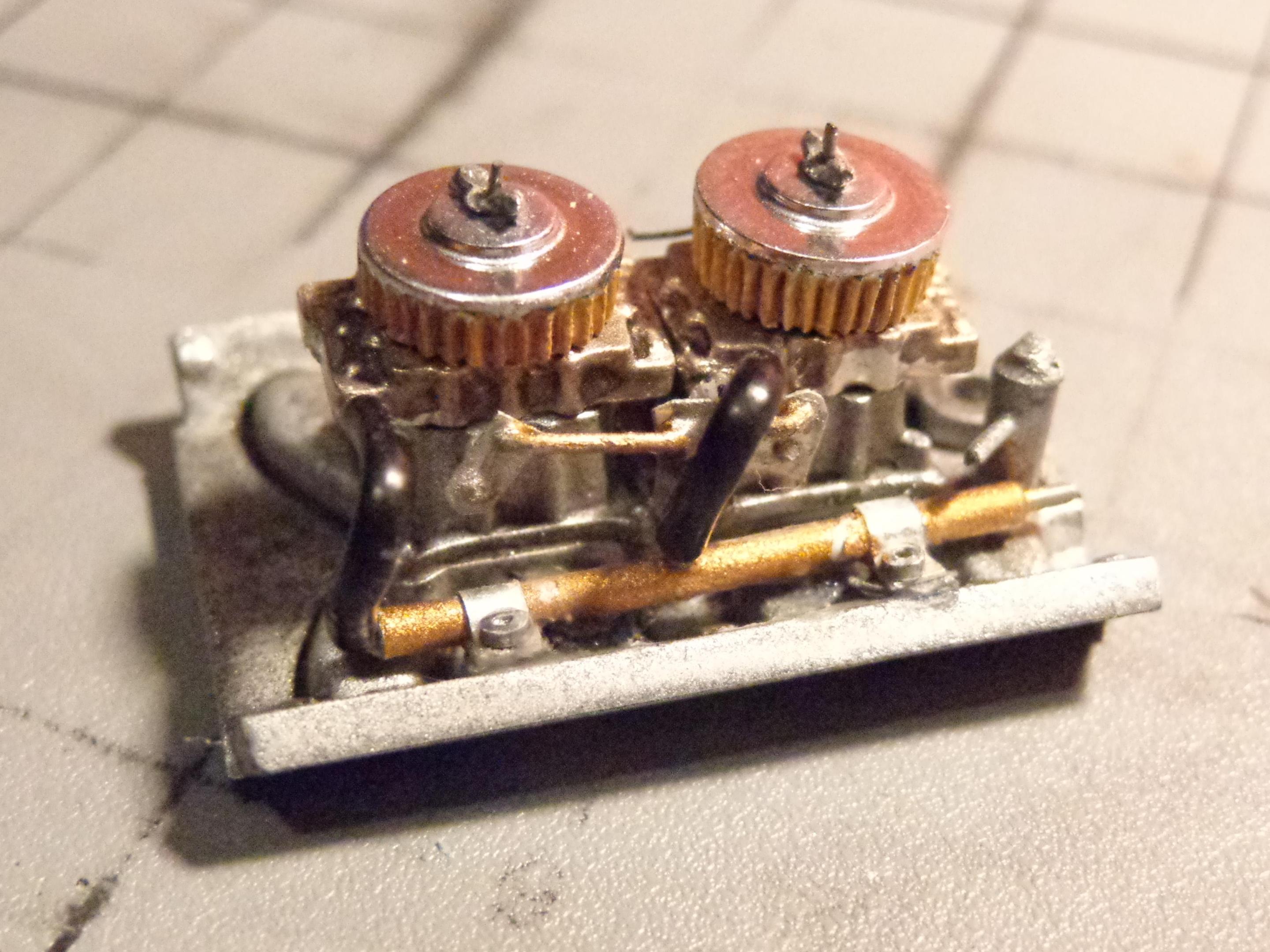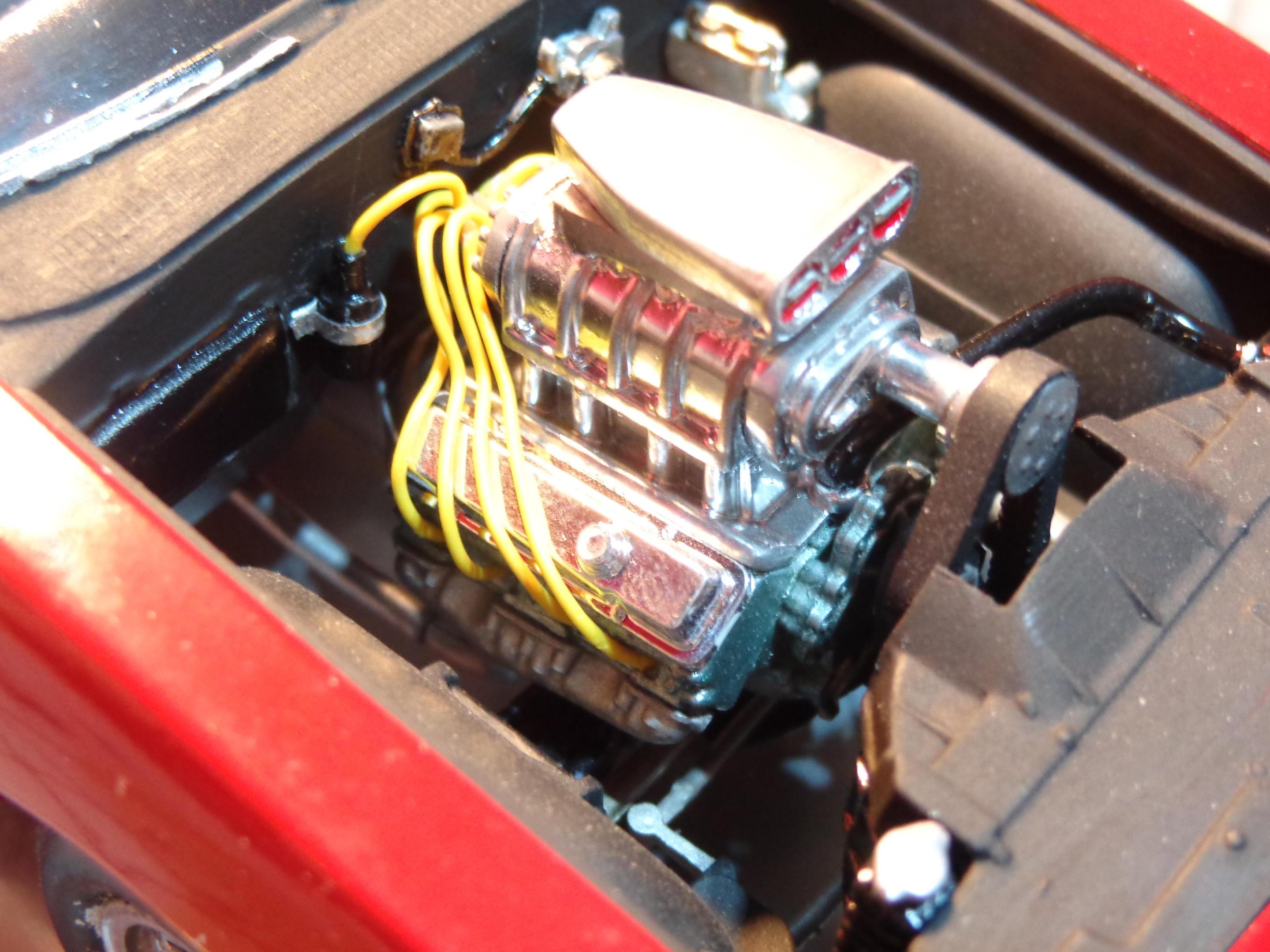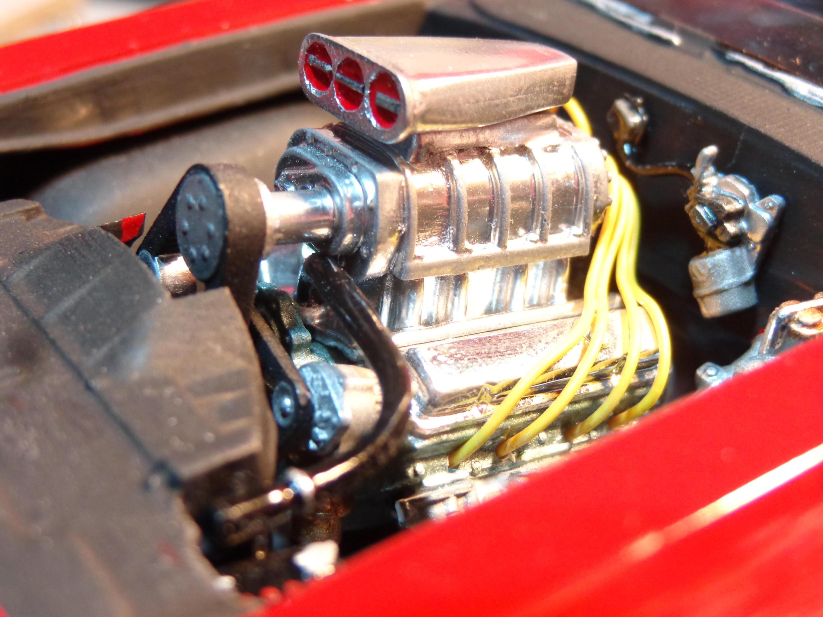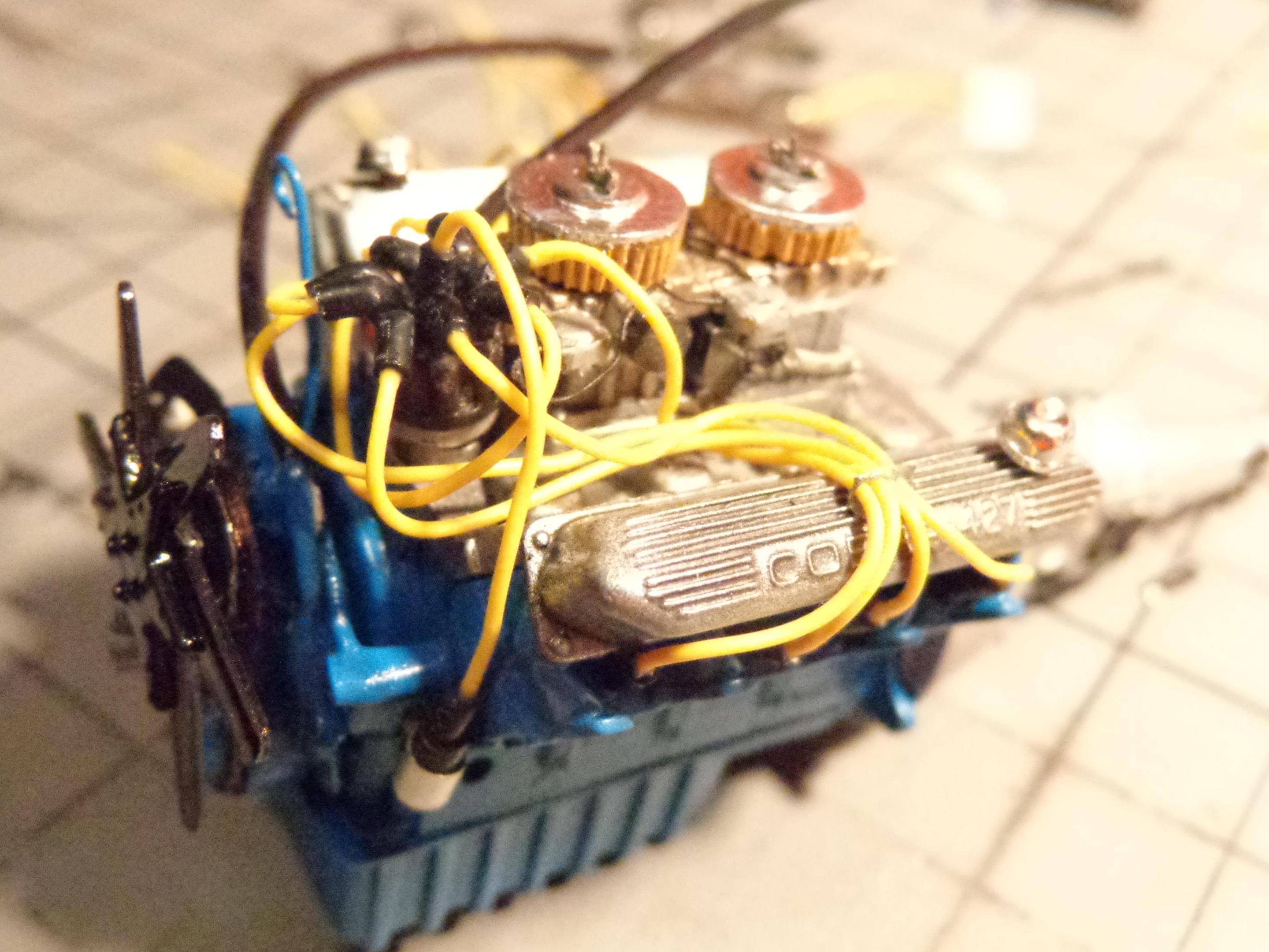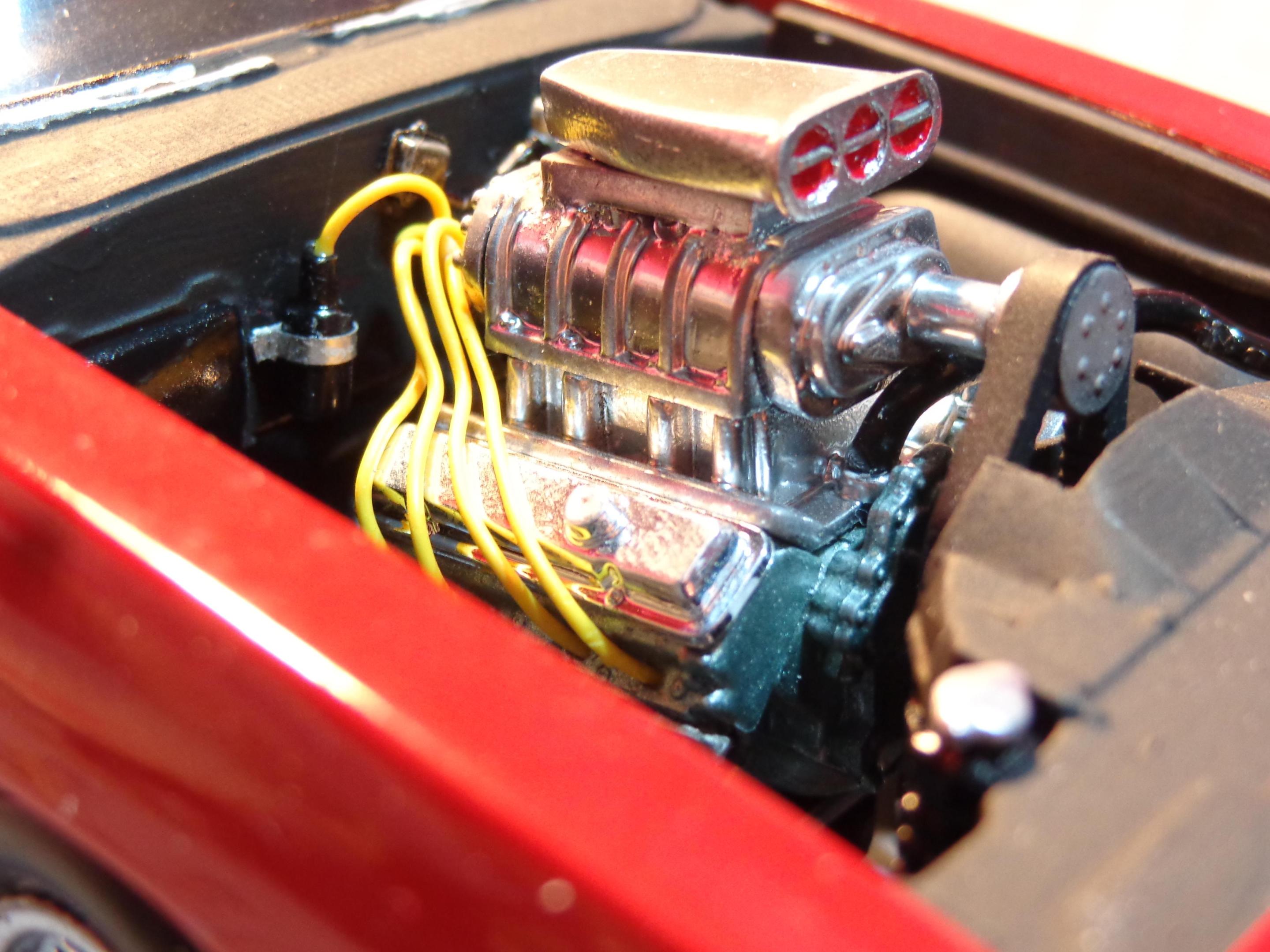 I didn't like the way they had the dual quad setup done. After looking at reference photos I noticed that the carbs were oriented the wrong way. The bowls should be front to back, not side to side. Had to modify them a bit to fit that way. It still looked pretty sparse so I did a fuel rail and made the vacuum canisters for each of the carbs. Made up some linkage and a return spring. Put a piece of wire for the air cleaner studs and made "wing nuts" to top off the air cleaners. Overall this kit is a nice kit. Kind of fiddly. I did one when I was a kid (I still have it) and thought I'd like to do another one. It's about 85% done. Stalled on it again because of the extra details I've been doing to it. Maybe I need to post it on here to re-inspire me to get back to it. Keep up the good work!
