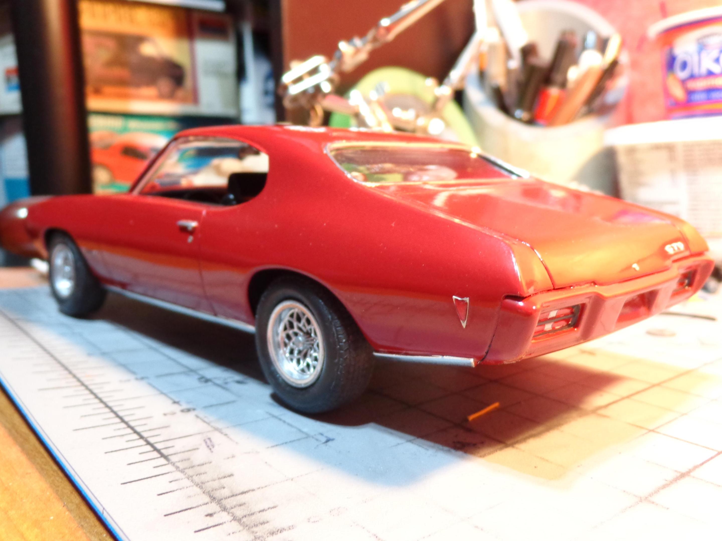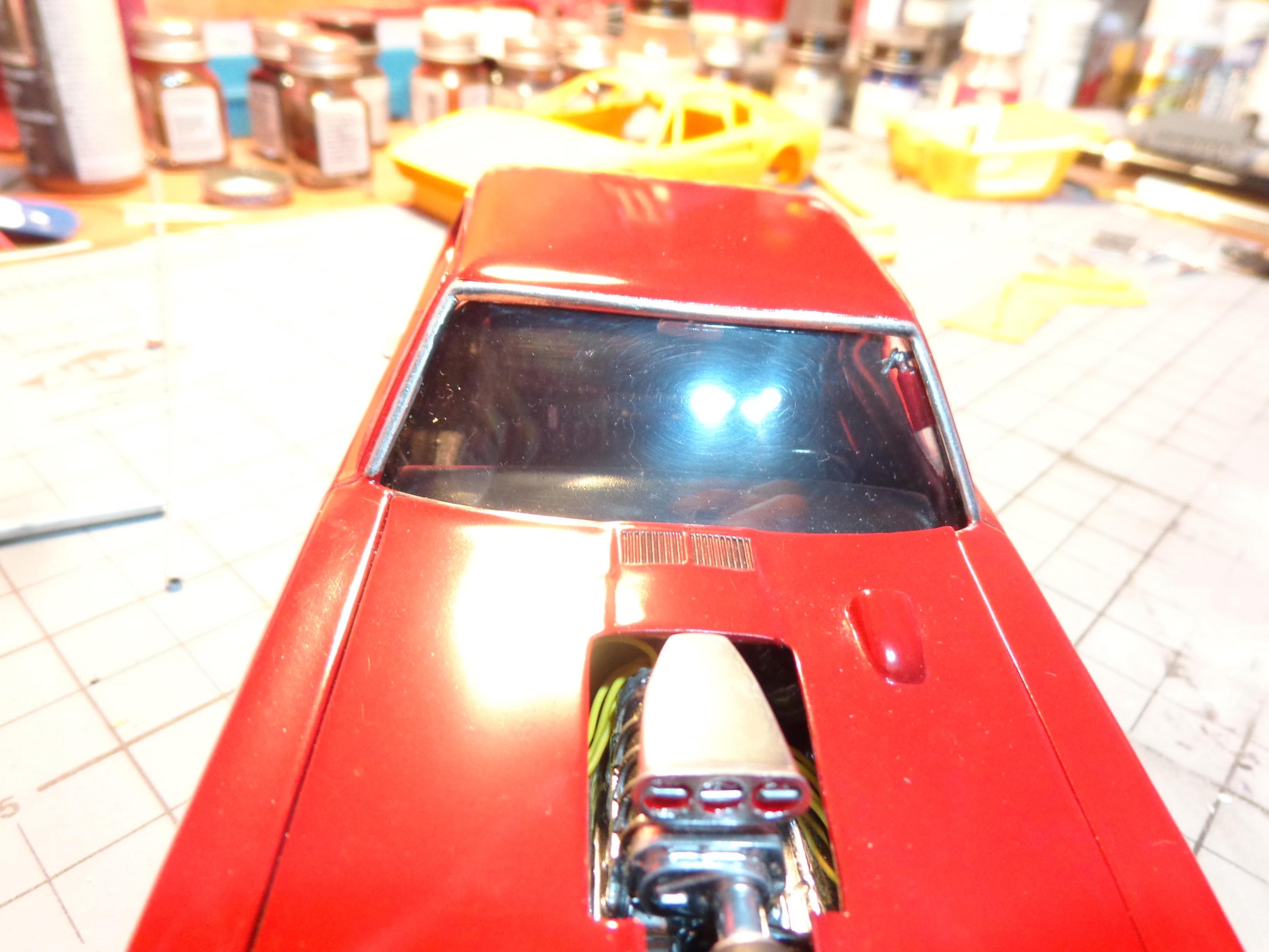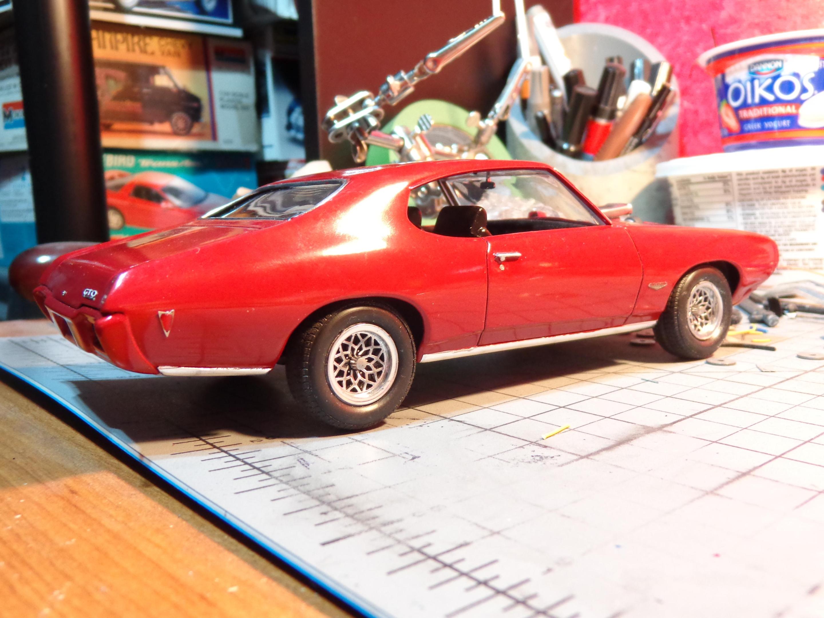 Only a couple things left to do to call the GTO finished. Waiting for the Molotow chrome to cure on the side mirrors and need to print out my license plates. In the meantime, I attached the vent windows and mounted the fire extinguisher. This is the "pre-completion" look. -