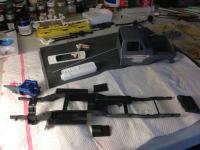Hi folks, haven't posted much, been mostly lurking and admiring. But I thought I'd put some pics up to hopefully get some tips, advice and maybe a TAD bit of critique(tongue-in-cheek) Anywho, awhile back in the welcome forum, I posted I'd been away from the hobby for 20+ years. Now I wanted to share a few EARLY pics of a model I've been building in my head for the same amount of time. I bought 2 of the AMT reissue "Super Stones" kits(one for a "just in case/future build") and I scored the Monogram F350 dually pick-up on e-bay to use in this, possibly over my head, kitbash. I've been doing a lot of modifying to the largely disappointing AMT kit. Since the 1:1 truck I'm modeling after was a '79 F350 CUSTOM, I've had to remove all the body trim and molding along the bottom, fender and along the "groove" down the side. I also re-positioned the top of the windshield and filled the backside of the cab corners. On the Monogram kit, I cut down the under side of the extended cab floor to match the single cab of the AMT kit, removed the rear fuel tank and filled some low spots/pits in the frame. I de-chromed the grill and cut out the center to allow for a tube type grill made from styrene rod. I'm a bit perplexed by the headlights though as the '79 custom version had round headlights. I used a hole punch and temporarily white glued a piece of clear plastic over the existing headlights and may just fill the area around them with putty. From the dash, I removed the vents and glovebox lettering. Be patient, I'm incredibly slow and meticulous, my next update may take quite some time. But please have a look!