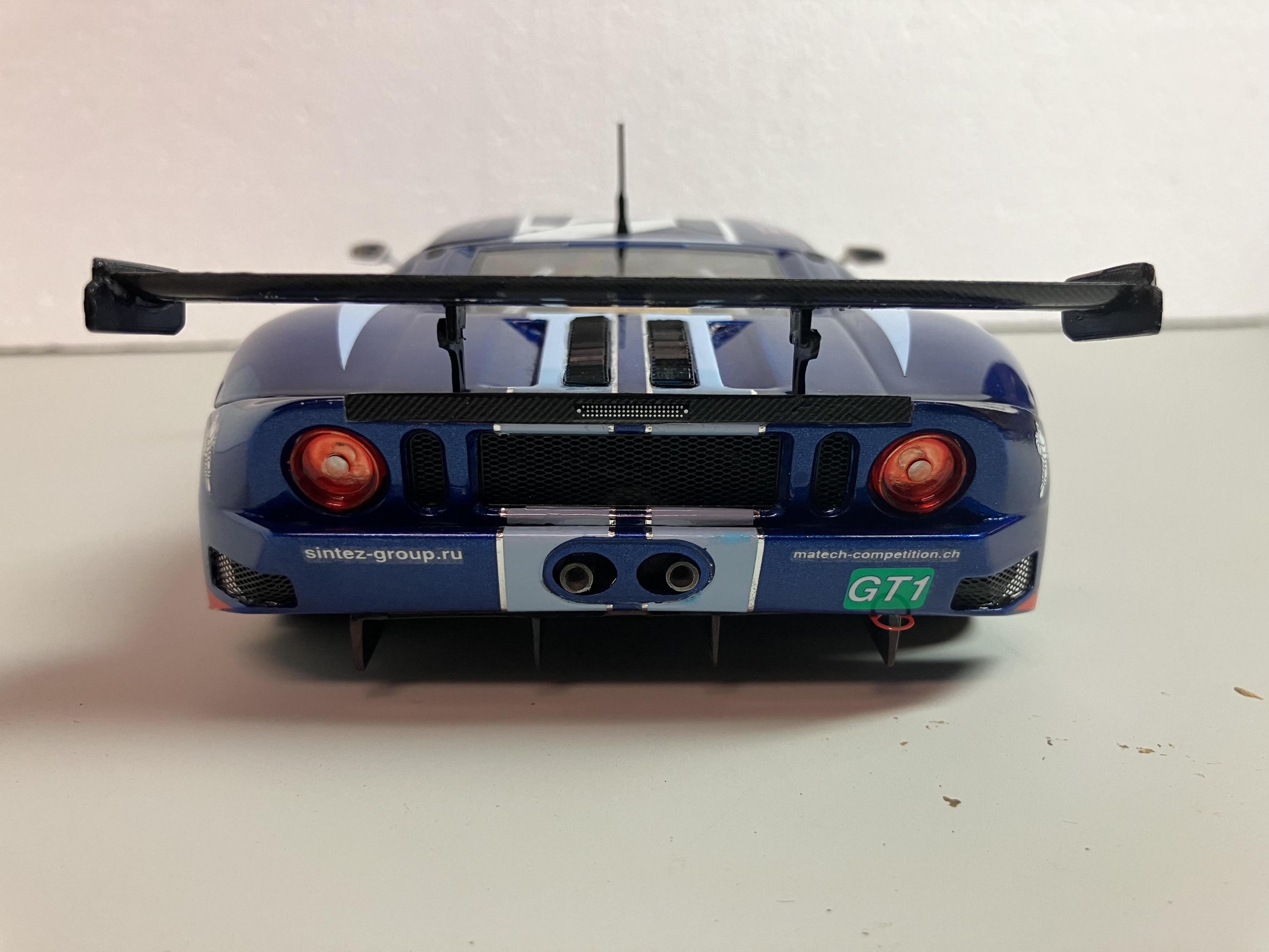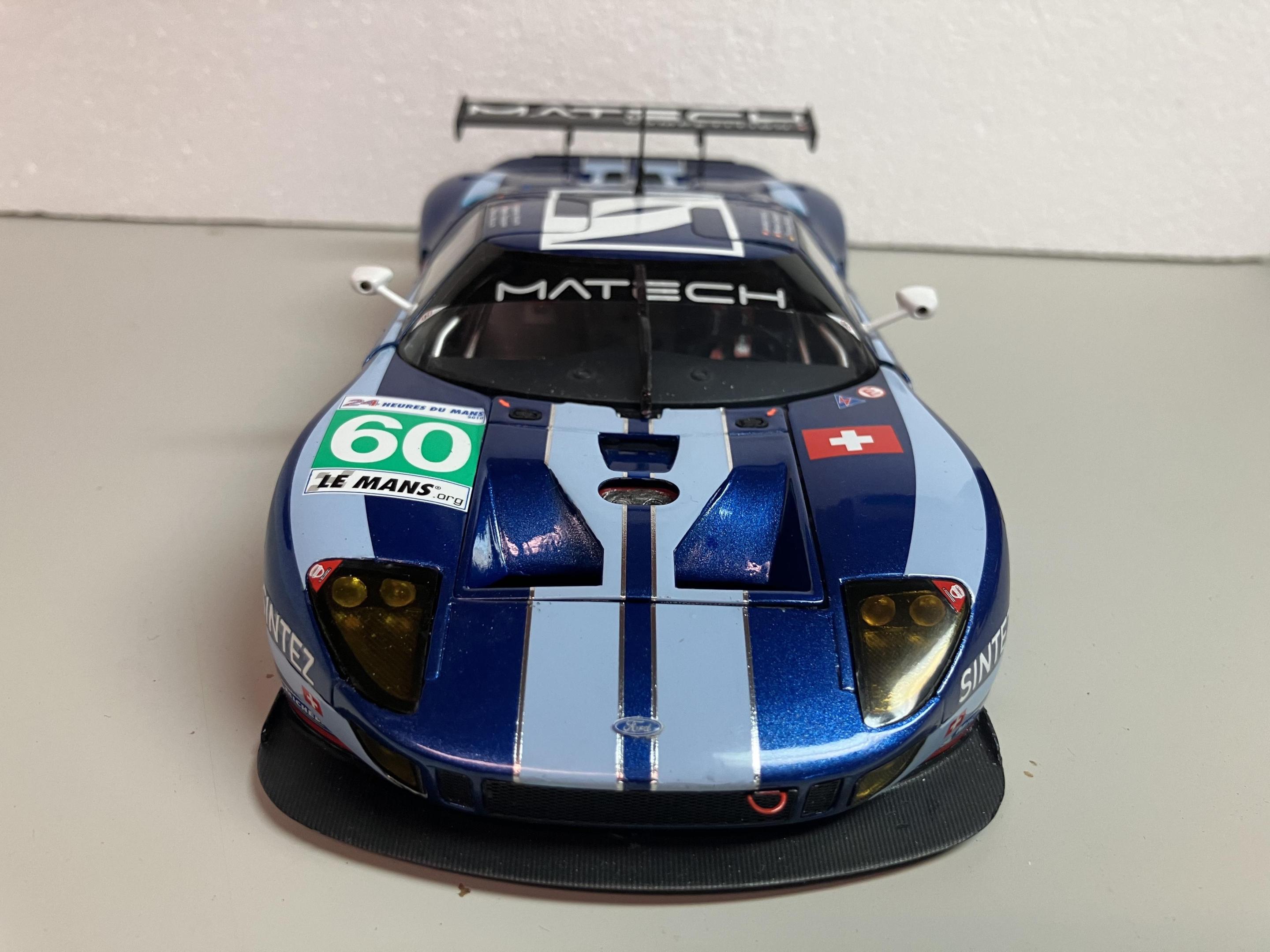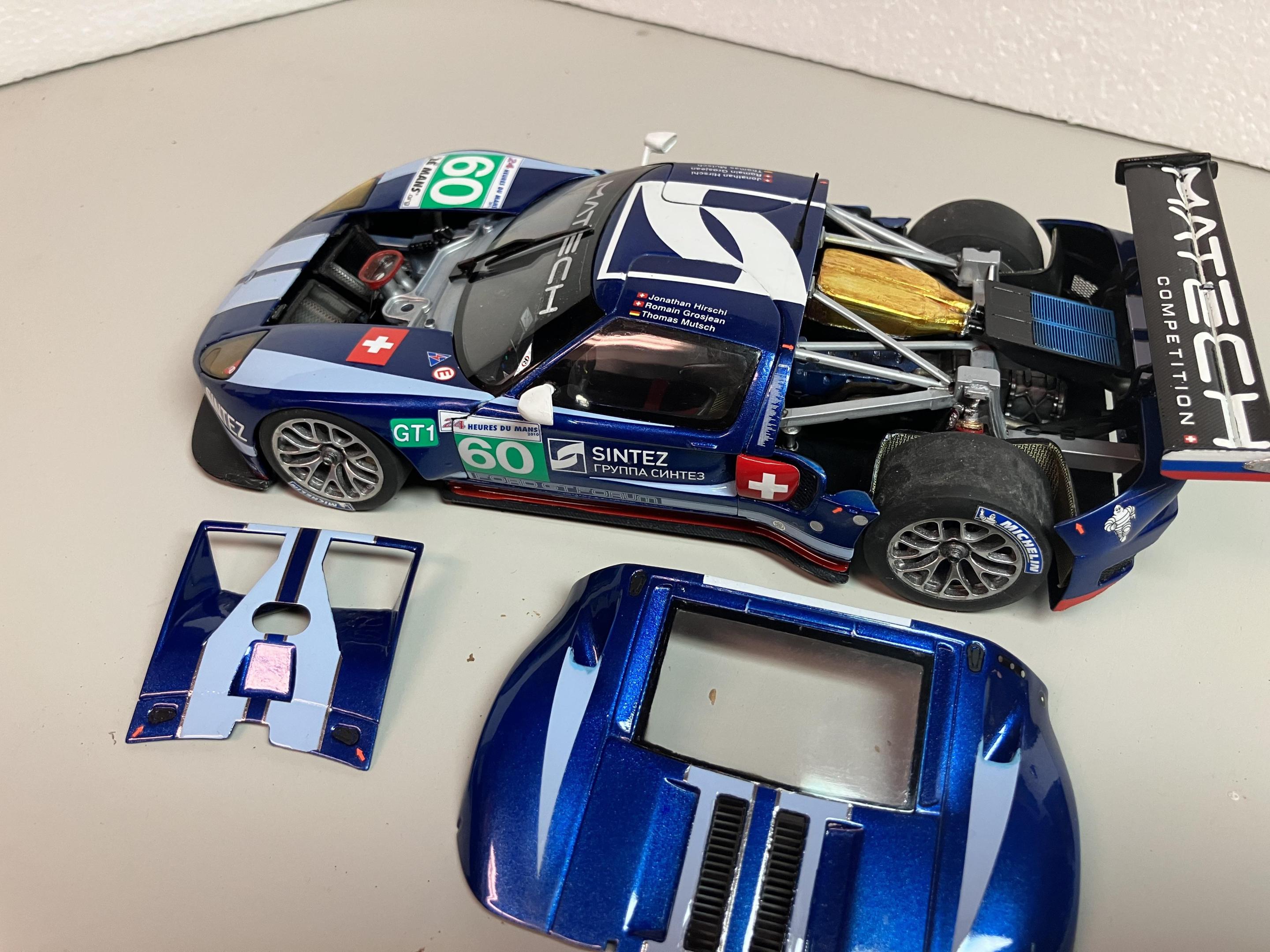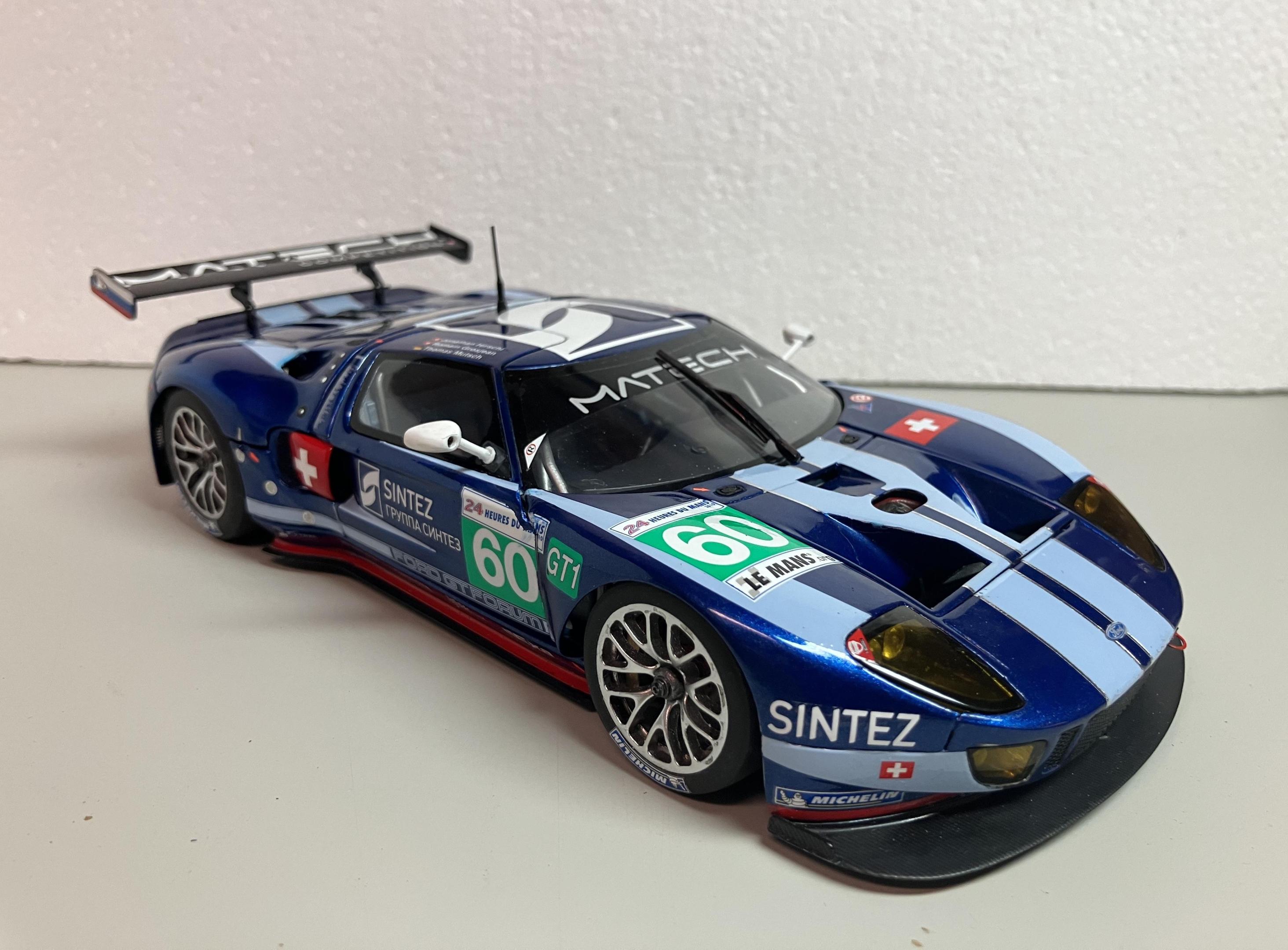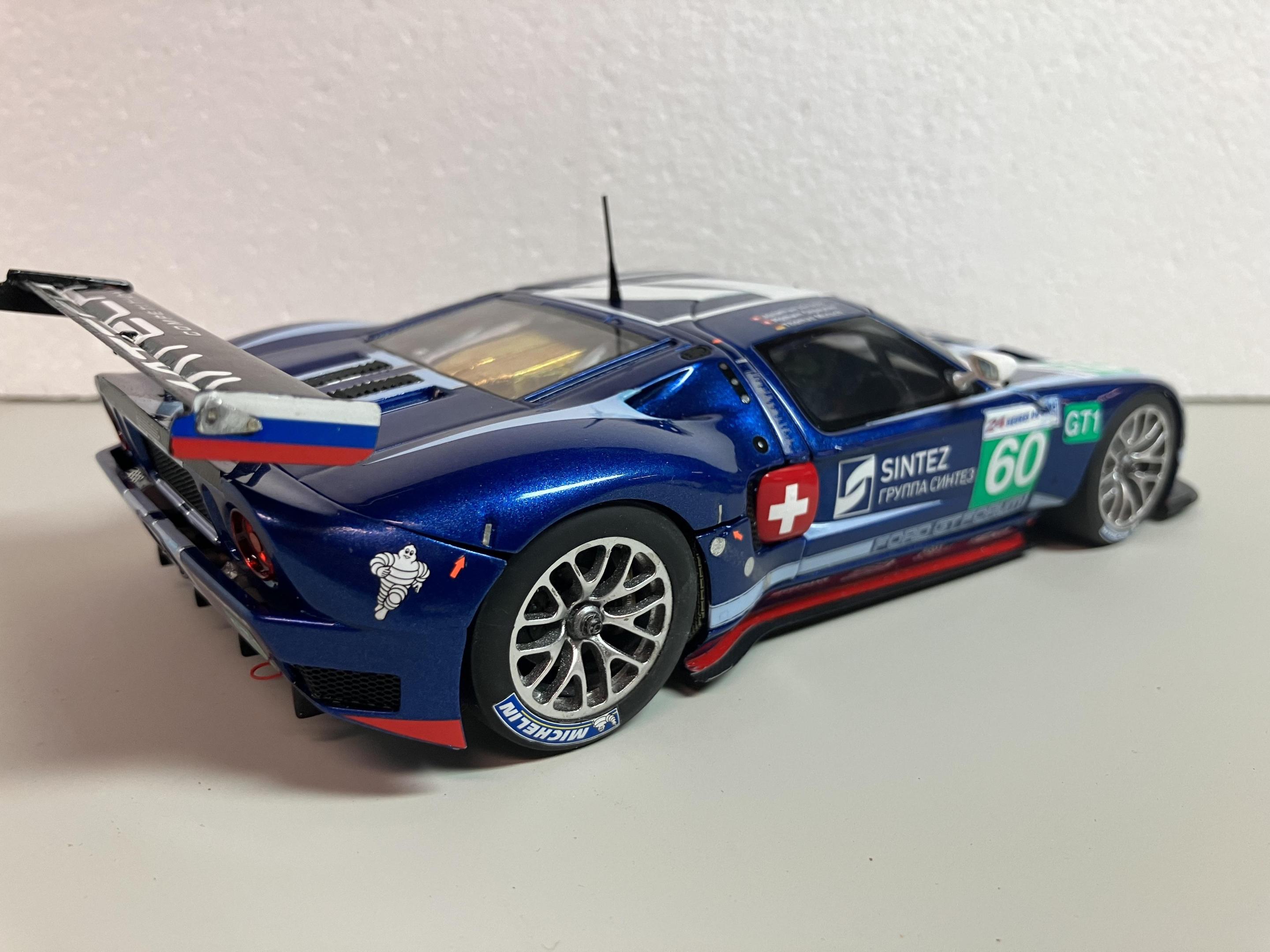 When an American car company hires a Swiss engineering co. to have a car built in Germany to be sponsored by a Russian petro chemical co. to compete in a French race (along with some other international venues as well). So glad to get this bugger kit from the short lived French model company, Simil'R, done is an understatement. I was determined to finally see this build through after putting it aside many times in frustration over the past 10 years. Not a kit for the inexperineced. Many of the assemblies lack positive mounting points so one needs to always be a couple of steps ahead in the building process to anticapate any future fit problems. The body alone is made up of 12 panels which I got to line up pretty well but wish I could of done a better job on the door tops that curve over onto the roof. The suspension A arms are very delicate and easy to break which happened to one of mine so a bit of repair was needed to fix and to hope I made it strong enough to support the weight of the large wheel/tire. Then when I got the front suspension all assembed the track was too wide with the tires sticking out about 1/8 inch past the fenders. So more carefull shortening of the front suspension arms was required to get the roundy bits tucked under the fender lips. The paint is Zero's Matech Ford GT Blue over Tamiya primer with Zero Diamond 2k clear. The decals by Cartograph were pretty good to work with except dealing with the chrome border striping. Almost impossible to get to conform to changes of surface direction. Any of my arsenal of decal sovents had no effect. Lots of blow dryer heat with firm pursuasion got the job done over long decaling sessions. As detailed as the instructions were there was no mention of placement of the p/e rear tow hook even though it's on the p/e parts tree. The instructions also show a roof antenna appearing near one of the final steps but with no part# and not one in the kit so I grabbed one from my stash since their is already a hole in the roof to mount one. If I didn't have any other projects to finish in this lifetime it would be great to add tons of detail to this kit knowing where the shortfalls are now. I was able to find loads of reference pics of the real car and it's 3 sister racers. Those images came in handy a lot with this build. All in all with all the Matech's issues I'm now happy as a joke in a giggle factory to have completed this cool car!