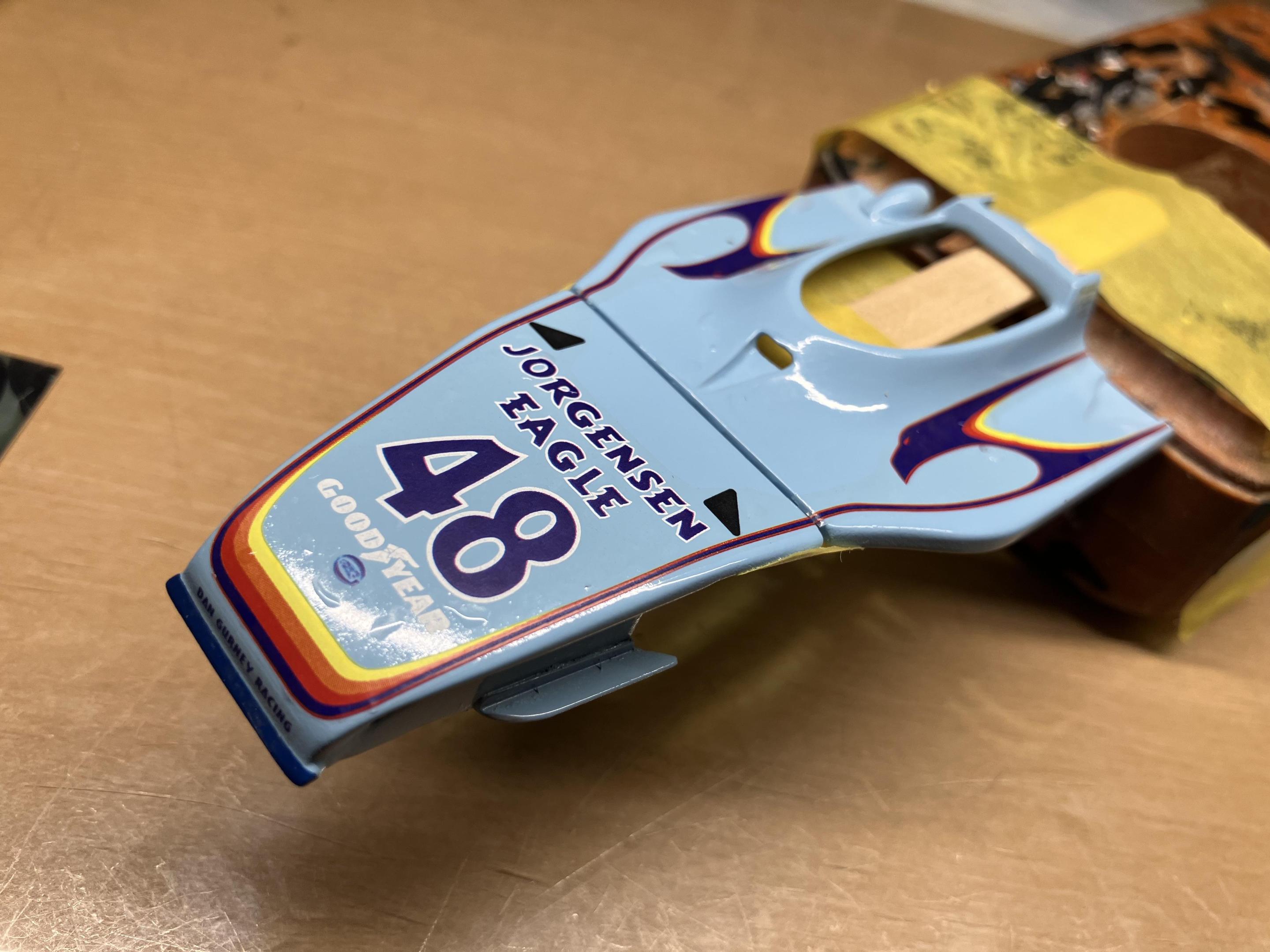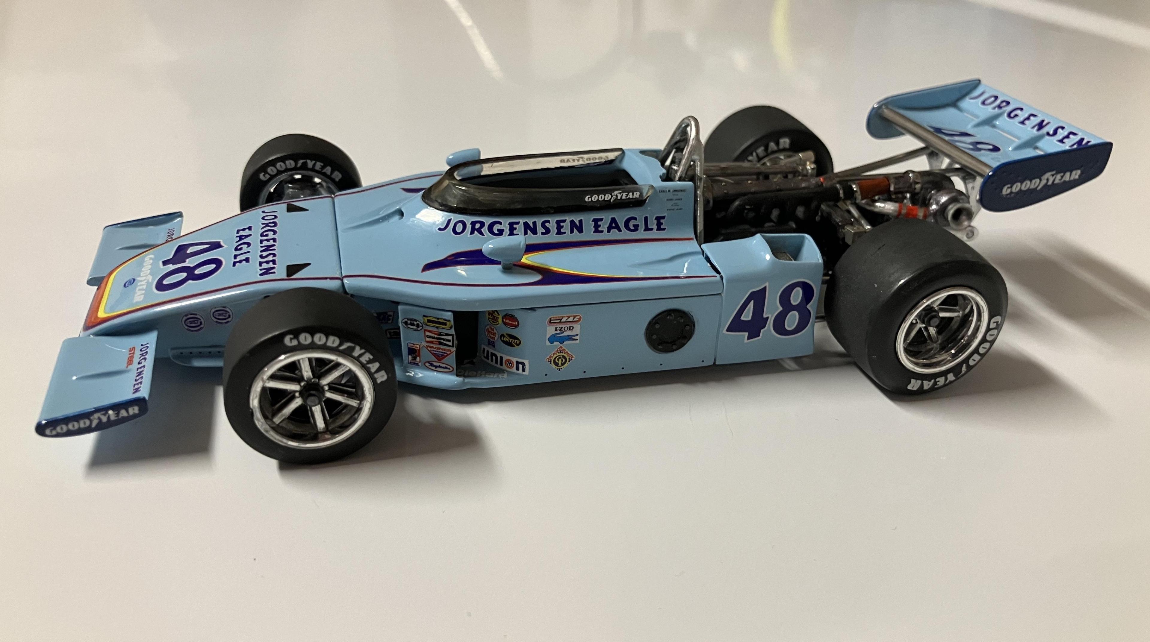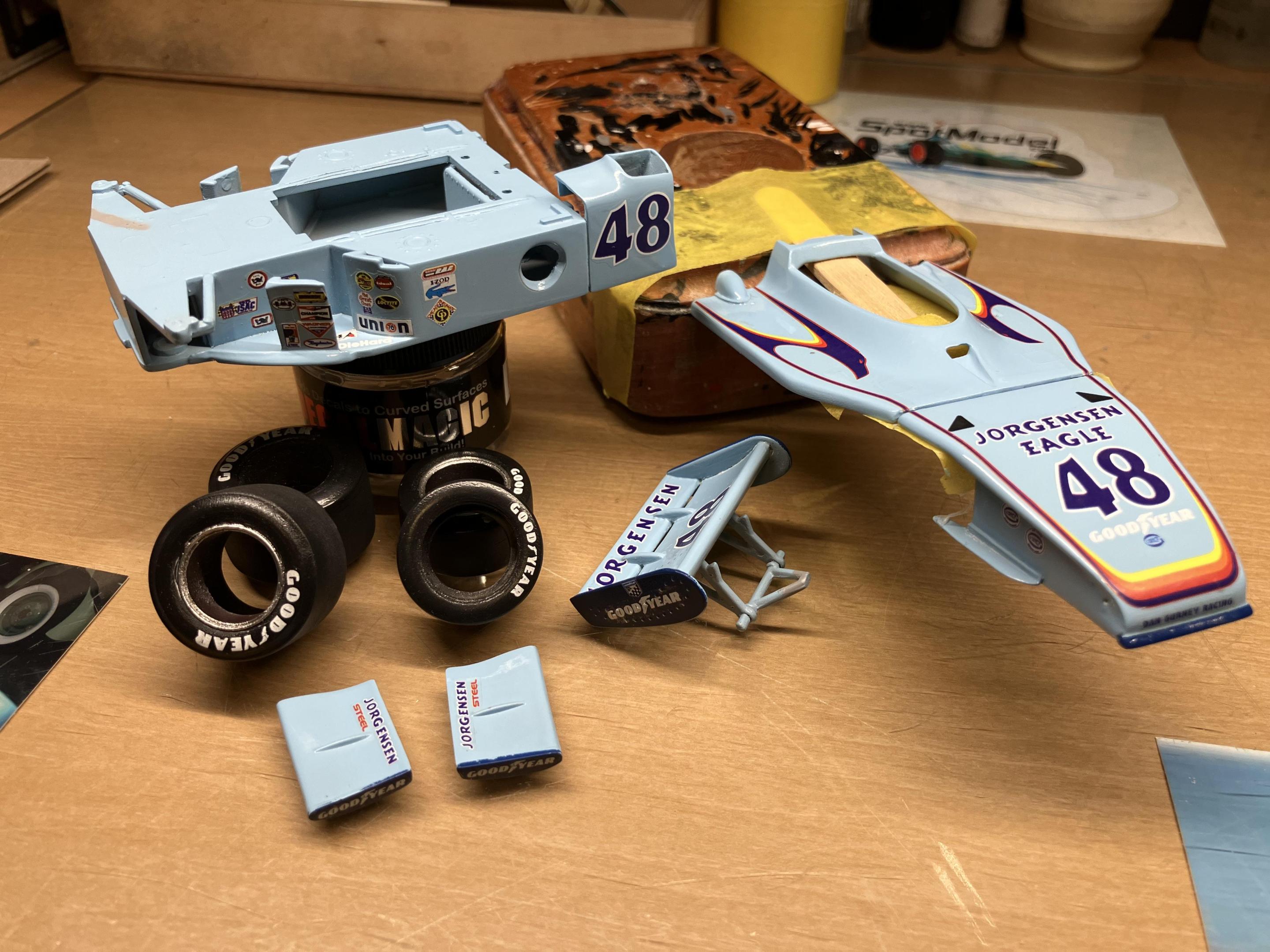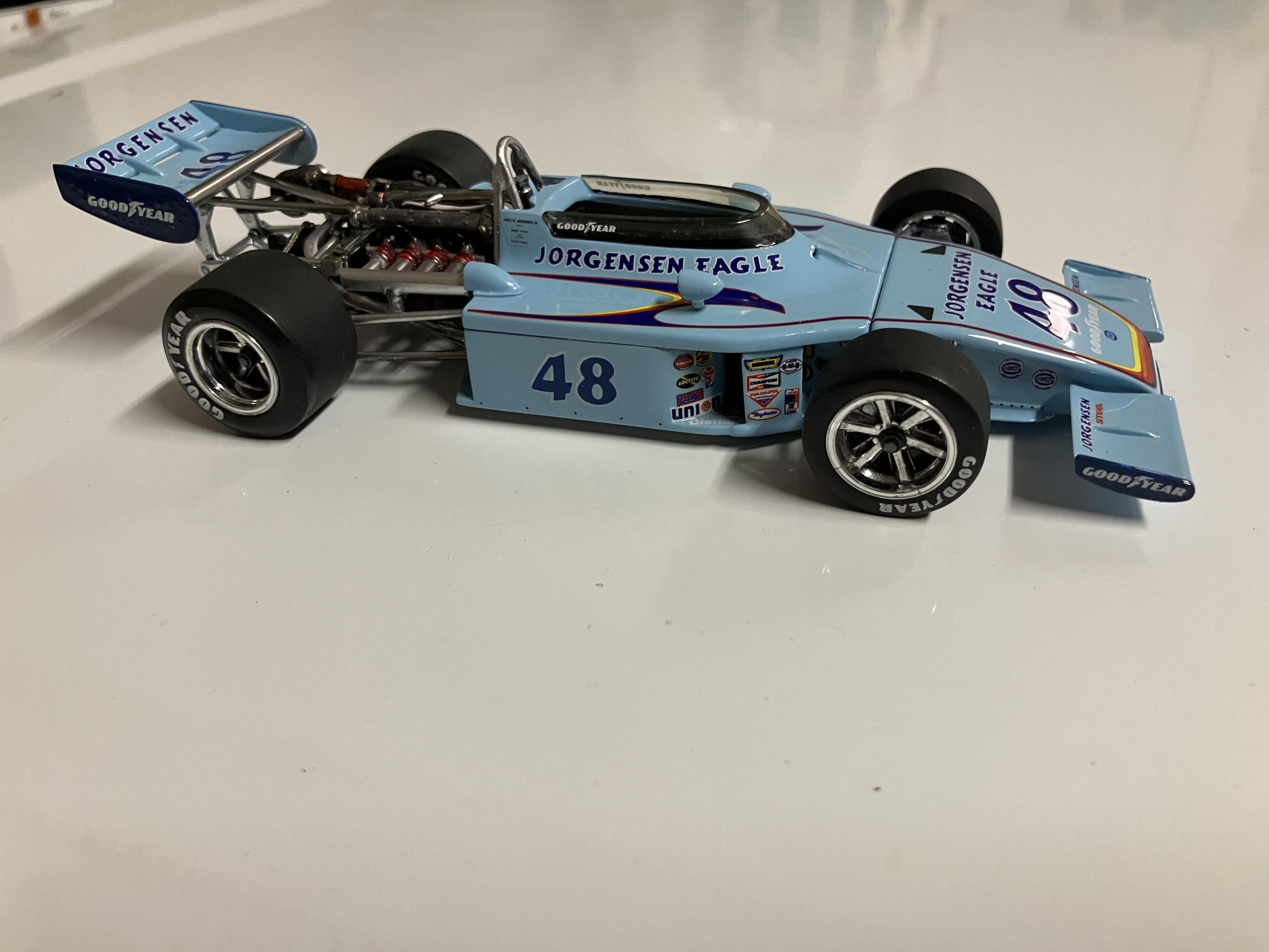 Making some progress on the 1975 Jorgensen Eagle. My goal was to just build a nice model for the shelf and not going too crazy with rebuilding everything, which much of the base AMT kit is crying out for. The old AMT is a bit of a stinker for accuracy so I did a little bit of work to make it better but not perfect if your nit-picking. Basically recontoured the nose, the kit made it look like it was ready to plow the snow off your driveway. Also scratch built a new oil cooler fairing for the left side of the body. The decals were mostly sourced from Indycals and new resin tires from Classic Racing Resins. The decals are some of the easiest to apply that I've ever used. Only needed a touch of decal set in a few spots but overall layed down perfect