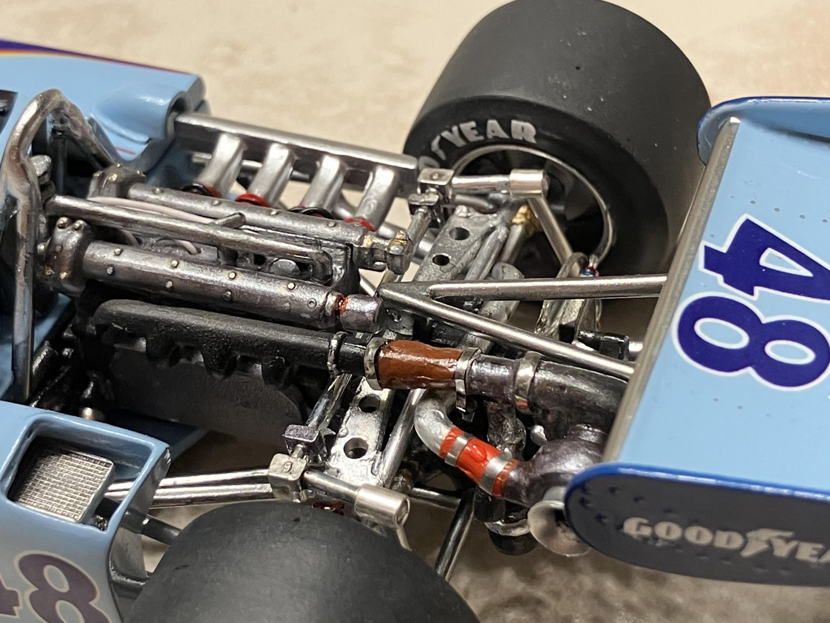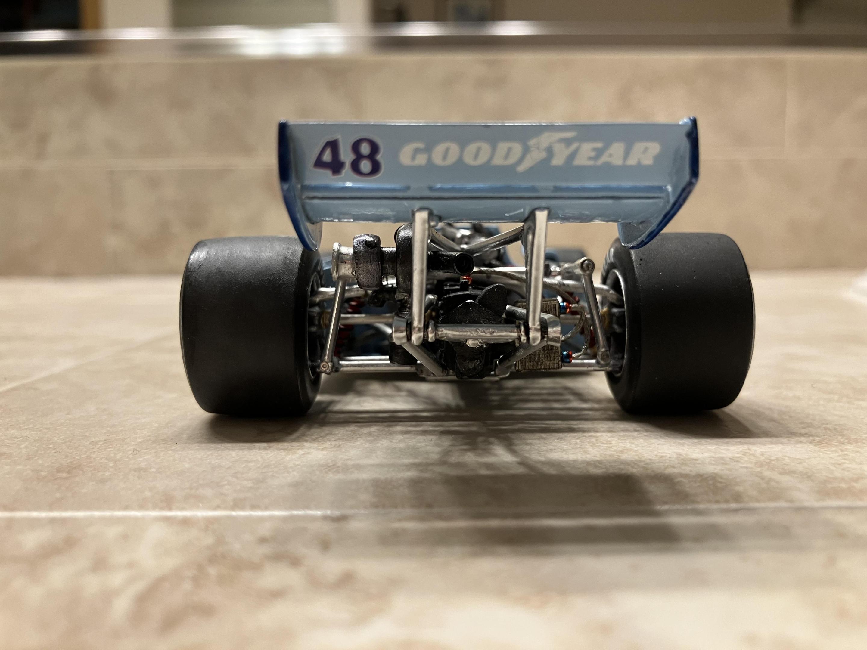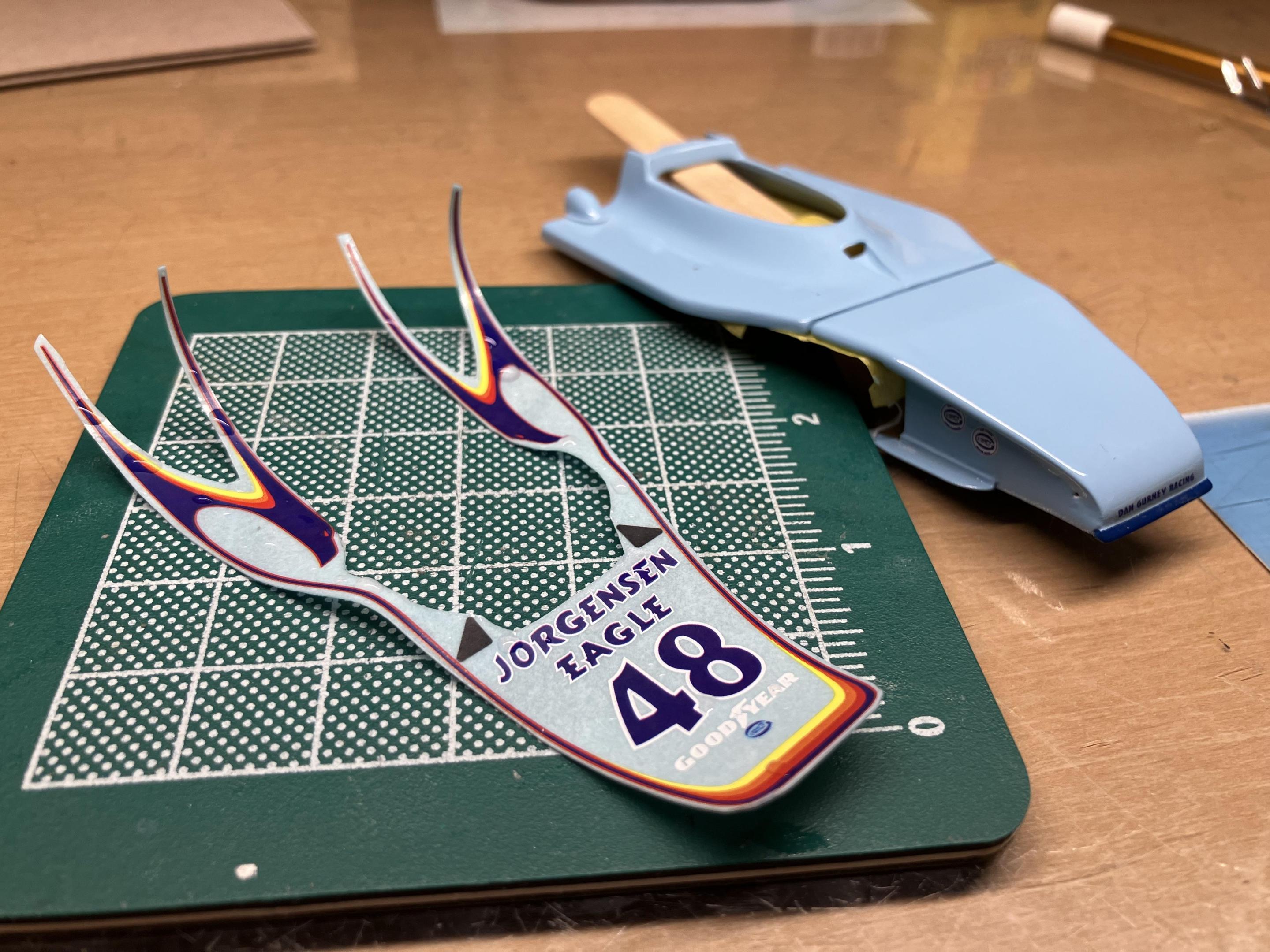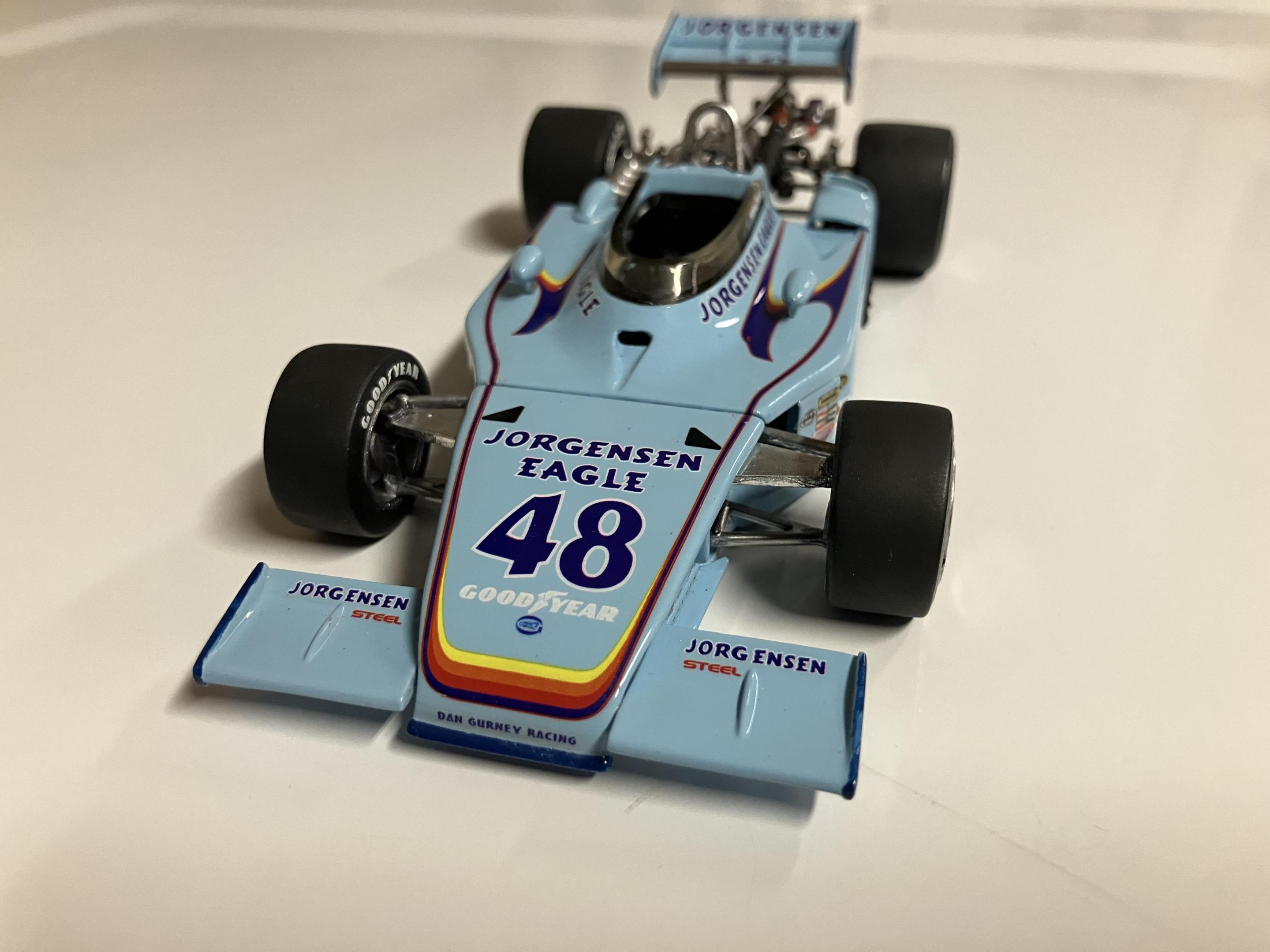 Making some progress on the 1975 Jorgensen Eagle. My goal was to just build a nice model for the shelf and not going too crazy with rebuilding everything, which much of the base AMT kit is crying out for. The old AMT is a bit of a stinker for accuracy so I did a little bit of work to make it better but not perfect if your nit-picking. Basically recontoured the nose, the kit made it look like it was ready to plow the snow off your driveway. Also scratch built a new oil cooler fairing for the left side of the body. The decals were mostly sourced from Indycals and new resin tires from Classic Racing Resins. The decals are some of the easiest to apply that I've ever used. Only needed a touch of decal set in a few spots but overall layed down perfect