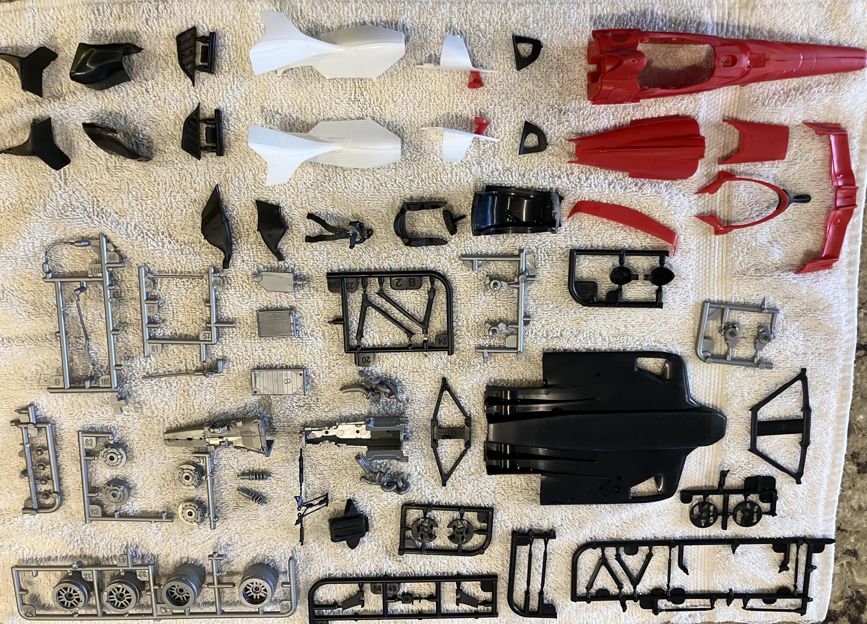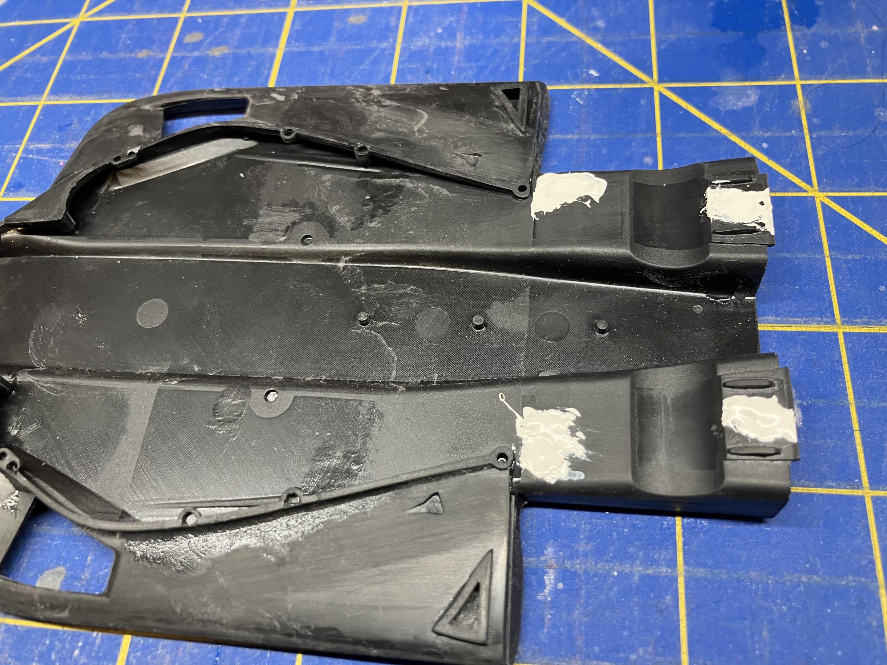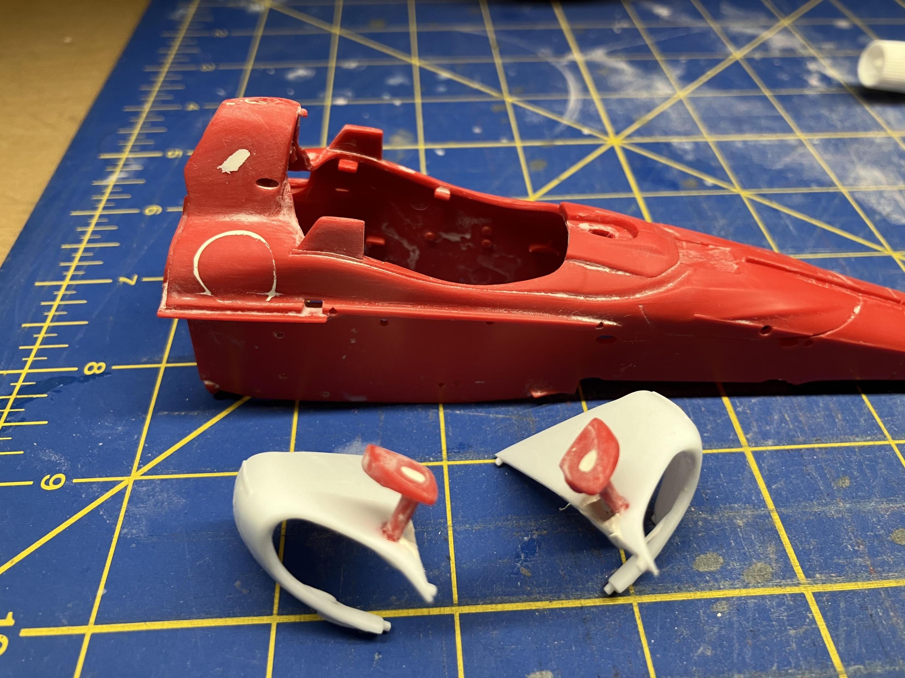 Couldn't resist letting the new Salvinos JR Indy 500 winning Dallara jump to the front of the line and push aside other projects I've been working on. After doing pre-assemby of major componets and pretty much test fitting and cleaning up the rest of the parts I'm fairly confident assembly should now proceed without too many issues. There are some sink marks on the mirrors and hoop area to deal with along with 4 more that would be visible on the rear topside of the floorpan.. Also there were a couple of nubs hiding in the recess of the halo that was getting in the way of a tight windscreen fit that I almost missed. I couldn't get the tight fit I wanted for the right side fuel filler planking plate. I think I solved that with a coat of putty. This part just needs to sit flush but with panel lines and not blended into the body work. I also added some plastic strip to the underside of the side pod joint where aylight was shinning through and blended in the leading edges. Like any good modeler, yeah right, I went through the instructions part by part before snipping any parts from the trees only to find a few typos in the instructions with reference to some part # call outs, shouldn't be a big issue if you're paying attention!