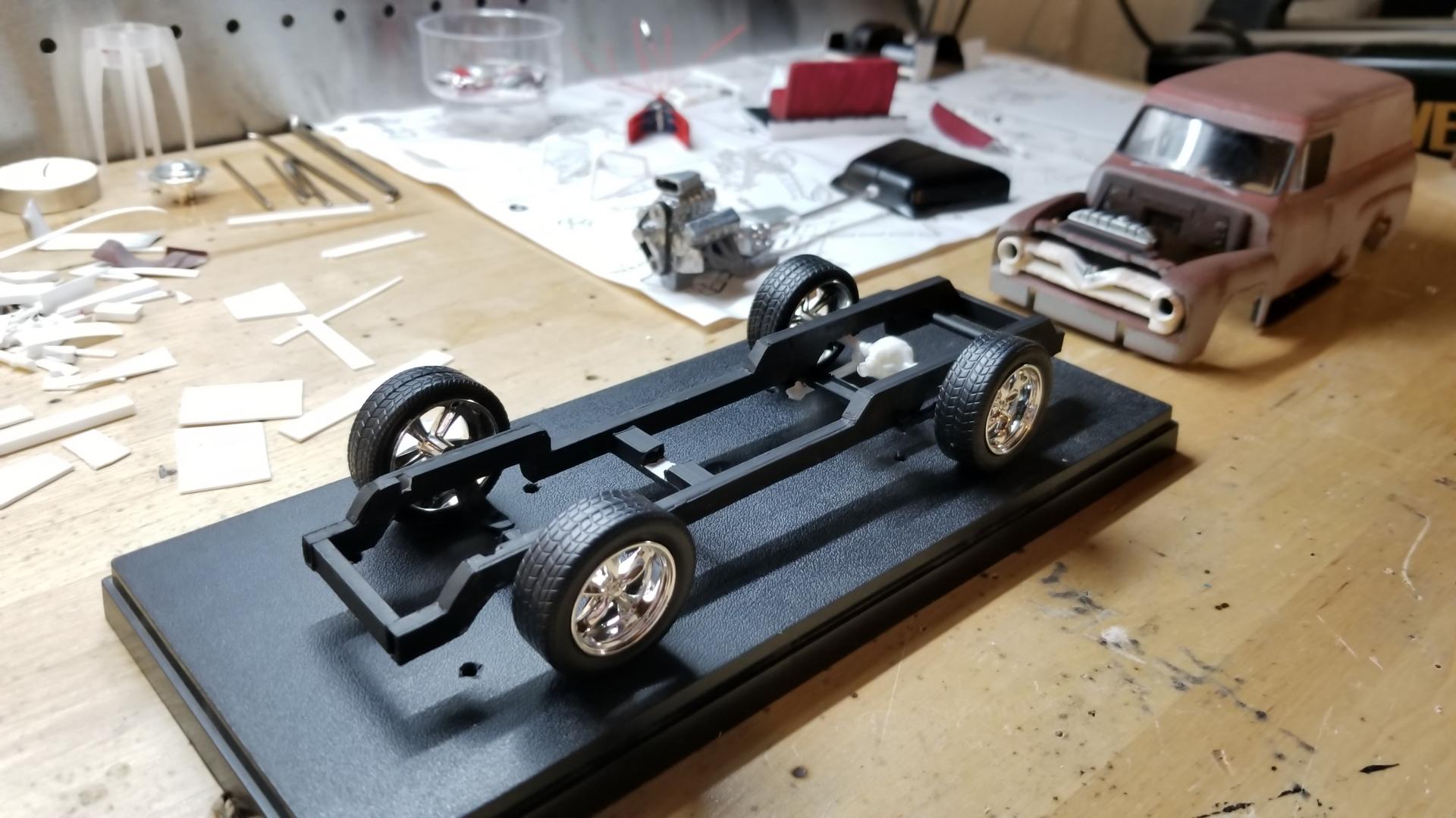 The frame is scratch built from evergreen tubing.  Front and rear suspension are from the parts box.  Engine is a resin 427 SOHC, wheels are from a diecast.