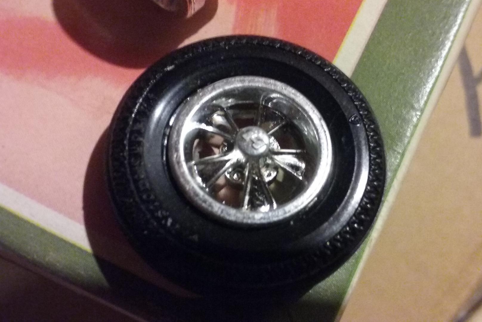 Alright, you guys made me unearth my partially built 1969 reissue from my stash. Here are some pics of the Hurst wheels that I'm HOPING get recreated in this new upcoming reissue: Normally I'd take the tires off all of these and store them separately, but two of them have the tires on there so tight that I can't pry them off without fear of busting the rims themselves (wheel backs are pretty well welded on) The way I figure it, if tire melt hasn't started after 49 years, its probably not gonna happen. Will we actually get a new version of these? I sure hope so, but my gut tells me it's more likely that they'll just include some of their newly tooled American-type mags they've been putting in some of their releases the last couple years. The Hurst wheels are pretty prominent on the box art, though...