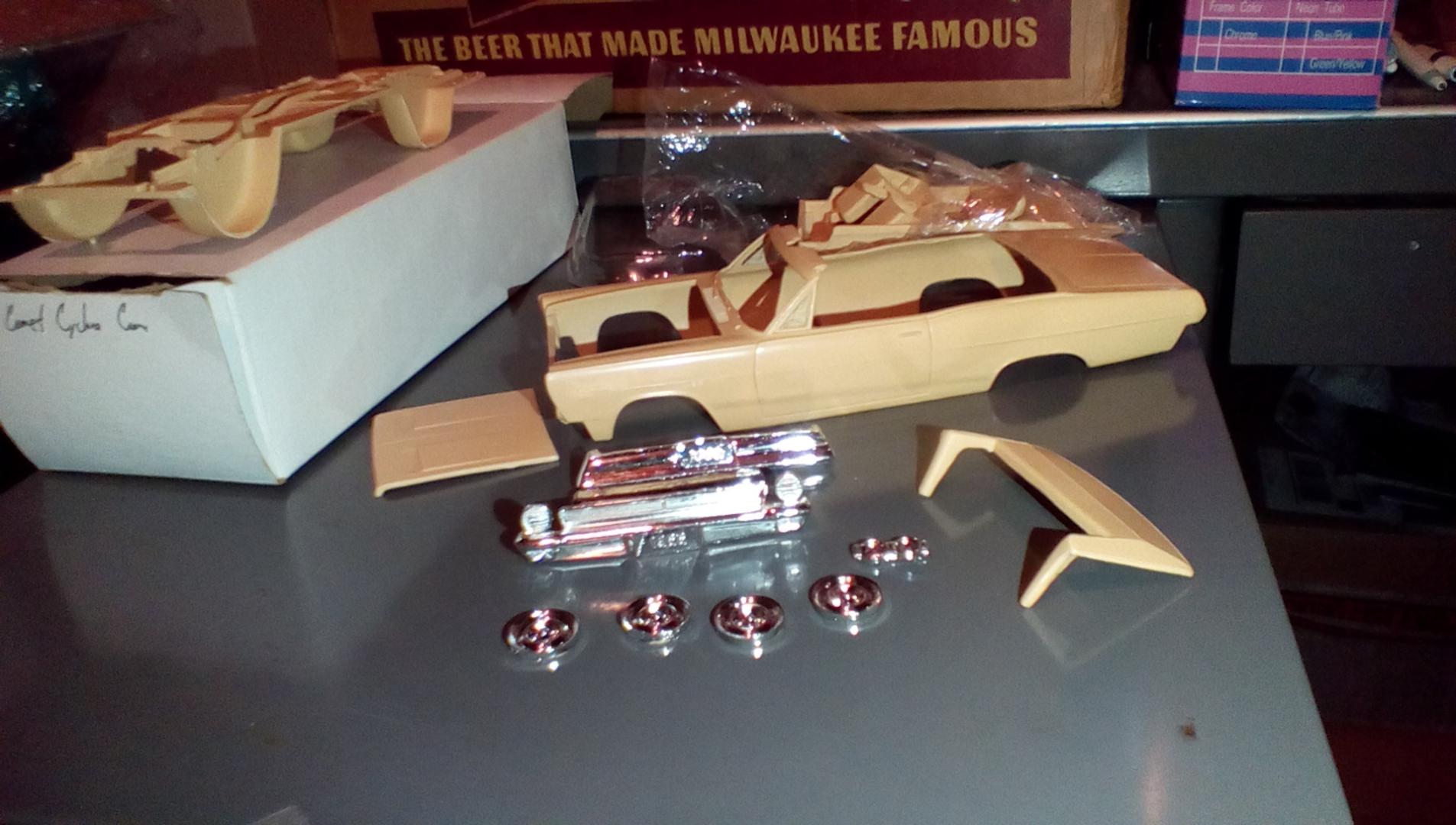 Looks odd because the lower headlights and lower grill section are cast with the front bumper. Upper headlights are cast separately (sitting to the right in my pic, above the wheels), as is the upper grille (hidden behind the front bumper in my lousy pic). Rear bumper is also upside down in my photo, which probably makes that look weird, too. My first impression was that it was a straight repop of a '66 annual, but my little bit of research isn't showing that a convertible annual was ever available. So seems like the master must have been converted from a hardtop annual. Has everything necessary for a build except wheel backs, tires, and engine.