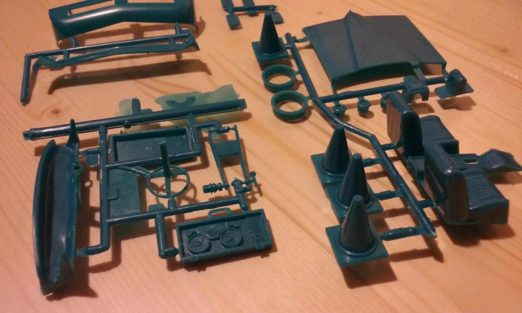 Some more of the standard issue: 1st pic shows some details of the reel-to-reel recorder in the briefcase, and the road cones Bottom right in the 2nd pic you can see the stock 2-spoke steering wheel that was also nearly snapped off the steering column. Once again, no breakage, and it feels like I can straighten it out OK, but that's the second time in the same kit. 2 sets of white stripe tires, plus the tire for the 5th wheel. No slicks, as stated before. Note the only clear is the windshield/vent windows/rear window assembly. No other lenses or covers, at least in this version. (and no green tinted glass,as stated before) Last pic shows the "standard" decals. Note that this decal sheet only has a portion of what's included in the Original Art version. This one does not have any of the sponsorship decals or "road test" decals.