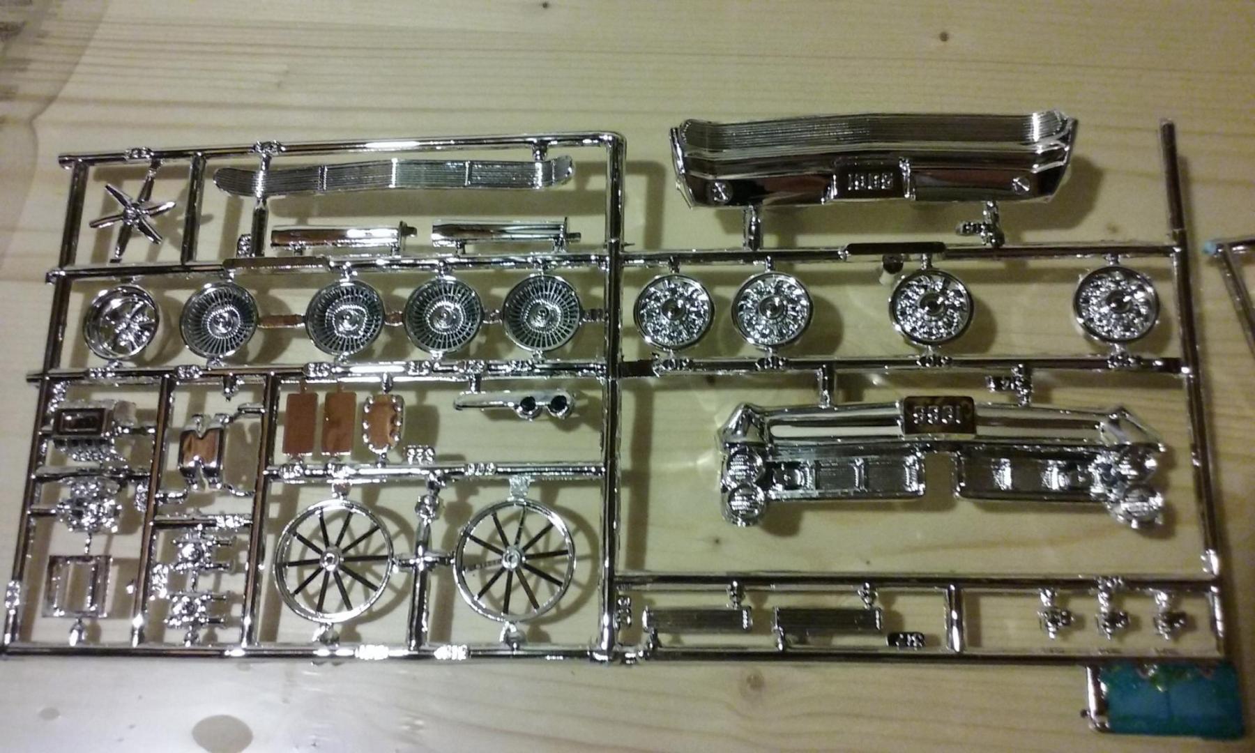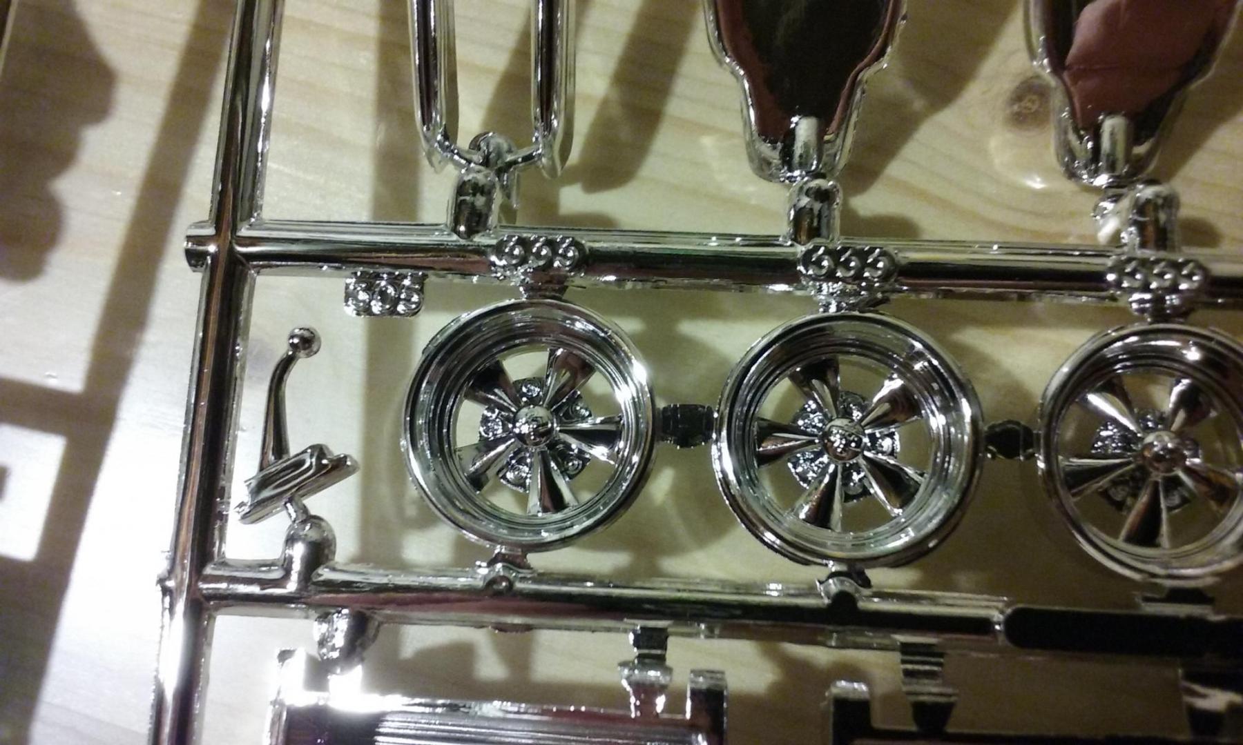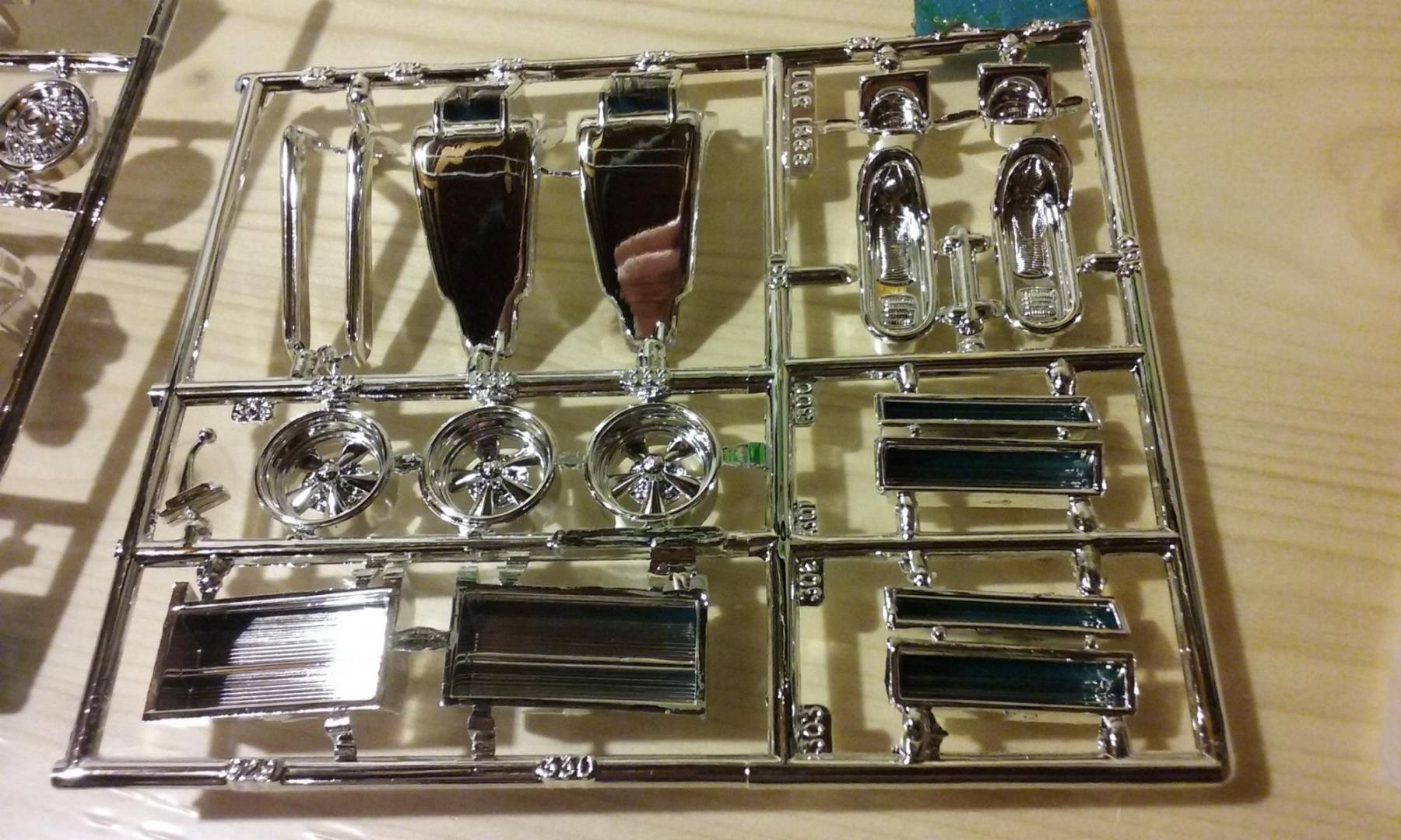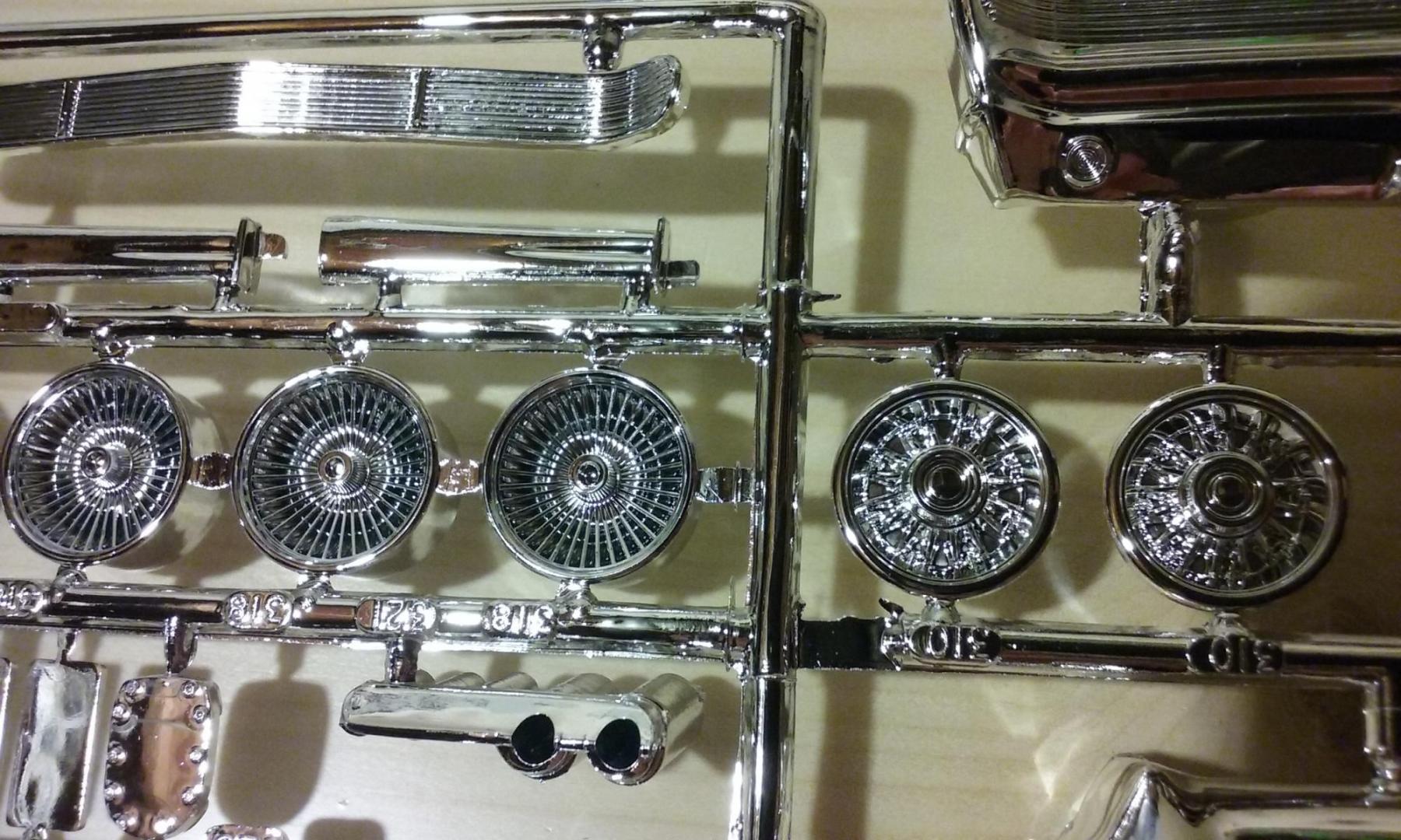 Some close-ups of the chrome trees. Cragars have decent center cap detail (though I still think the '65 Chevelle wagon and El Camino have the best available) FYI: my first reaction to the 8-lug wheels is that the center caps looked quite different from the Moebius '61 Ventura center caps. A quick Google image search showed that the 1:1 caps in '65 were a different design than in '61, and IMO these look pretty accurate. The instructions describe the 3rd set of wheels as Corvette wheels, not sure about those center caps... In the last pic I tried to get a better shot of the blower parts and the Weber side-draft carbs.