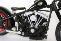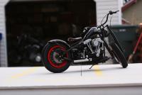 Here are some photos of my Custom Bobber. The organ donor bike was a Tamiya 1/6 scale FLH. Scratch built items include the rear frame from the gas tank all the way back to the axle plates; the seat, the air cleaner, license plate and tail light bracket, fender braces, and the oil tank. Many parts were altered or repurposed from a second kit. These include the gas tank, turn signals, tail light, head light, kick starter,and exhaust pipes.