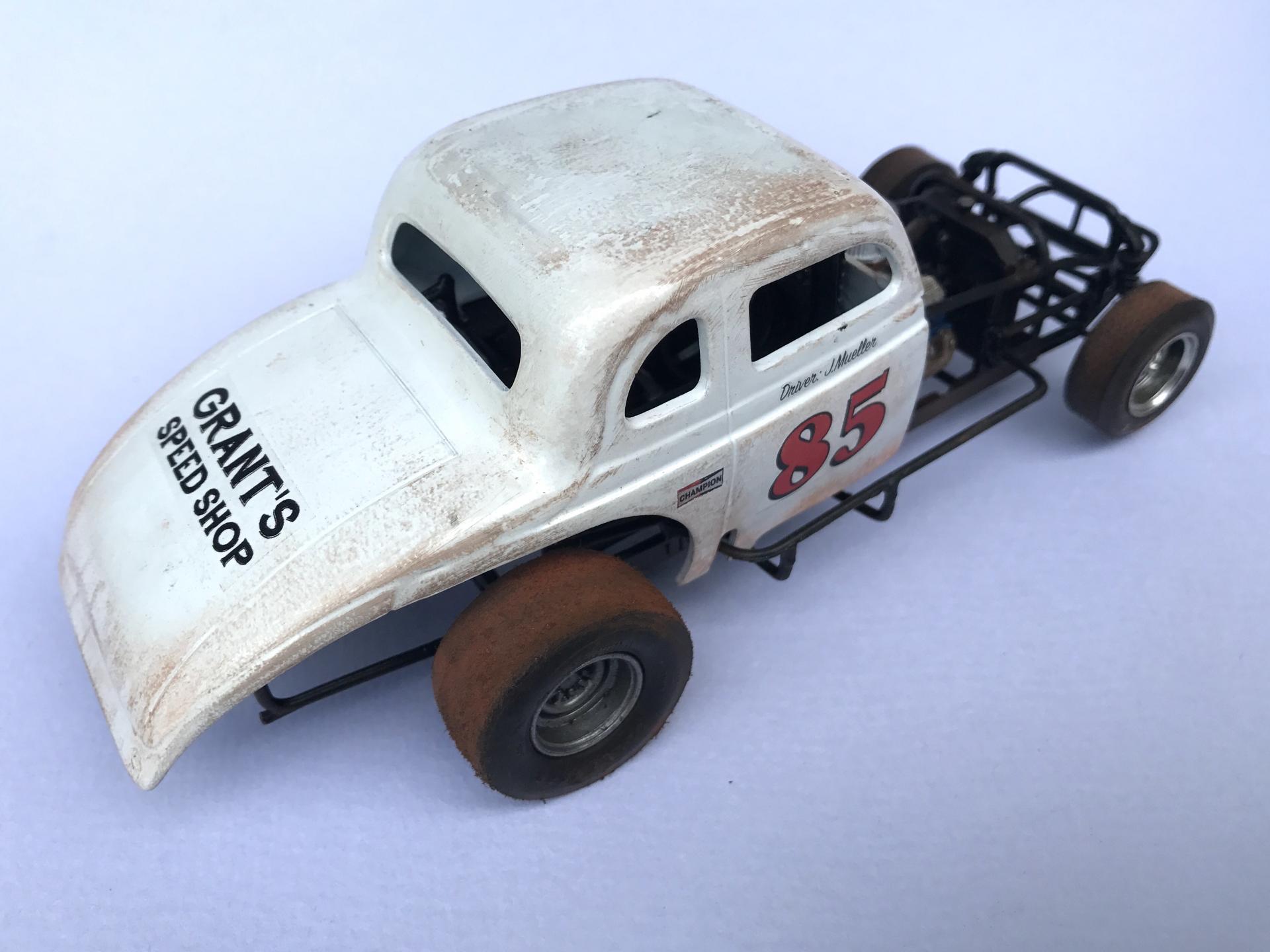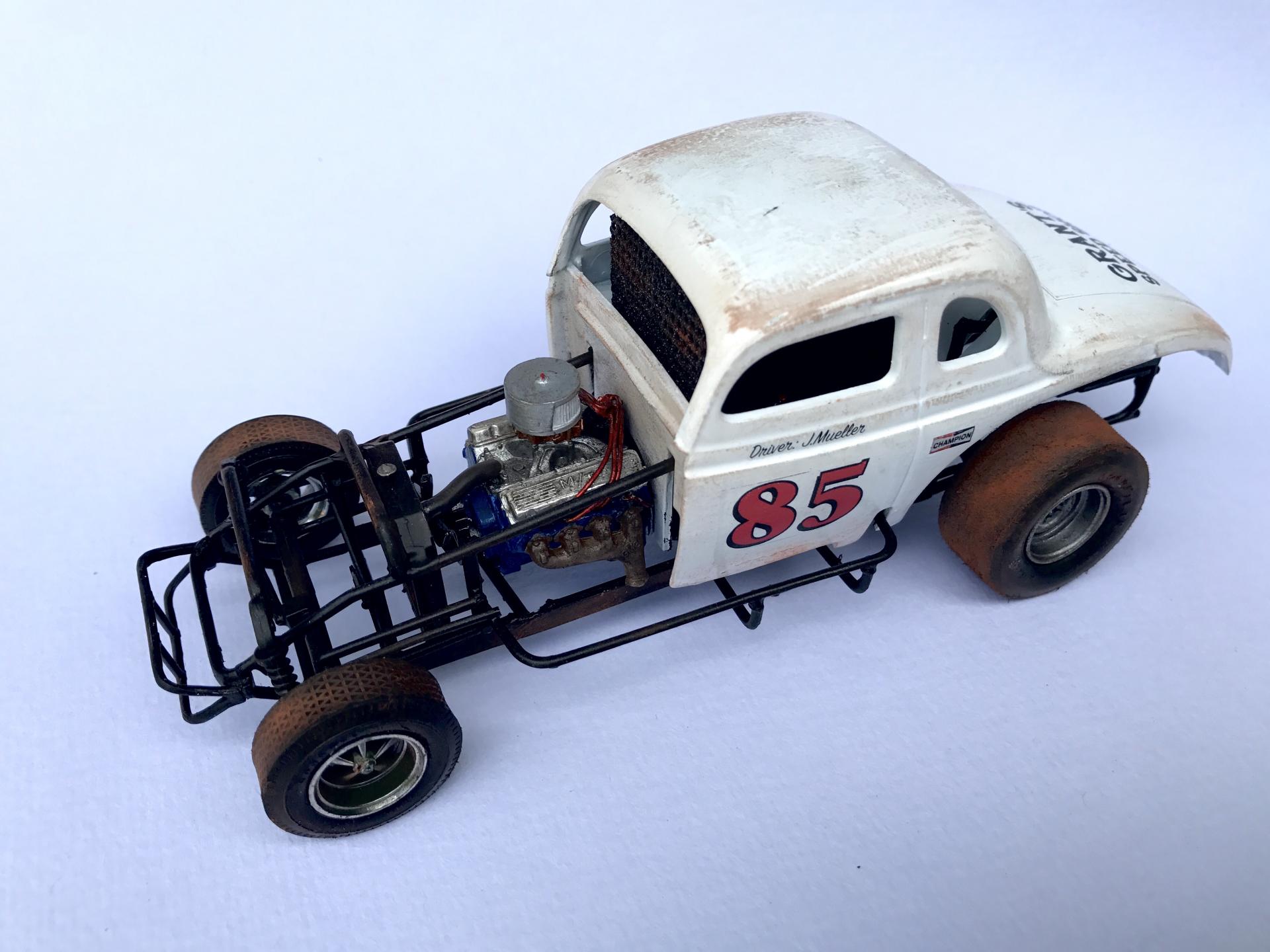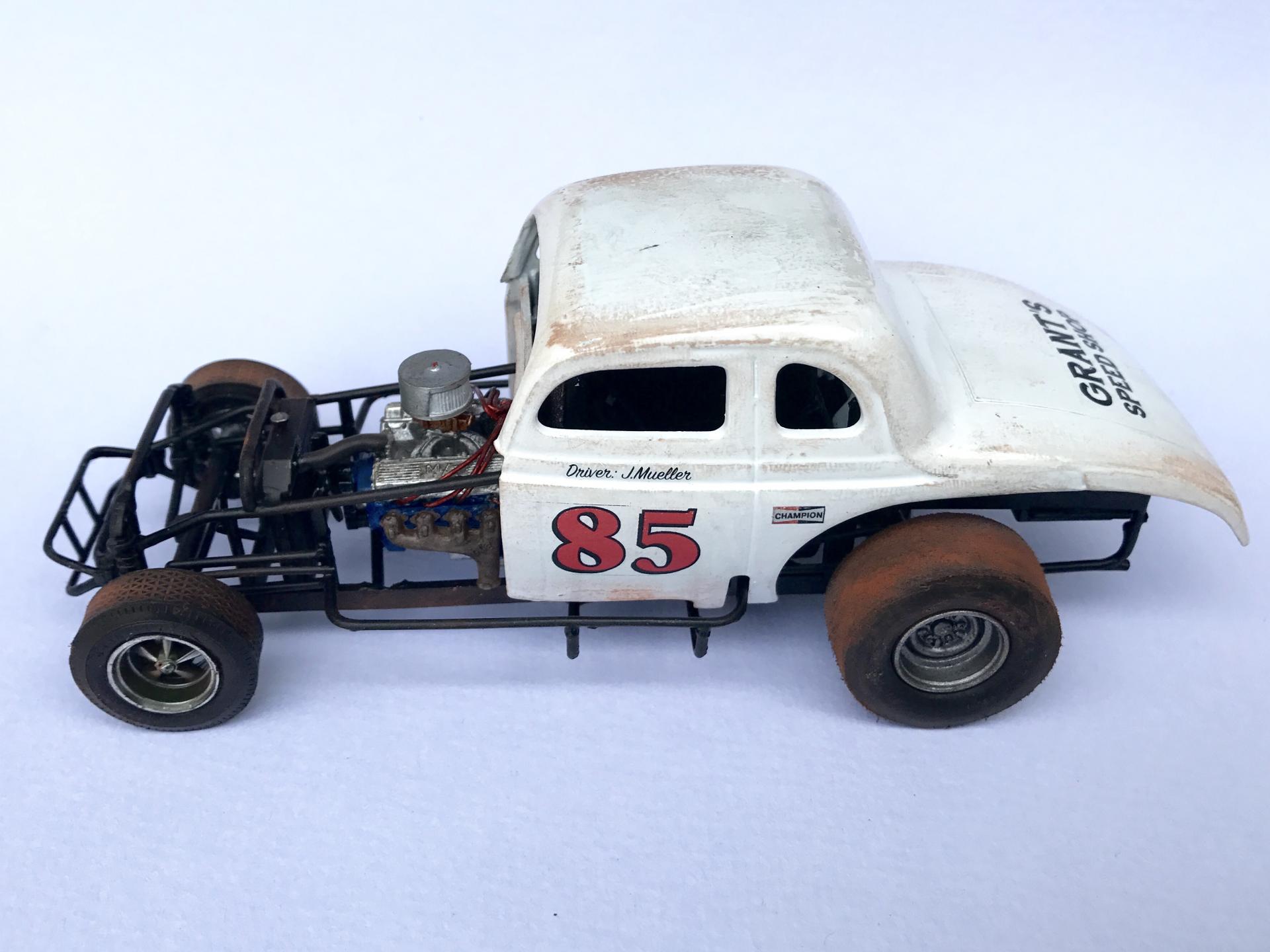 Purchased as a semi-complete model for $10 AUS at a market in a ziplock bag marked 'early Chevy'. Got it home and with a little research, found it was an AMT 36 Plymouth Early Modified. The previous modeller had used superglue on most parts, however because it was a race car I wasn't to stressed about a polished rebuild. What started out as a 'quick' rebuild ending up including: custom decals, weathering, engine wiring, scratch built front roll cage and grill and custom exhaust manifold (exhaust was missing from kit). A really fun kit to re-build. Constructive criticism welcome and encouraged.